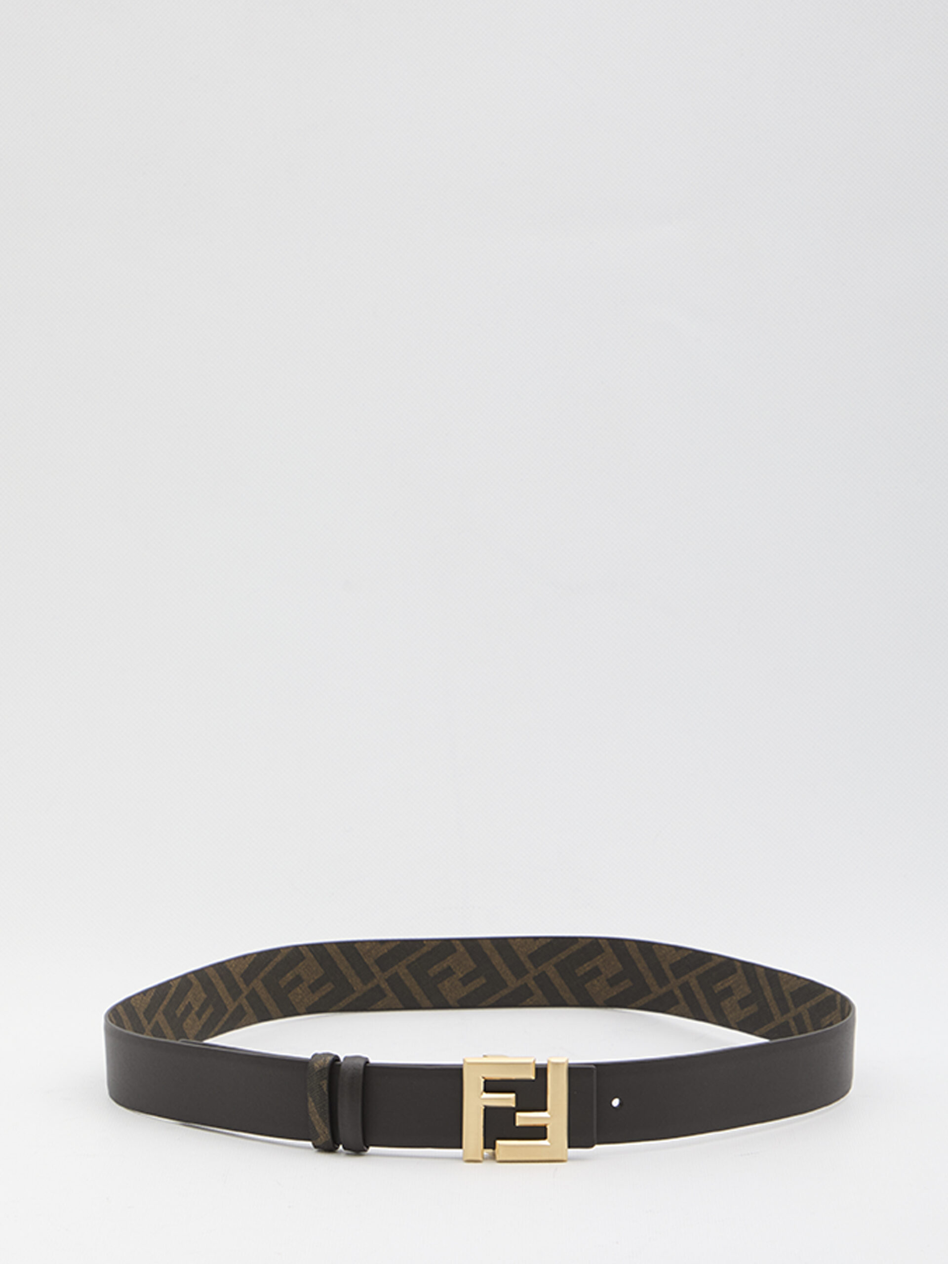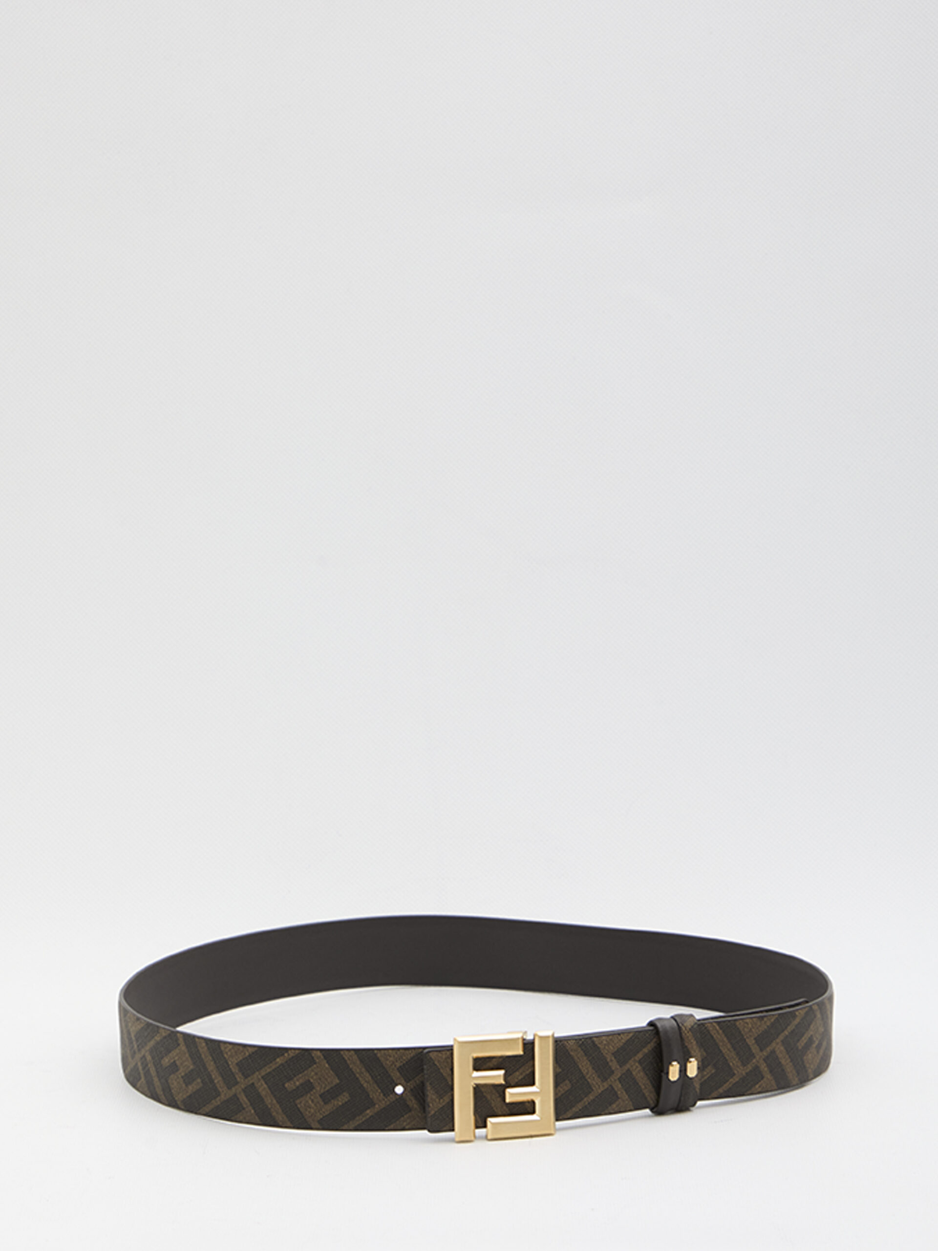 Reversible belt in brown-toned FF jacquard fabric on one side and solid brown leather on the other, featuring an FF metal buckle with a satin gold finish. Dust bag included. Any irregularities in the leather are not to be considered manufacturing defects but characteristics of the material.