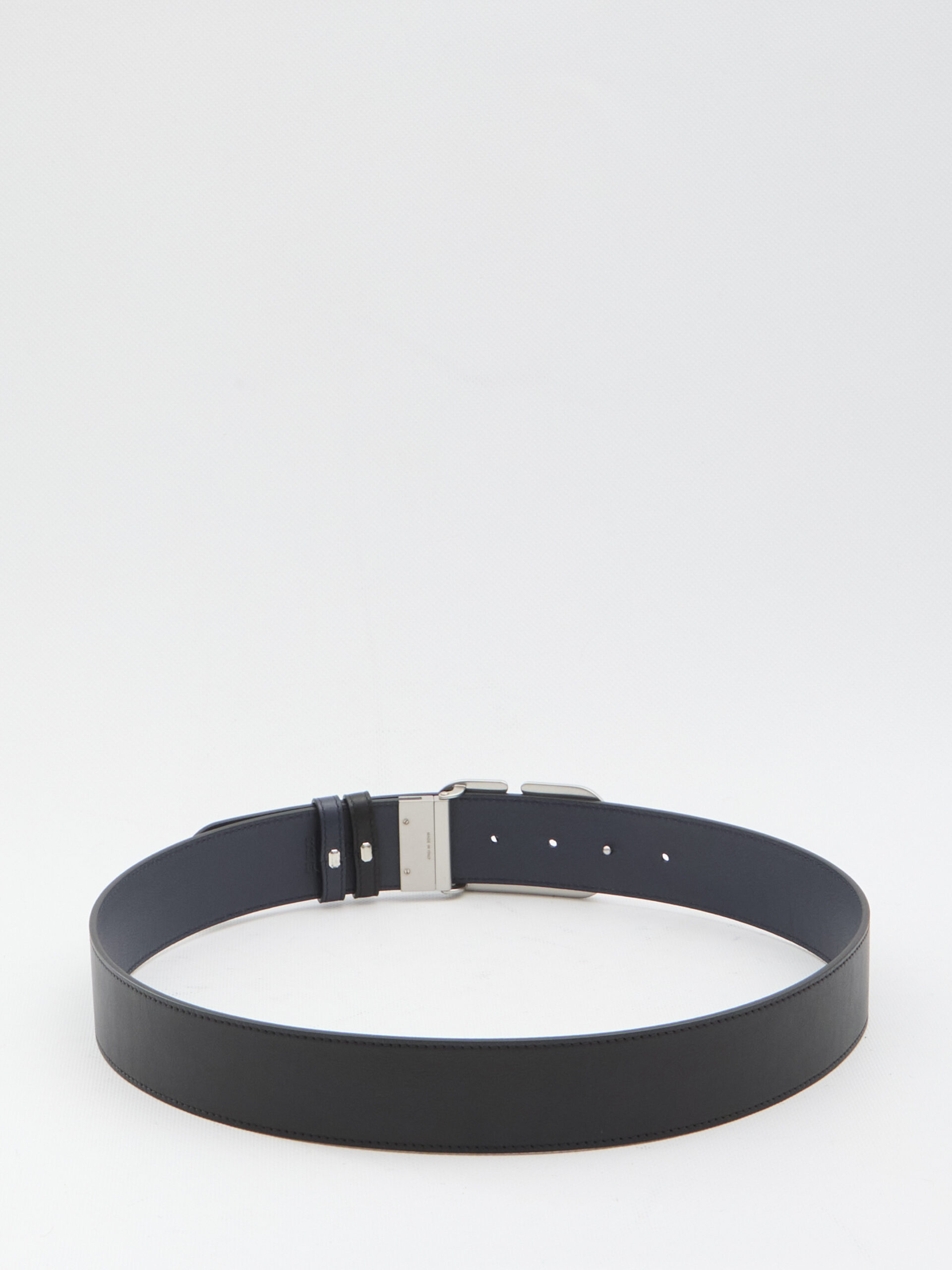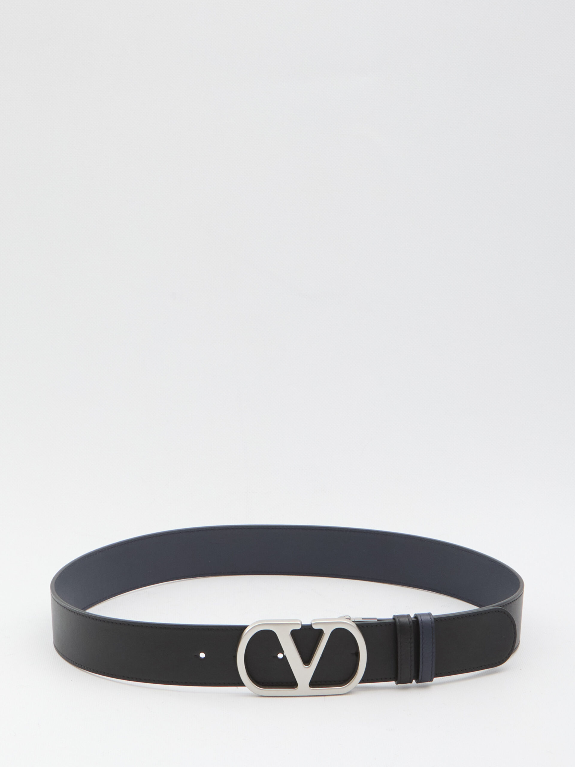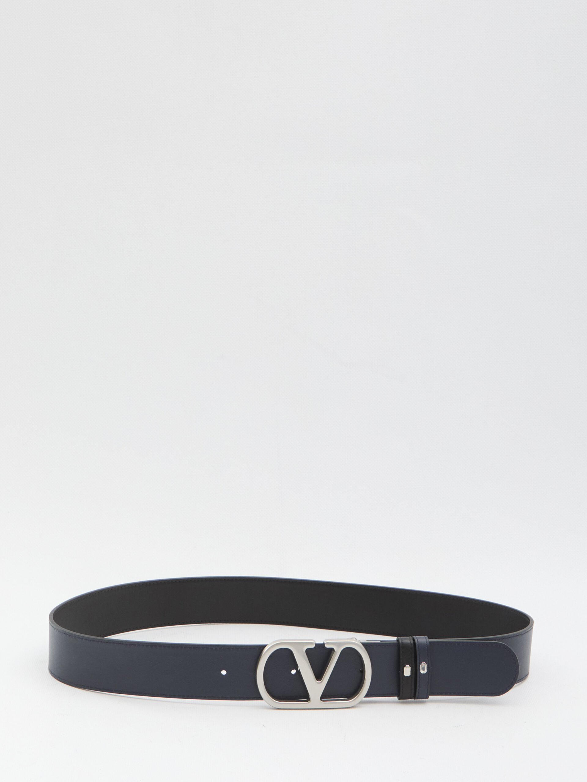 Reversible leather belt in black and blue with silver-tone VLogo Signature buckle. Any irregularities in the leather are not to be considered defects, but rather unique characteristics of the material.