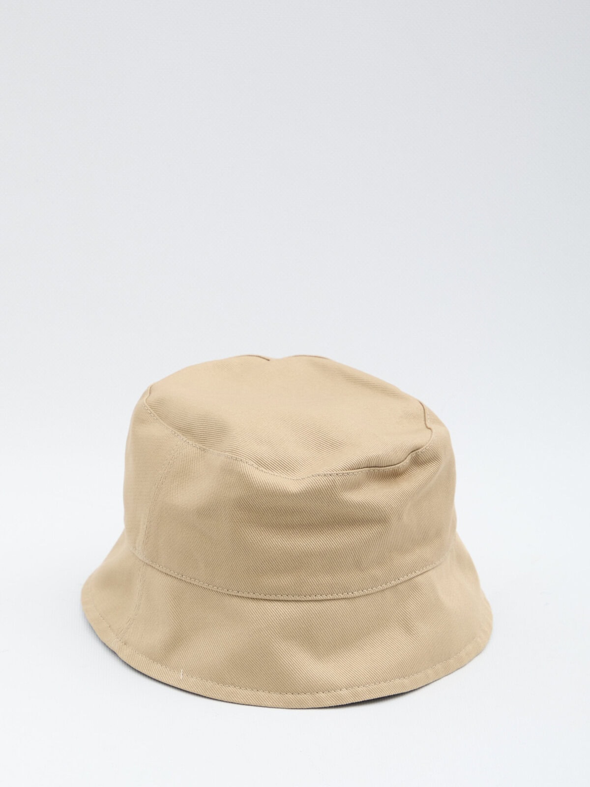 Beige cotton hat. Features a leather logo patch on the front and FF monogram lining.
