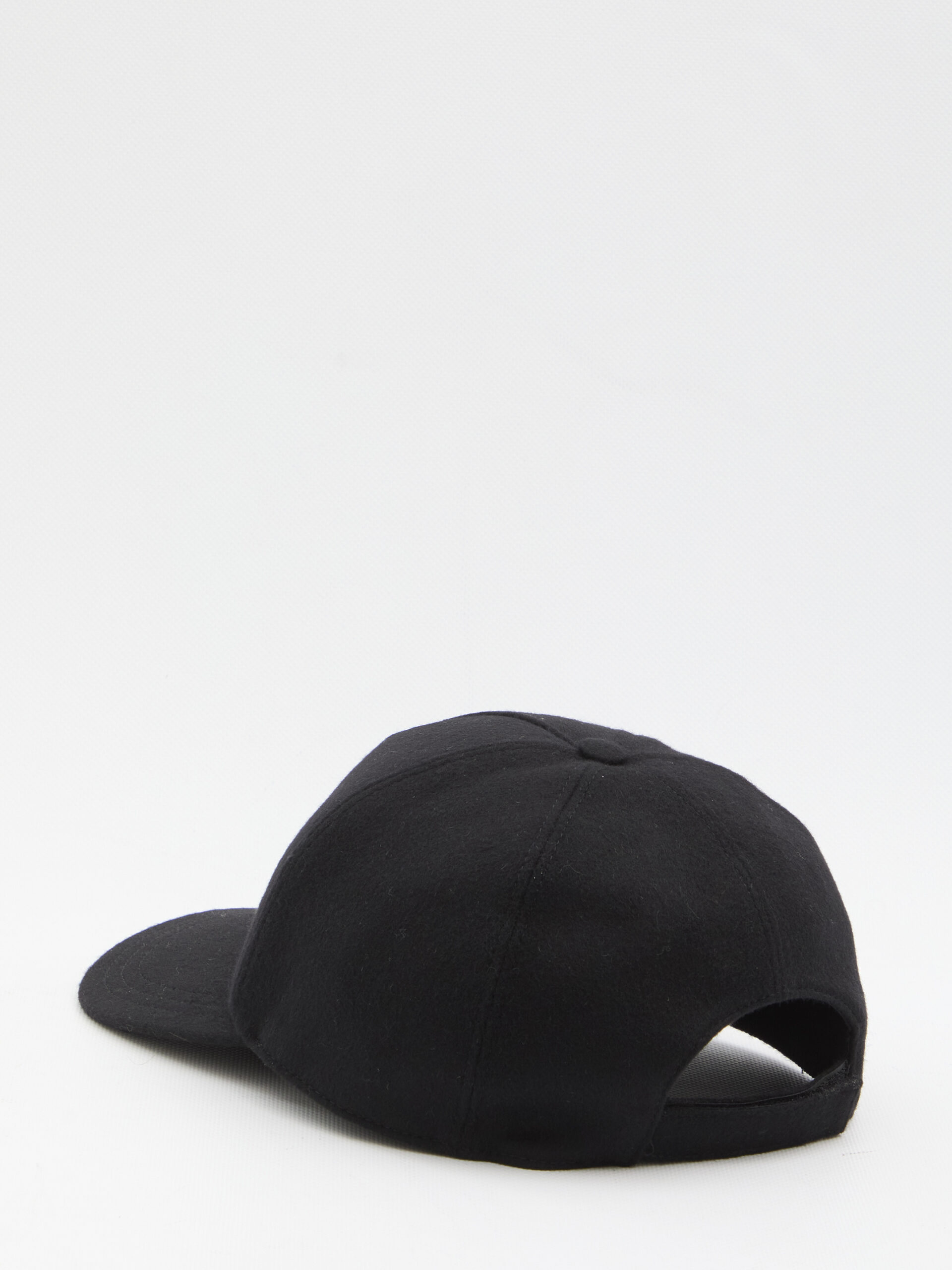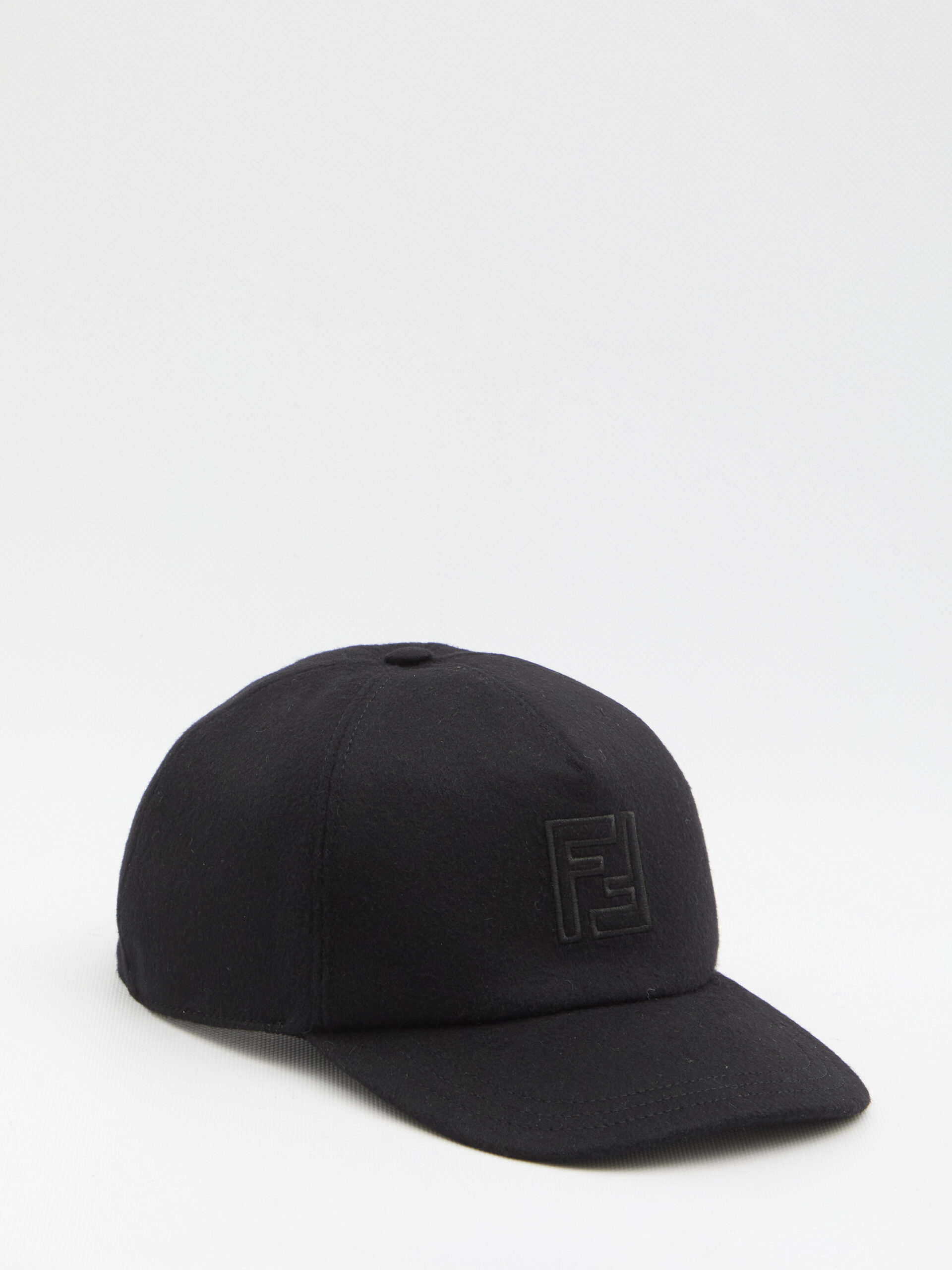 Baseball cap in black wool and cashmere felt. Features semi-rigid visor, FF embroidery detail on the front in black and grey, velcro strap at the back. Cotton lining.