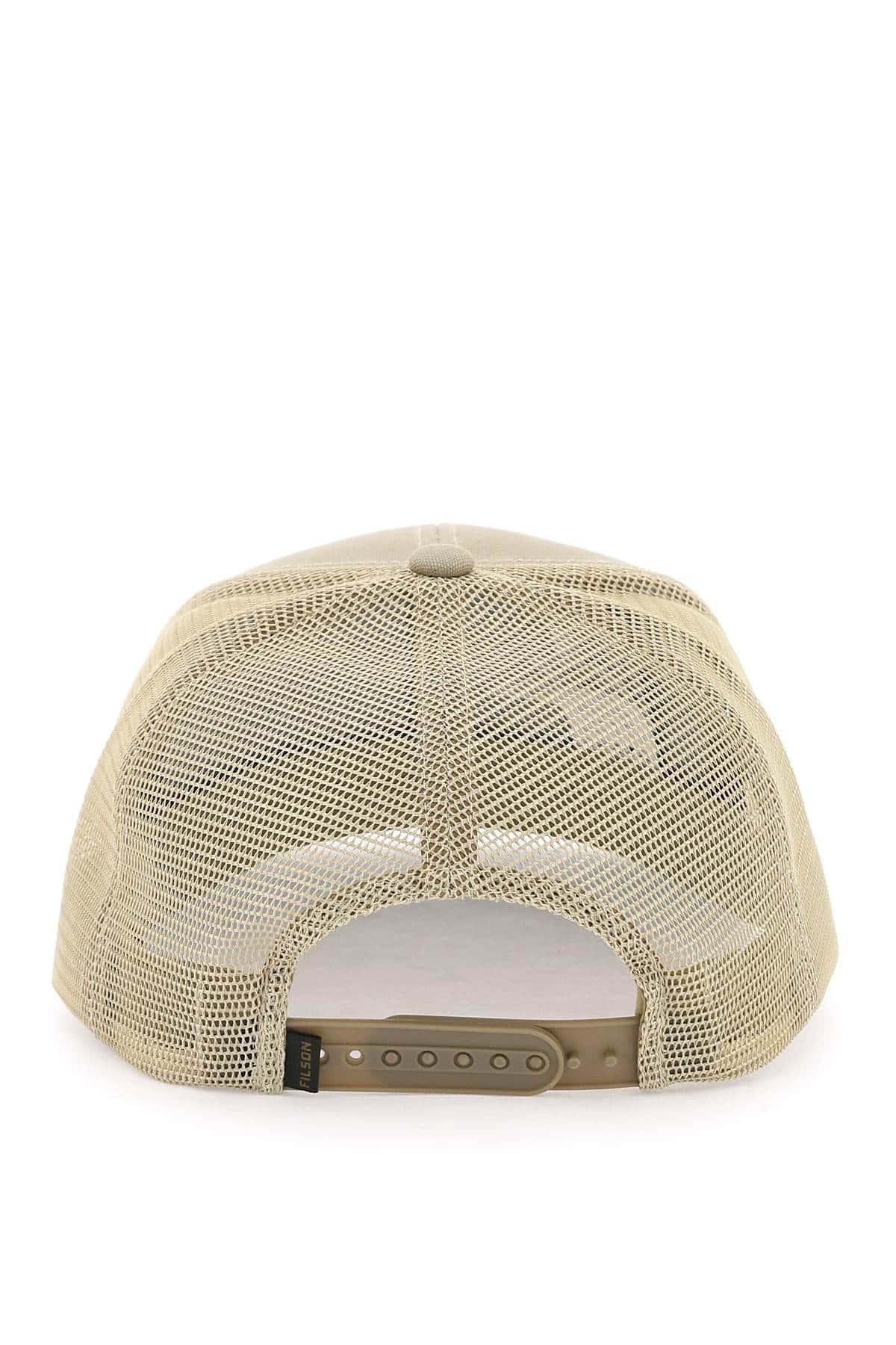 The Filson baseball cap is made of cotton canvas on the front and breathable mesh on the back. The design is completed with a leather logo patch, stitched visor, adjustable strap at the back, and an unlined interior. One size fits all.