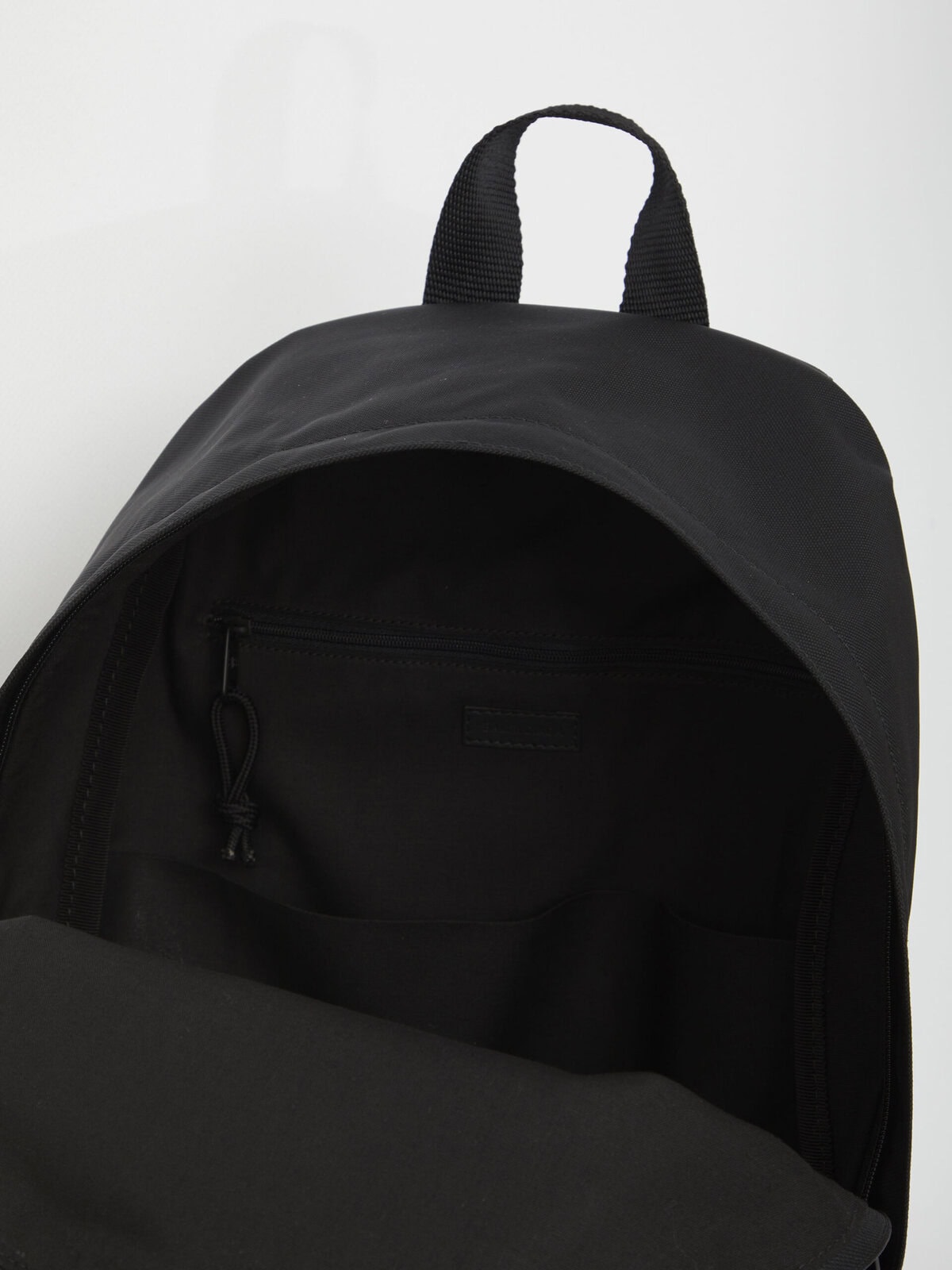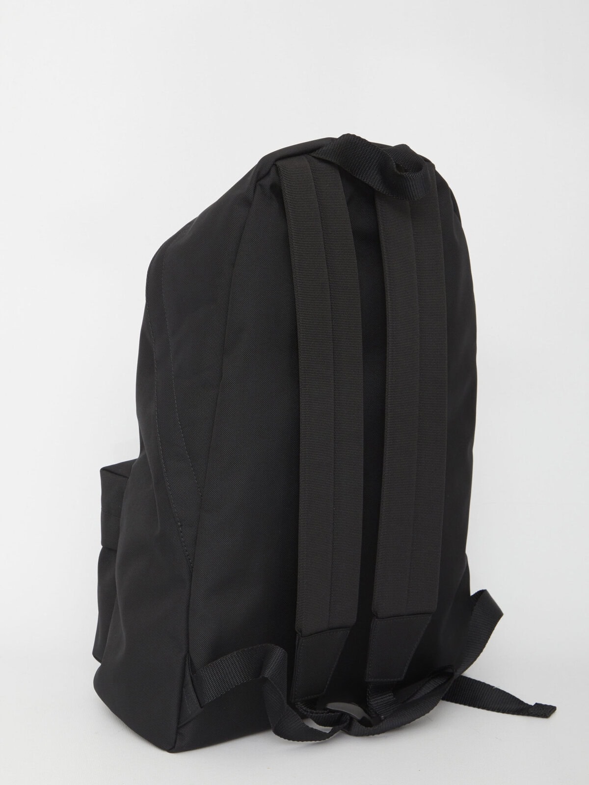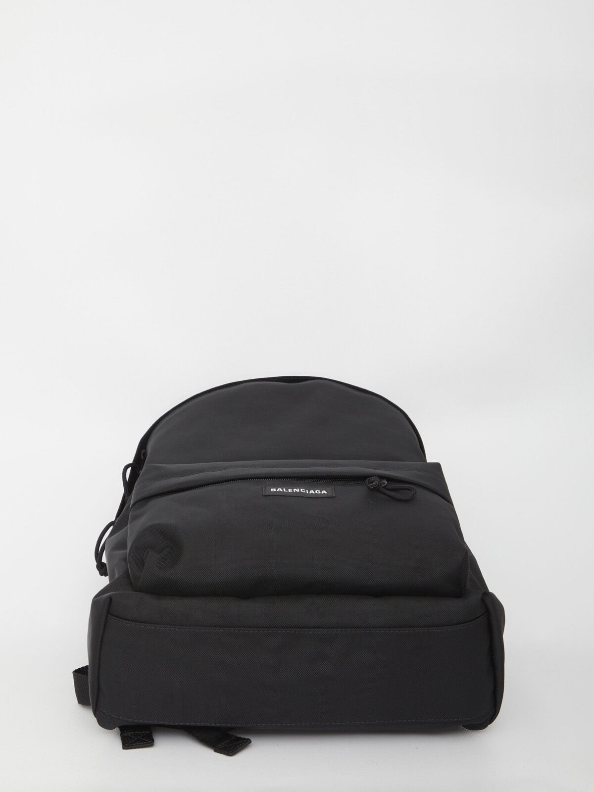 Explorer backpack in black nylon with Balenciaga logo on the front. It features top handle, adjustable shoulder straps, two-way zip closure, one exterior zip pocket on the front and one interior zip pocket.