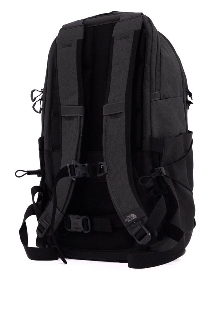 Borealis backpack by The North Face crafted from recycled ripstop nylon with contrasting embroidered lettering logo on front pocket. It features a protected laptop compartment, a storage panel, zippered pockets, two external water bottle holders, including one with quick smartphone access, and an external fleece-lined pocket. Padded back with FlexVent suspension, adjustable shoulder straps.