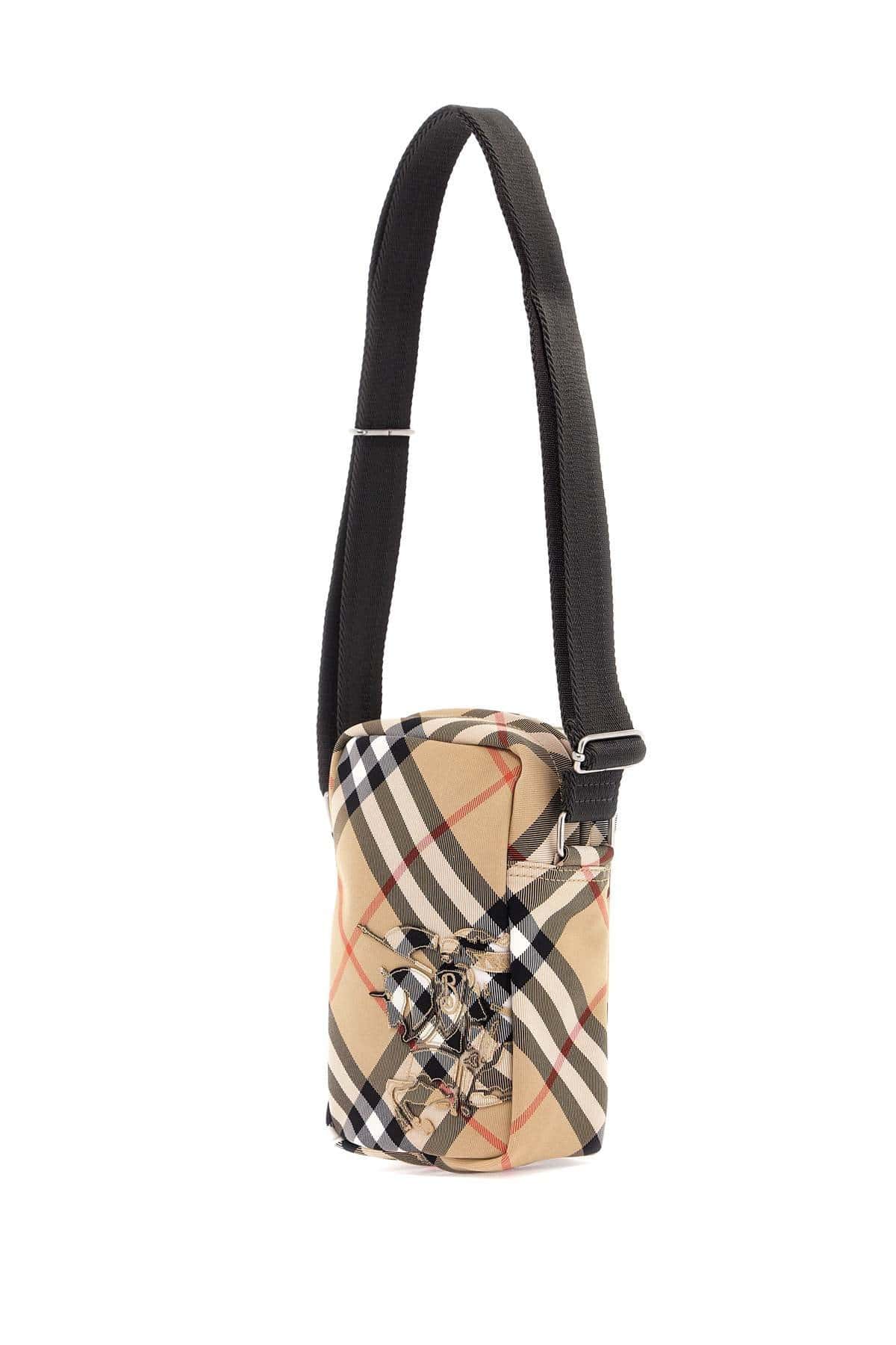 The Burberry phone pouch is made of technical fabric with the iconic Check pattern and Equestrian Knight Design patch on the front. It features a hidden zip closure, Check lining, and an adjustable ribbon shoulder strap. The accessories are in brushed silver metal finish.