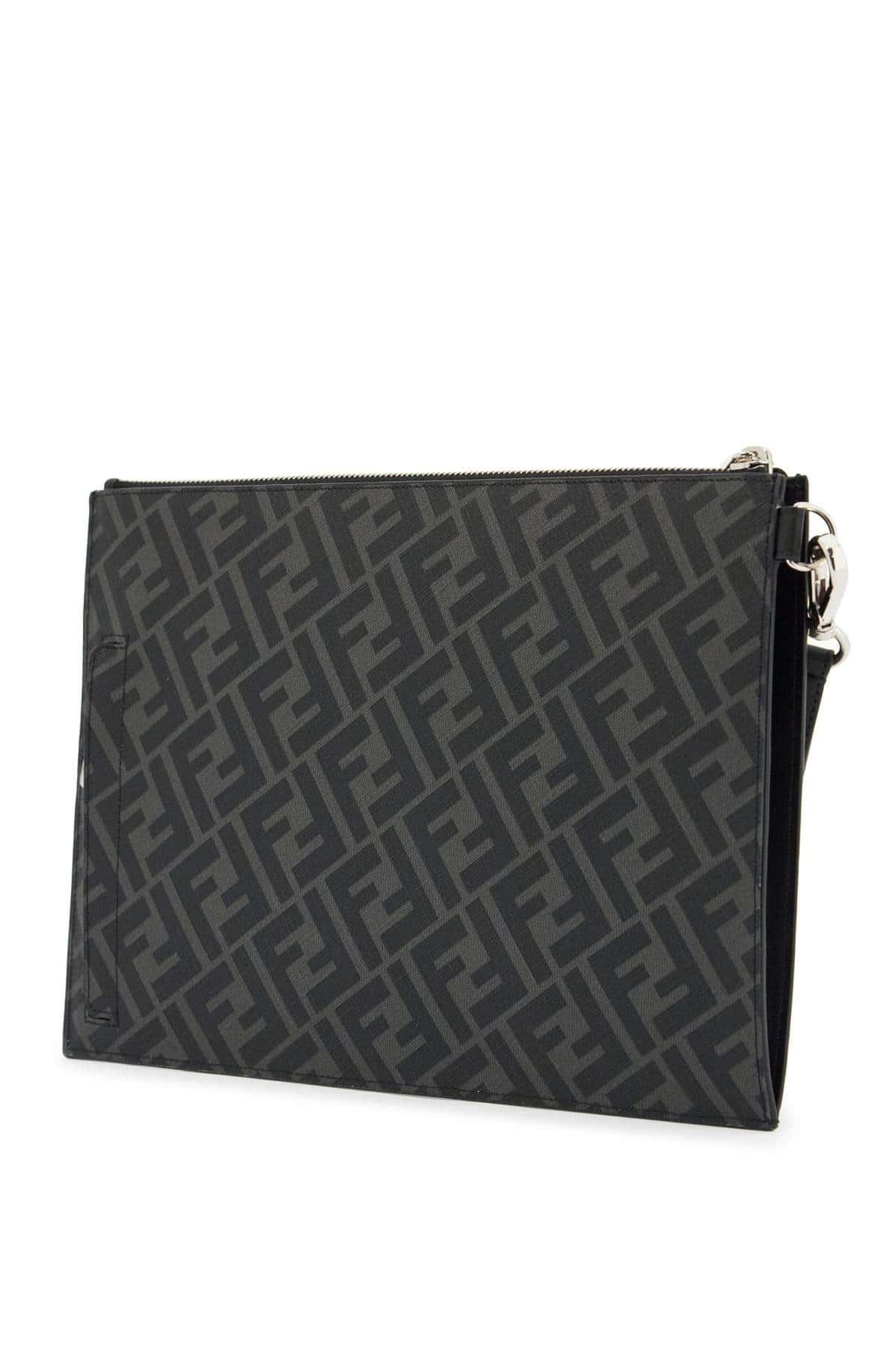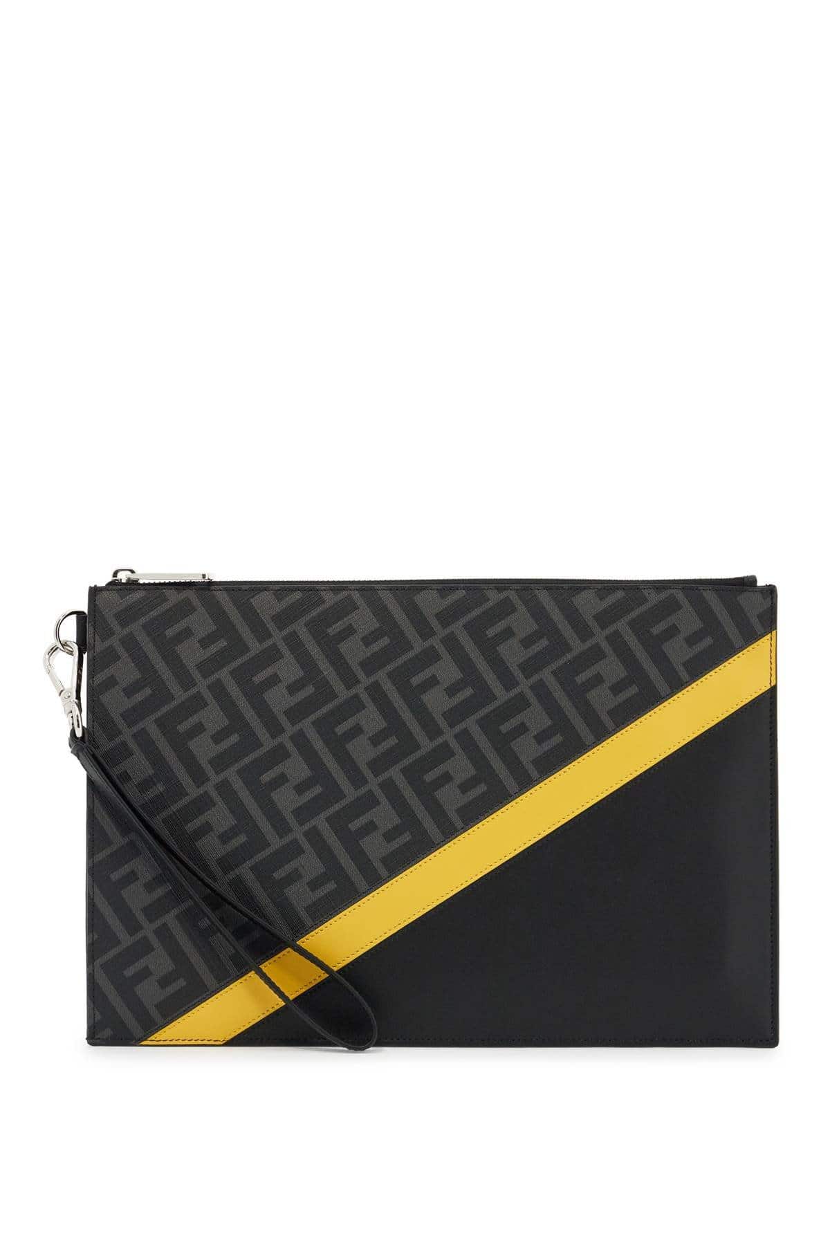 Fendi pouch in coated FF canvas and leather enriched by a contrasting leatherdiagonal inlay on the front. Zip fastening, side gusset, back pocket, detachable wrist handle. Fabric-lined interior with three flat pockets and six leather credit card slots. Palladium-finish metalware.