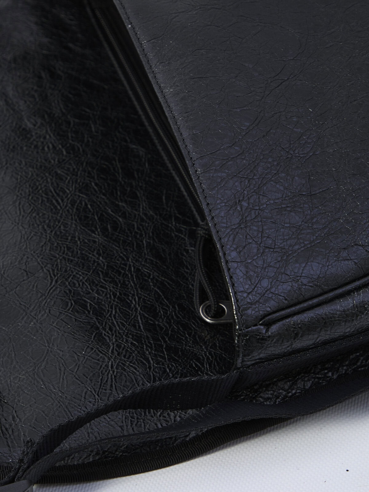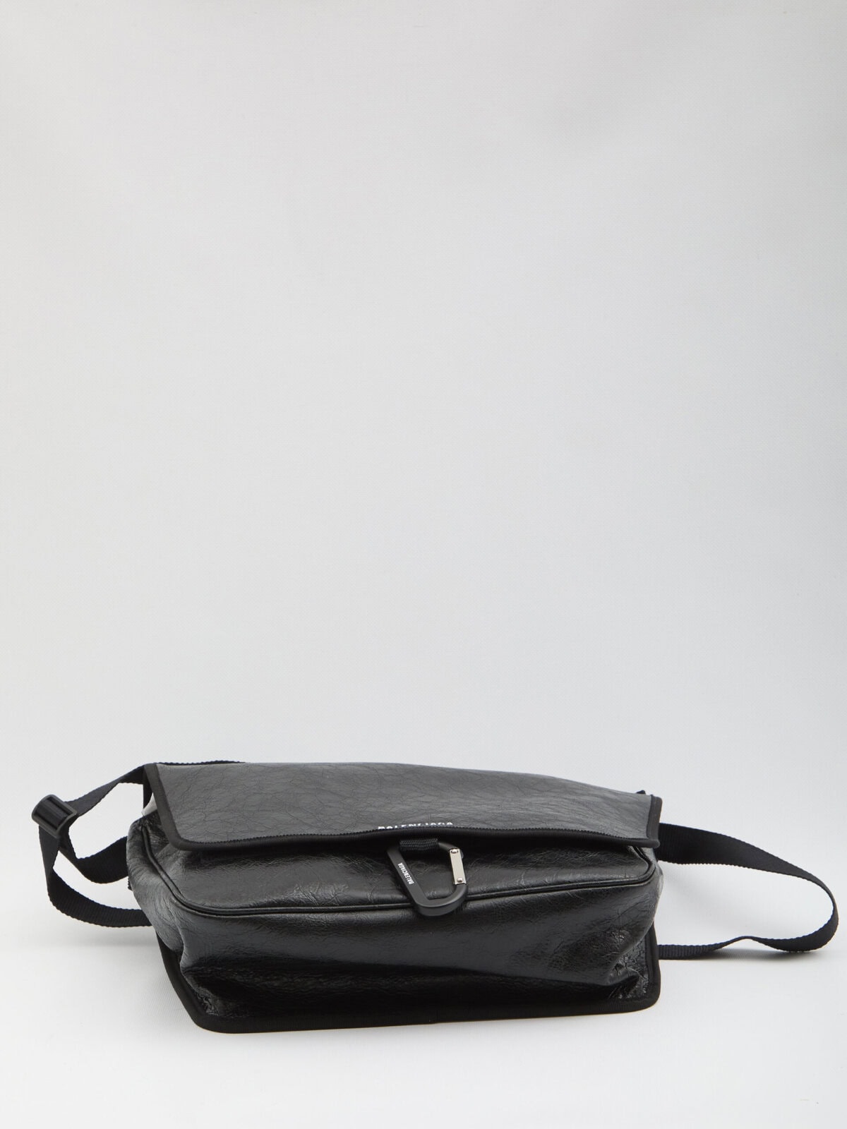 Black grained lambskin leather bag featuring an adjustable fabric shoulder strap, embossed Balenciaga logo on the front, matte black Balenciaga-branded carabiner, Velcro closure, main compartment with internal zip pocket, and fabric trim. Fabric lining. Dustbag included. Any leather imperfections are not manufacturing defects but a characteristic of the material.