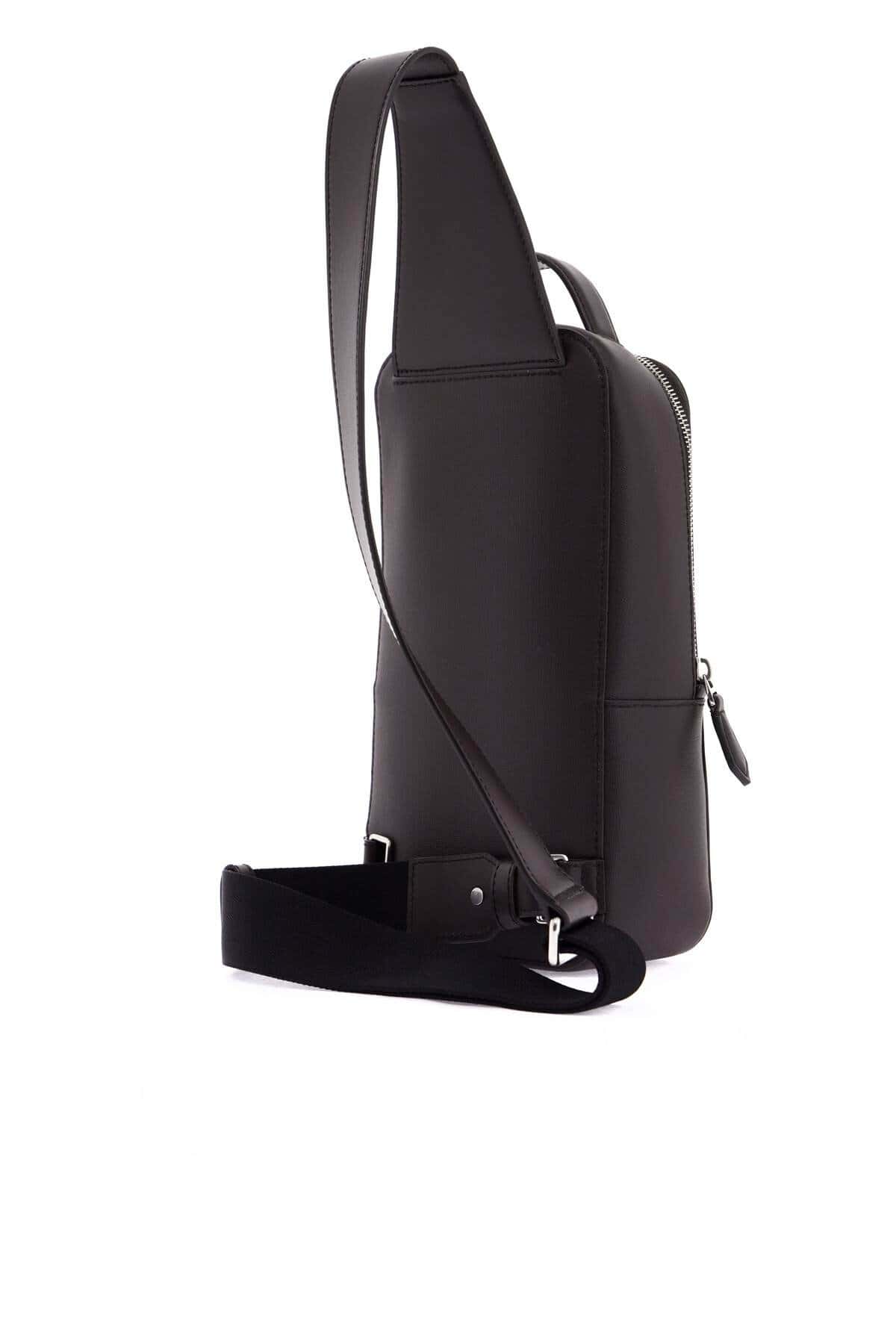 The Mythos sling bag by Bally is made of embossed leather with an anti-scratch coating and features the iconic Bally Ribbon inlaid element at the center. It has a top handle, zip closure, and a lined interior with two credit card slots and an open pocket. The adjustable shoulder strap adds versatility to this stylish piece. Finished with silver-tone metal hardware.