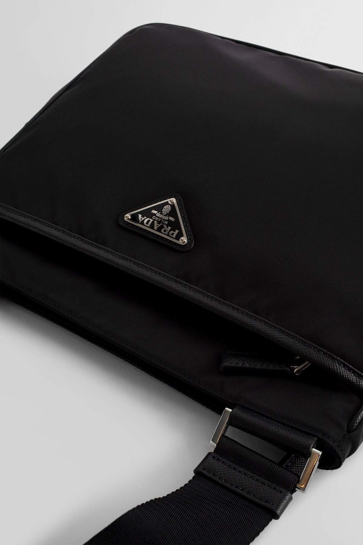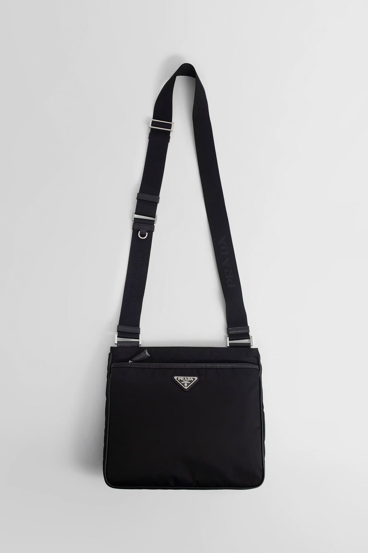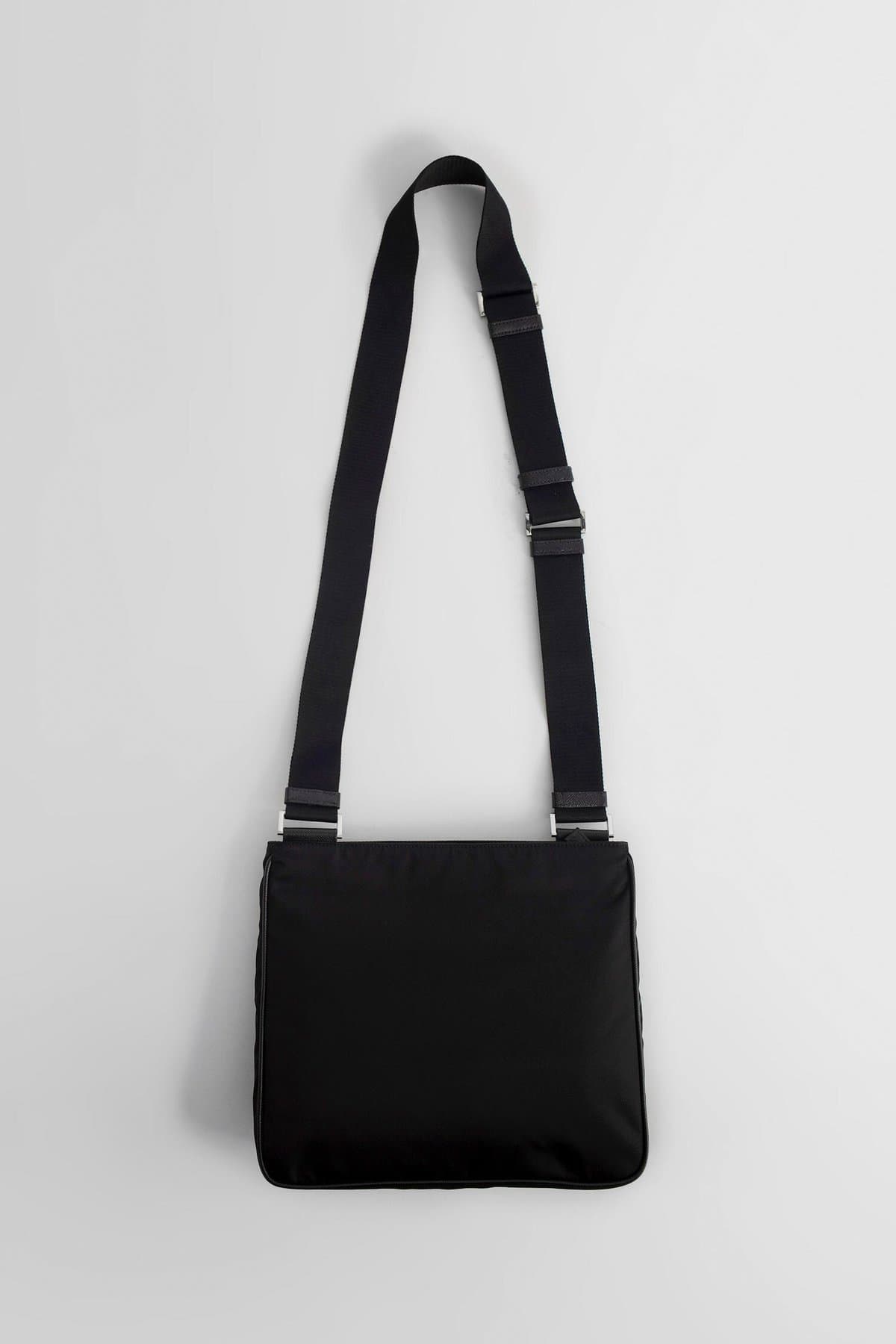 Nero Nylon and saffiano leather Front enamelled metal triangle logo Zip closure Front zipped pocket Adjustable shoulder strap with d-ring