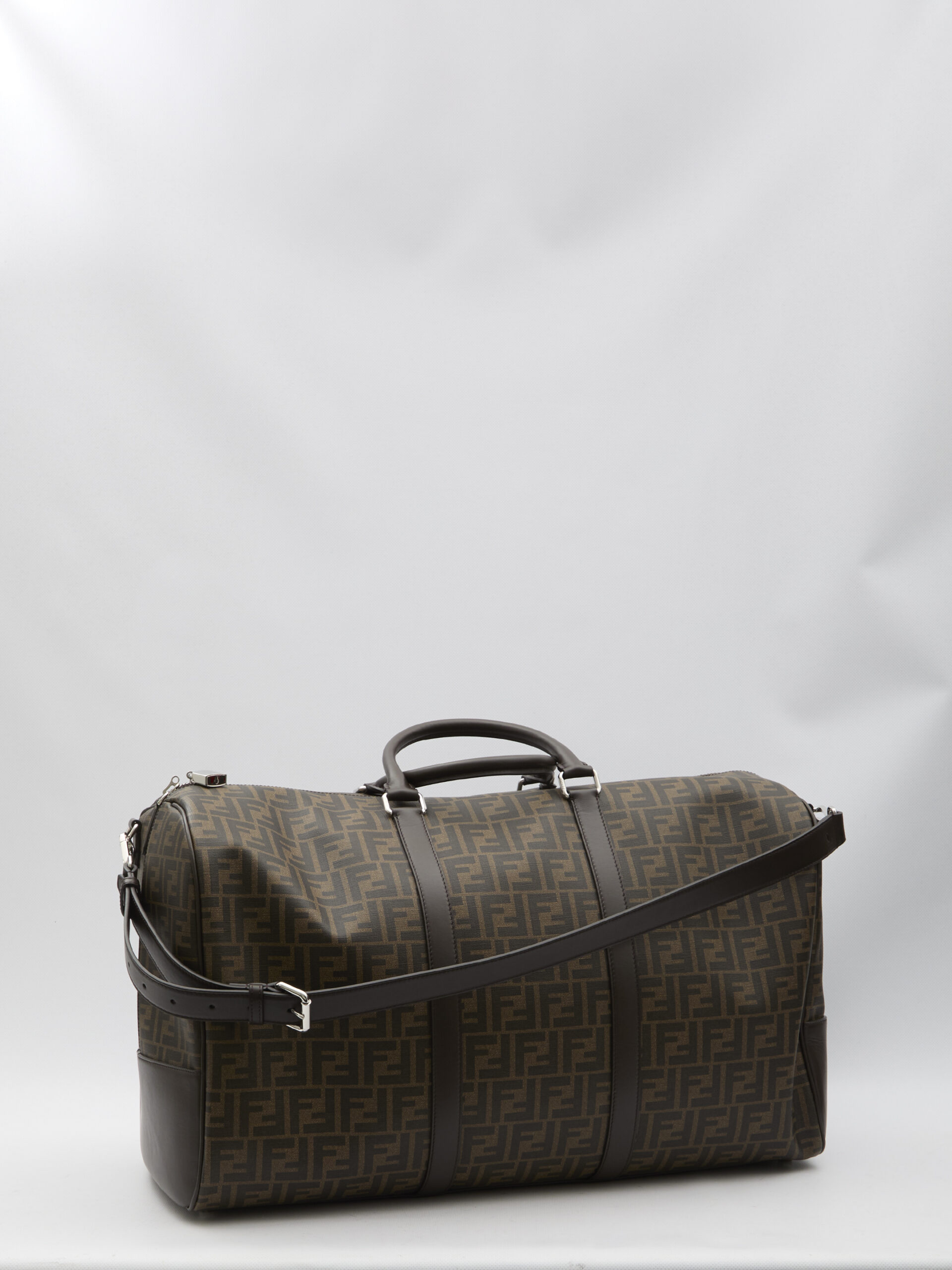 Large duffle in brown FF fabric with brown leather trims. It features fixed double handles, adjustable and detachable shoulder strap, two-way zip closure, one main interior compartment and four interior flat pockets, padlock detail.