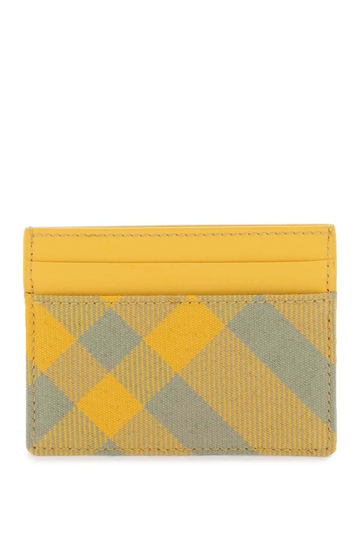 Burberry cardholder featuring wool-blend iconic Check motif and smooth leather trims. Four credit card slots and one slit compartment.