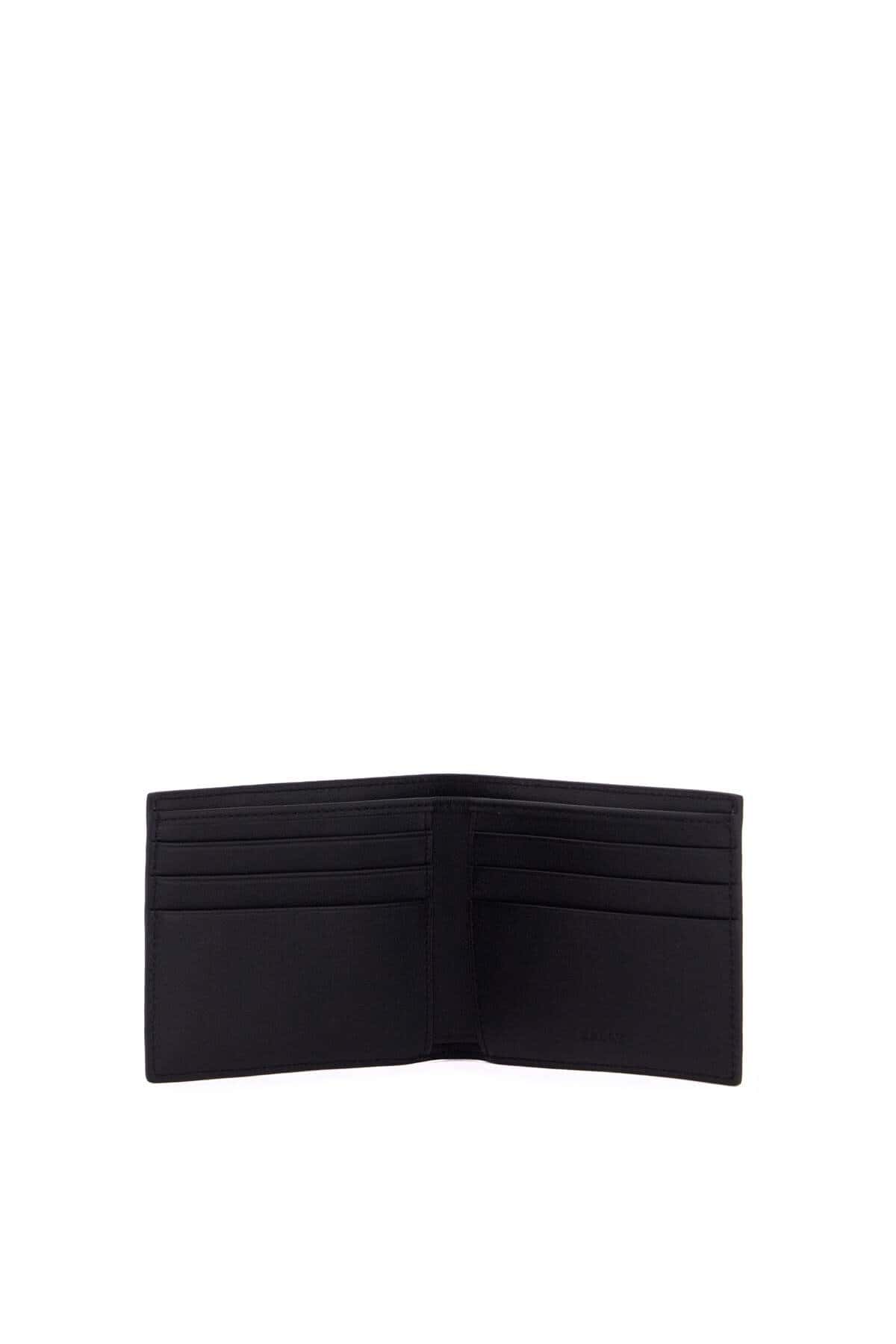 This Bally bi-fold wallet is made of embossed leather with a central inlaid Bally Ribbon and a small silver lettering logo. It features a compartment for bills, two slip pockets, and six credit card slots.