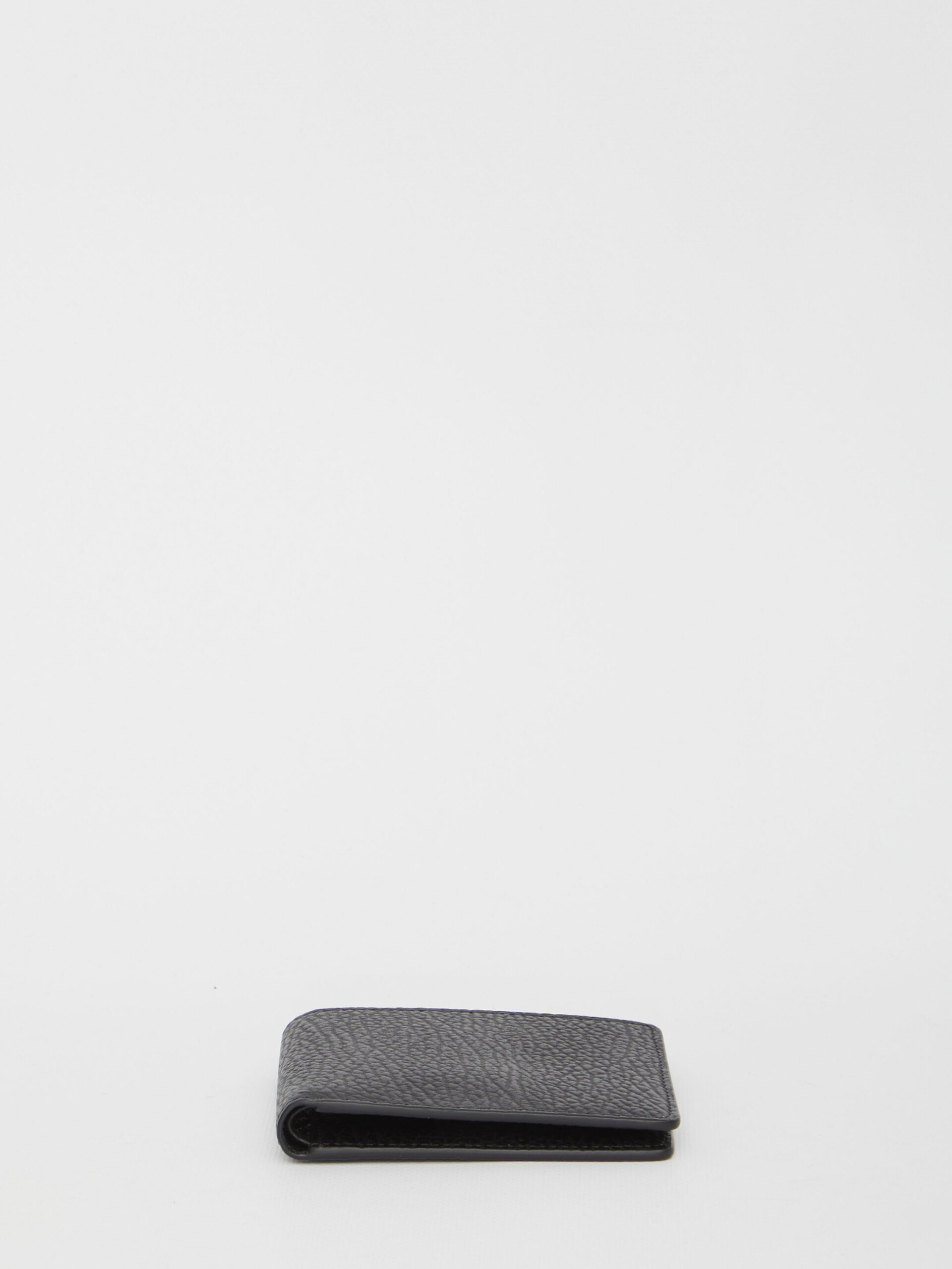 Bi-fold wallet in black grained leather with four seams detailing at the back and embossed numerical logo on the inside. It features two bill compartments, eight card slots and two additional slip pockets. Dust bag included. Any leather imperfections are not to be considered manufacturing defects, but a peculiarity of the material.