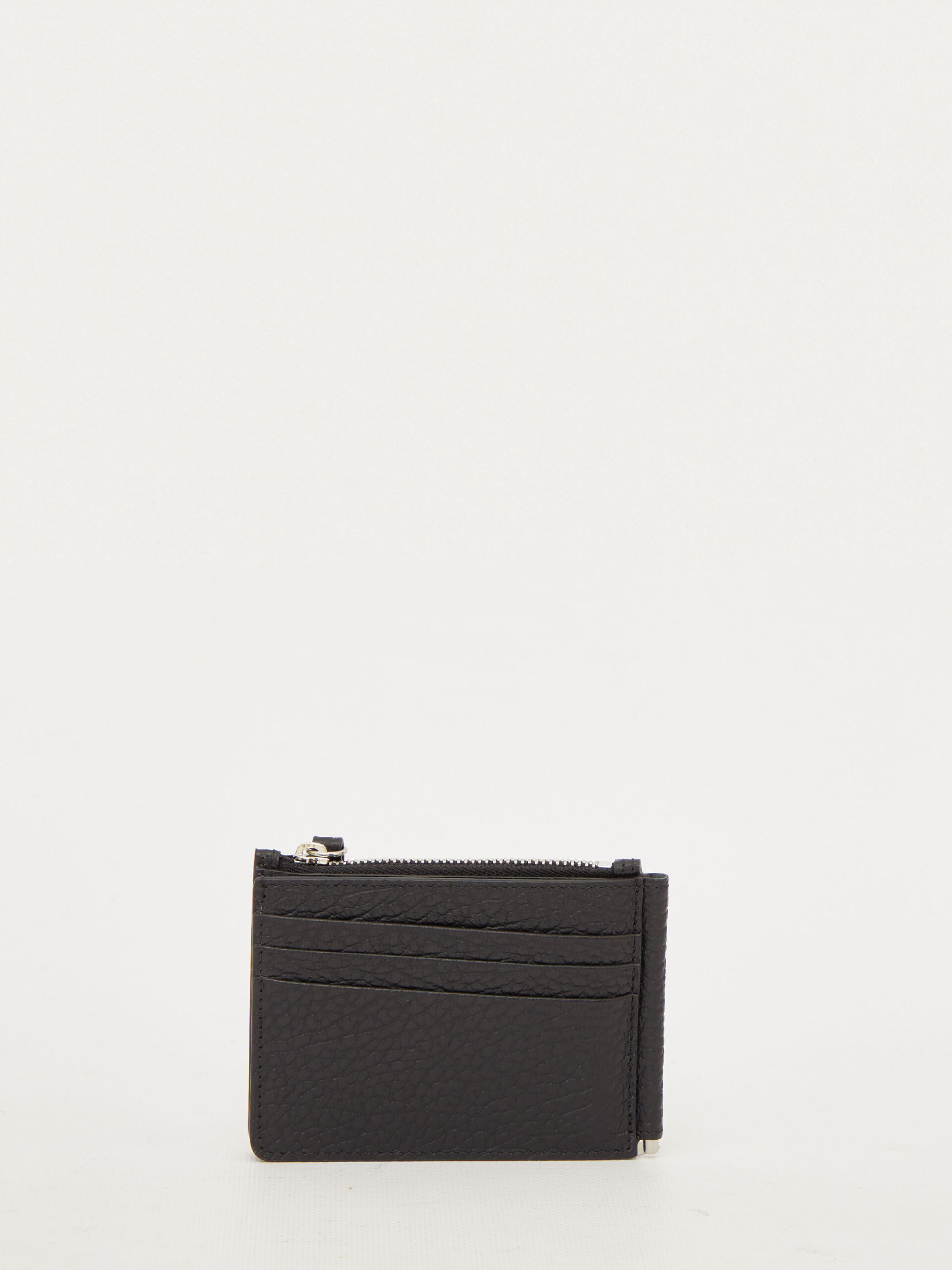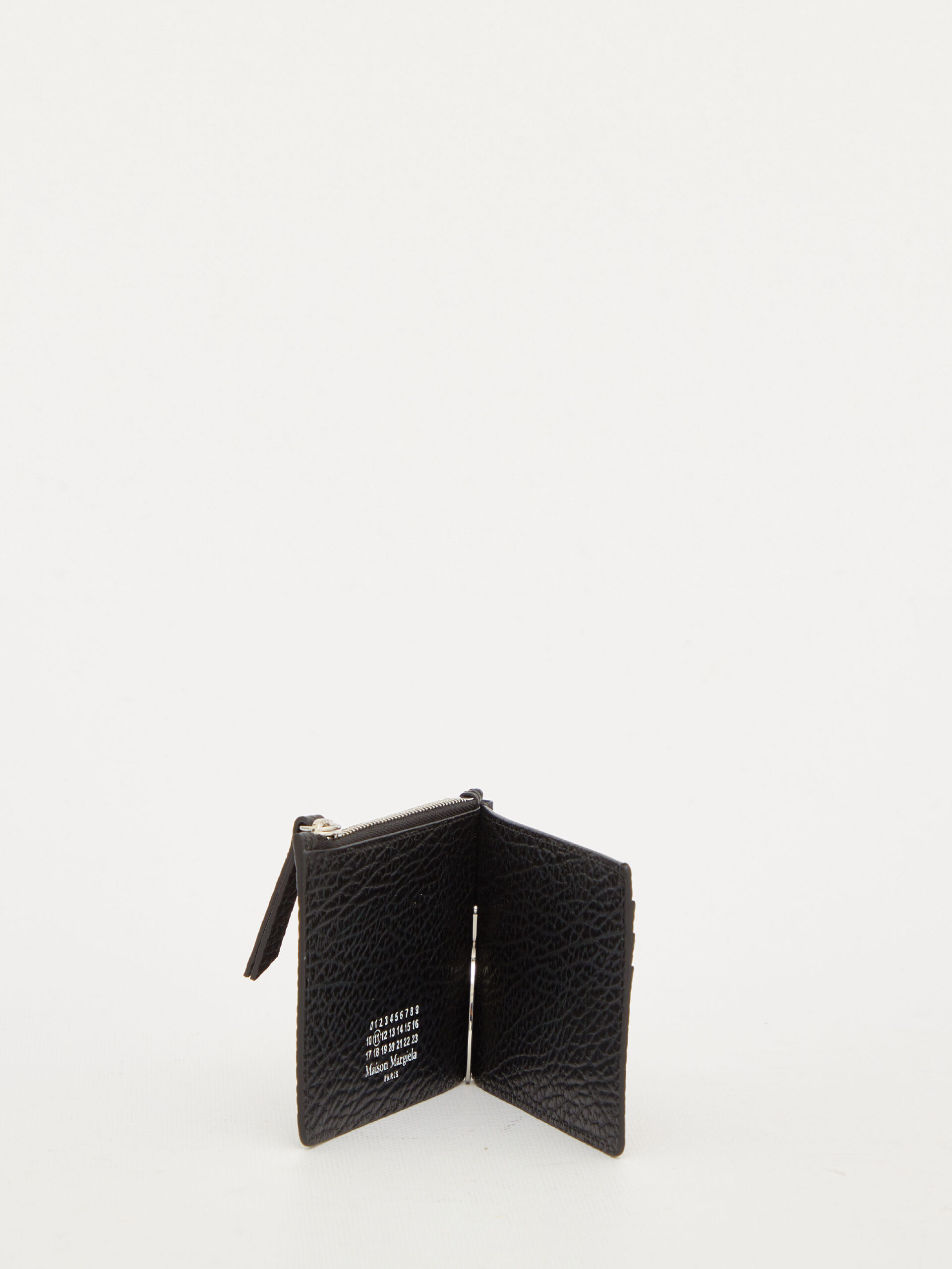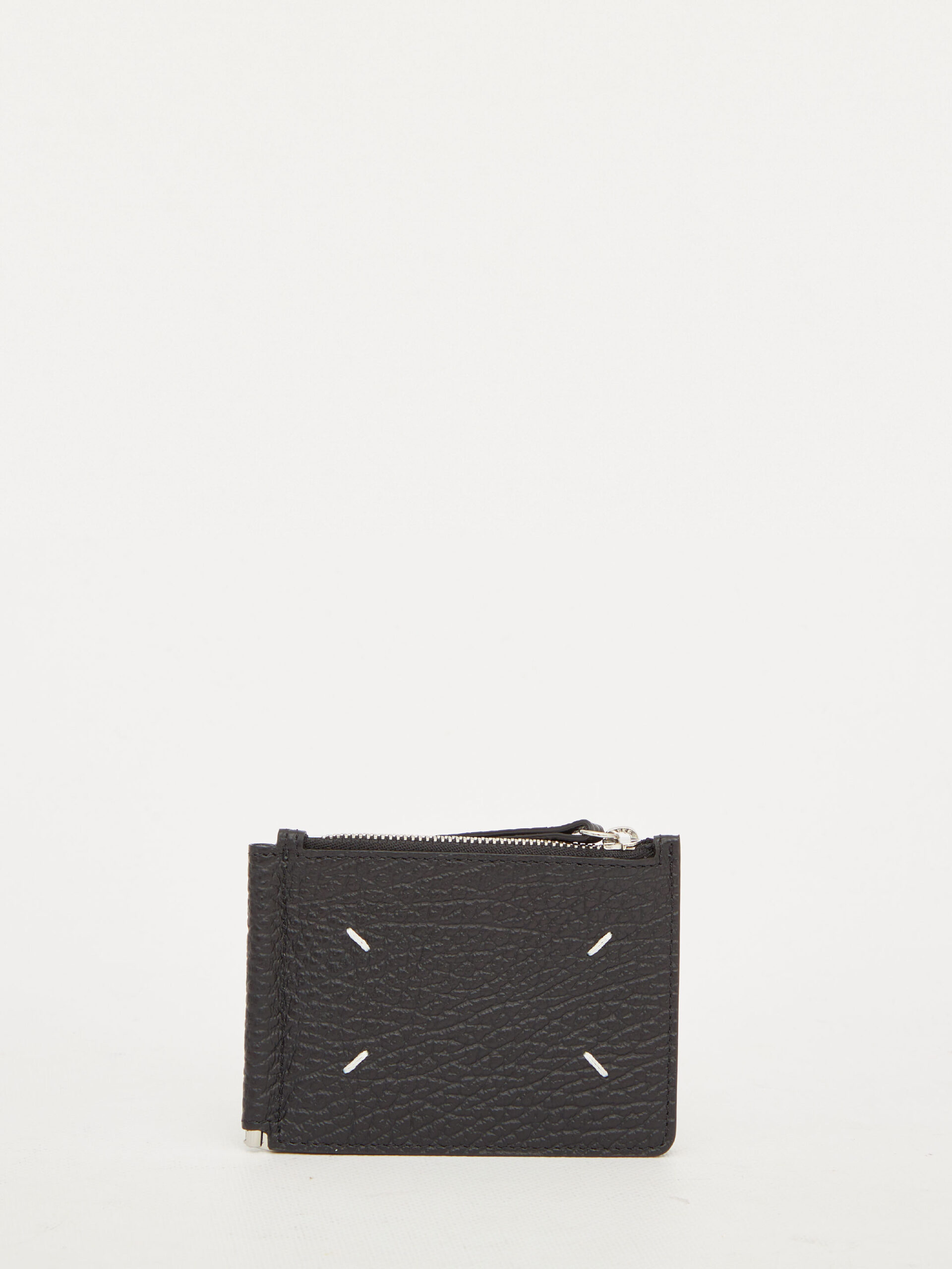 Bi-fold wallet in black grained leather with four white seams on the front. It features a zip pocket, a paperclip at the center and three card slots on the back. Numerical logo on the inside.