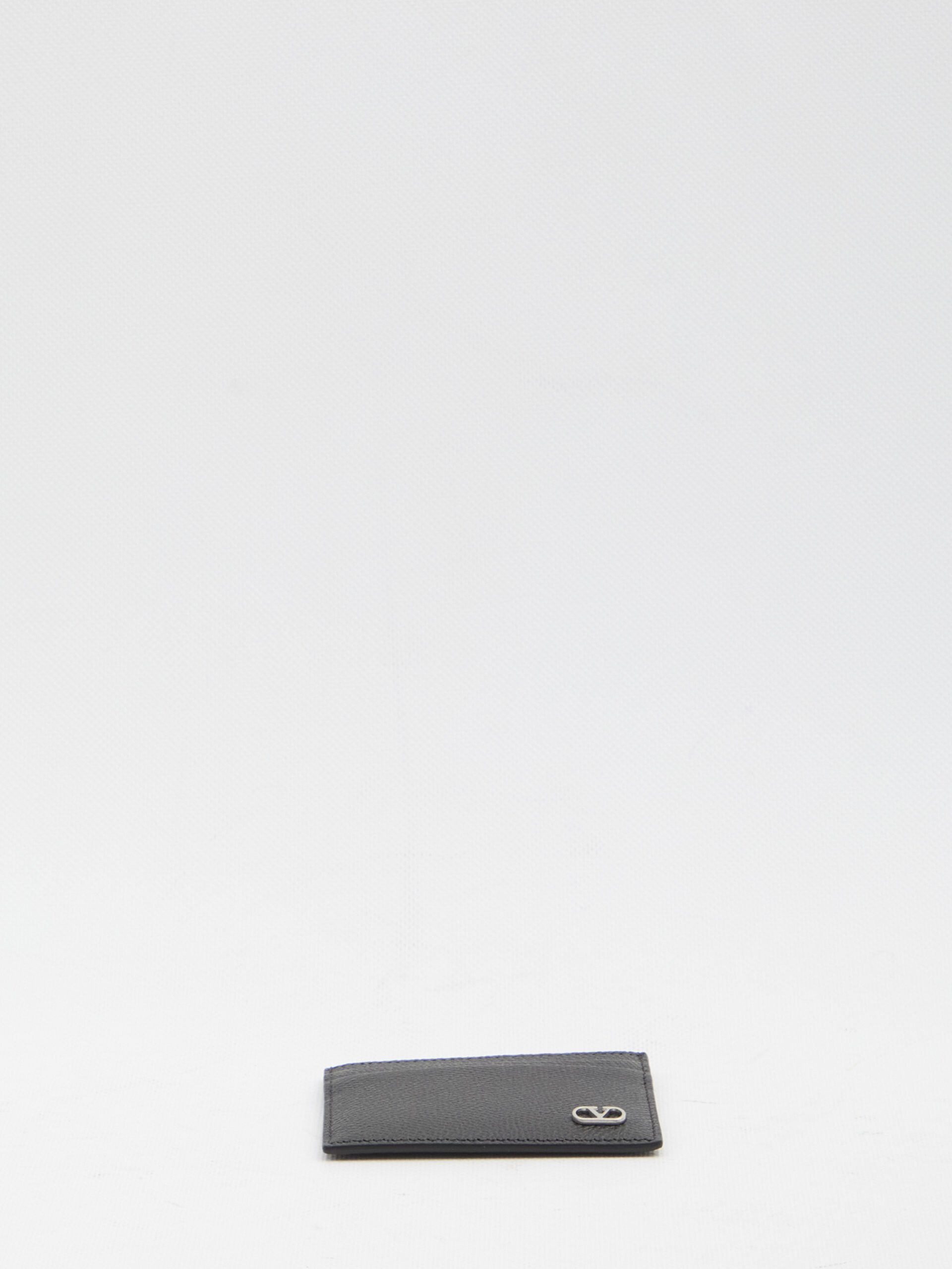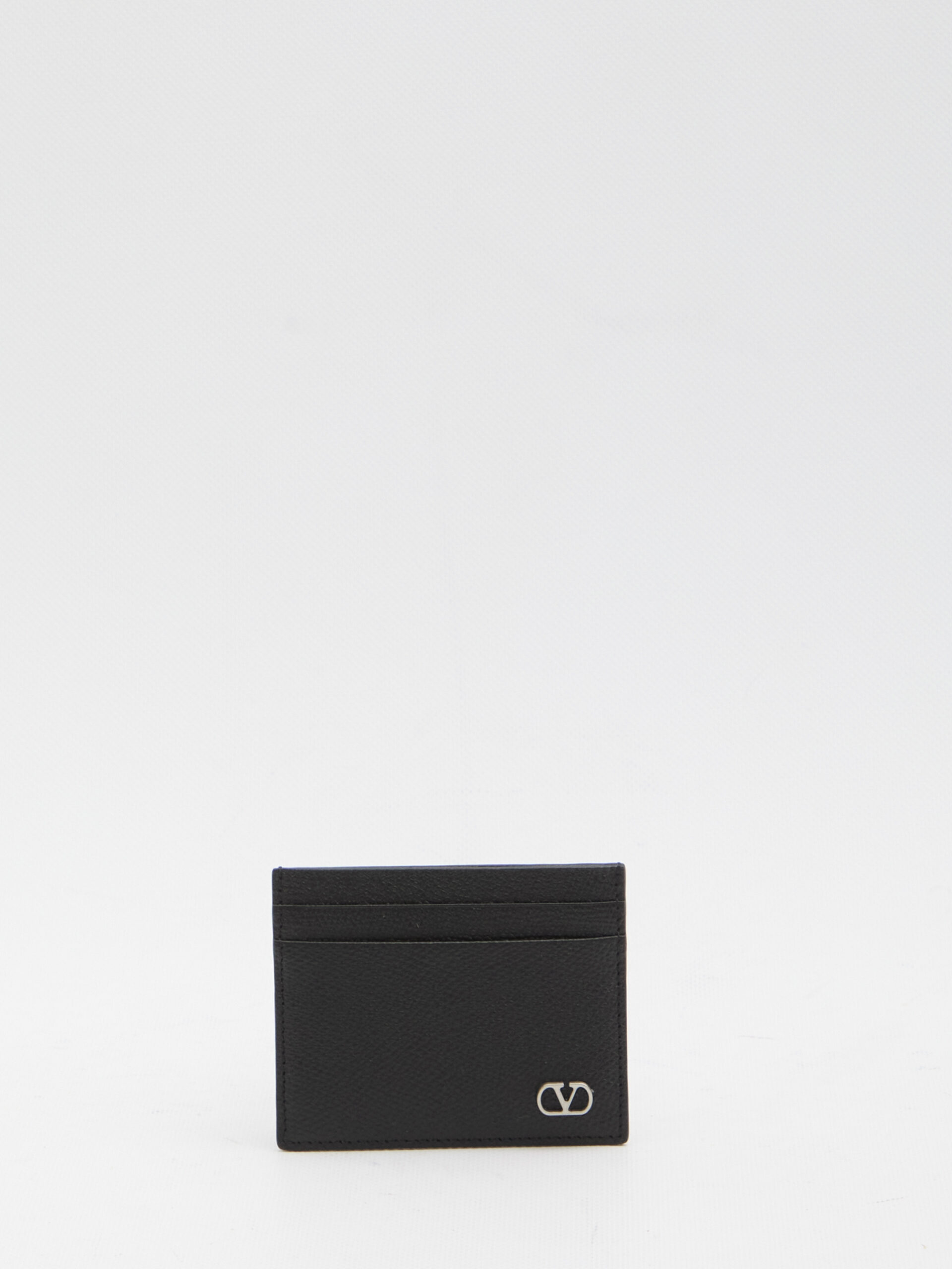 Black hammered leather card holder with a VLogo Signature detail in ruthenium. It features four card slots and one open slip pocket. Any imperfections in the leather should not be considered manufacturing defects but rather a characteristic of the material.