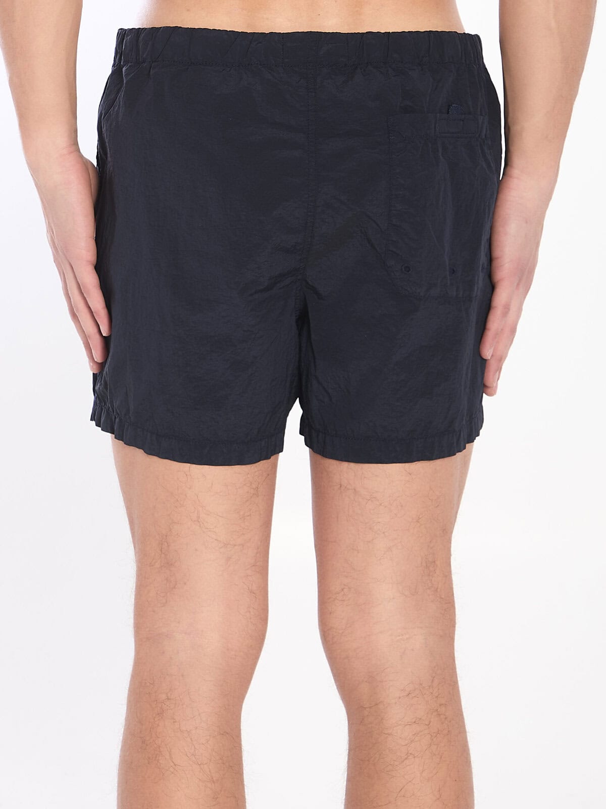 Short swim trunks in navy metal nylon with a mesh lining. They feature an elasticized waistband with drawstring, button closure, two side pockets, a Stone Island Compass patch on the left leg, a patch pocket on the back with Velcro closure, and fabric detailing on the sides. Slim fit.