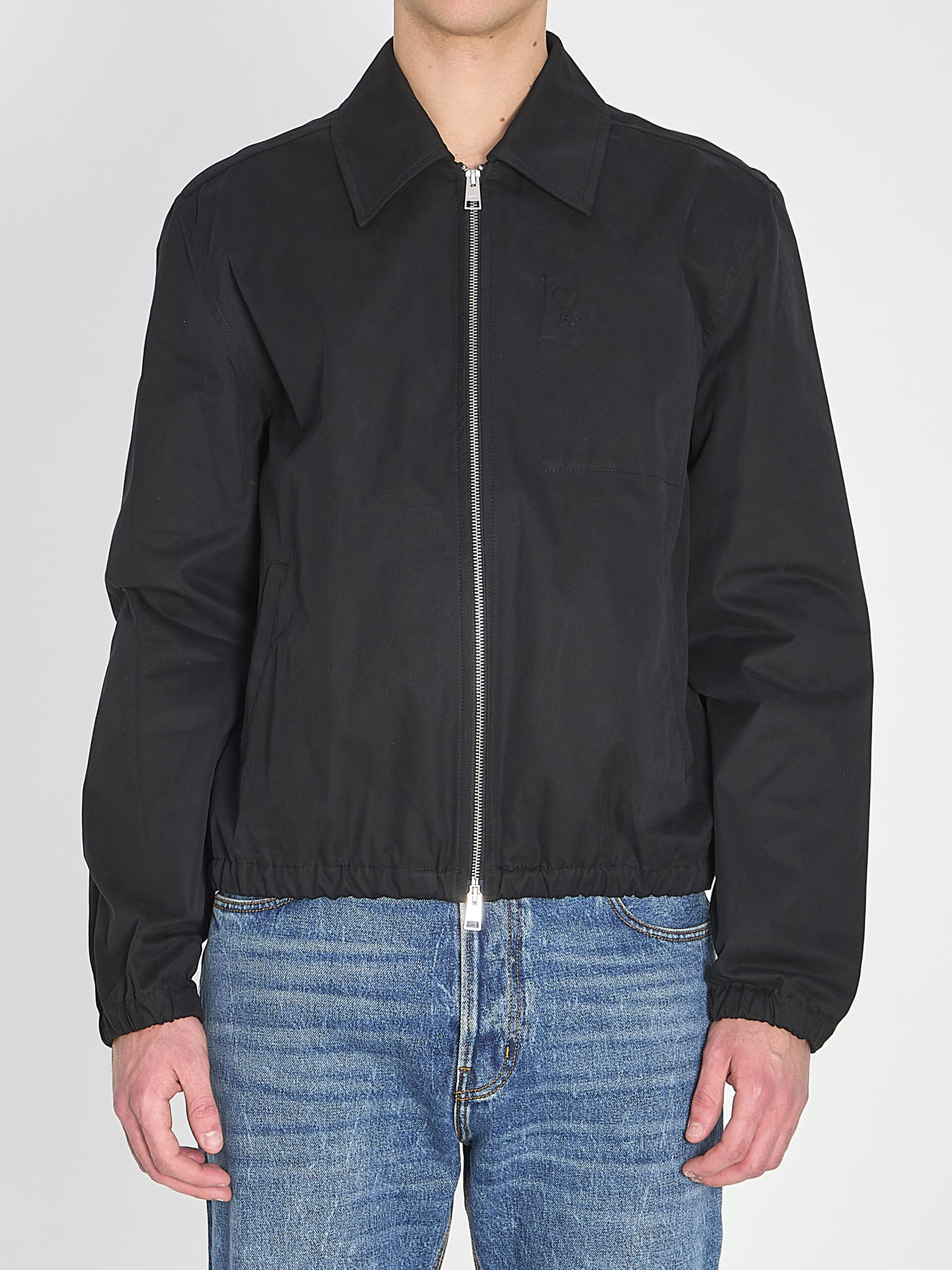 Black cotton gabardine jacket. It features a pointed collar, zip closure at the front, two front pockets with buttons, one internal pocket, embossed Ami de Coeur logo on the chest, long sleeves, and elasticized waist and cuffs. Regular fit.