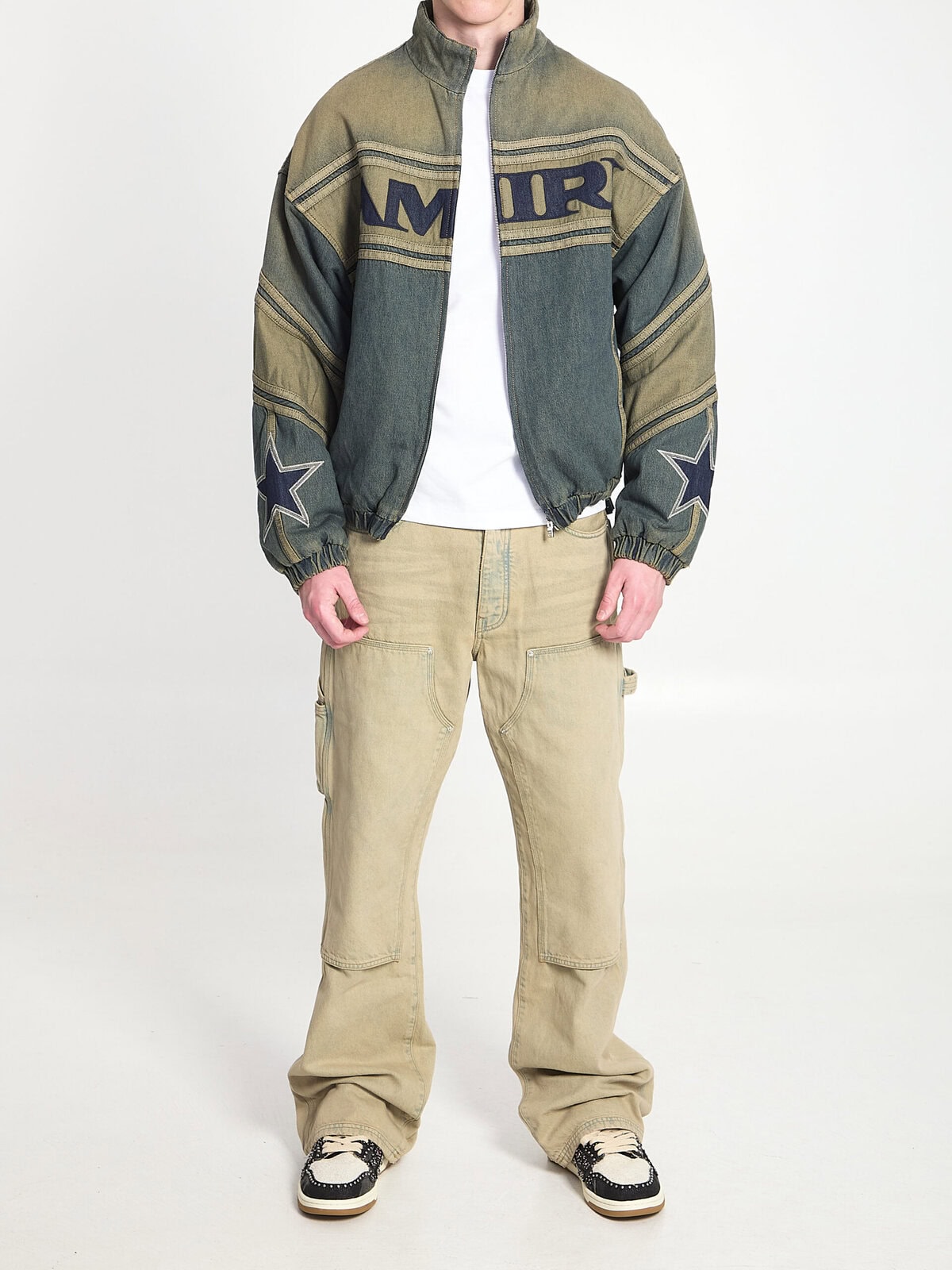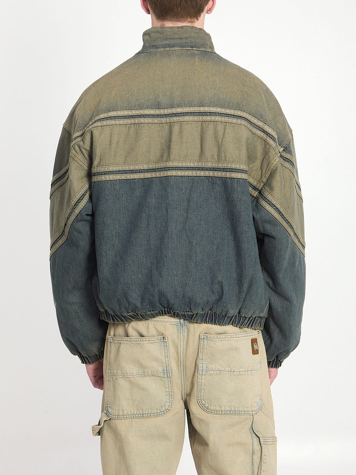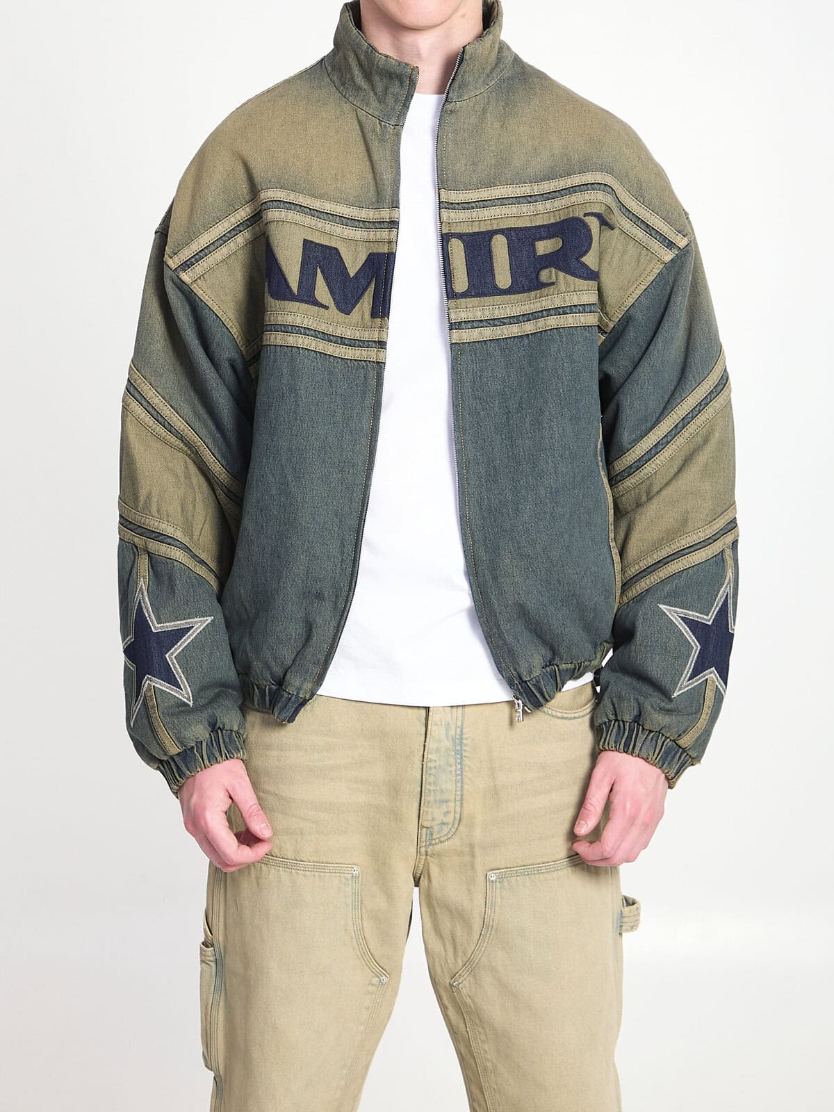 Panel-constructed cotton denim jacket with three blue and beige washes. Features a stand-up collar, front zip closure, two side pockets, long sleeves, ribbed cuffs and hem, Amiri signatures on the front, polyester-cotton blend lining. Loose fit.