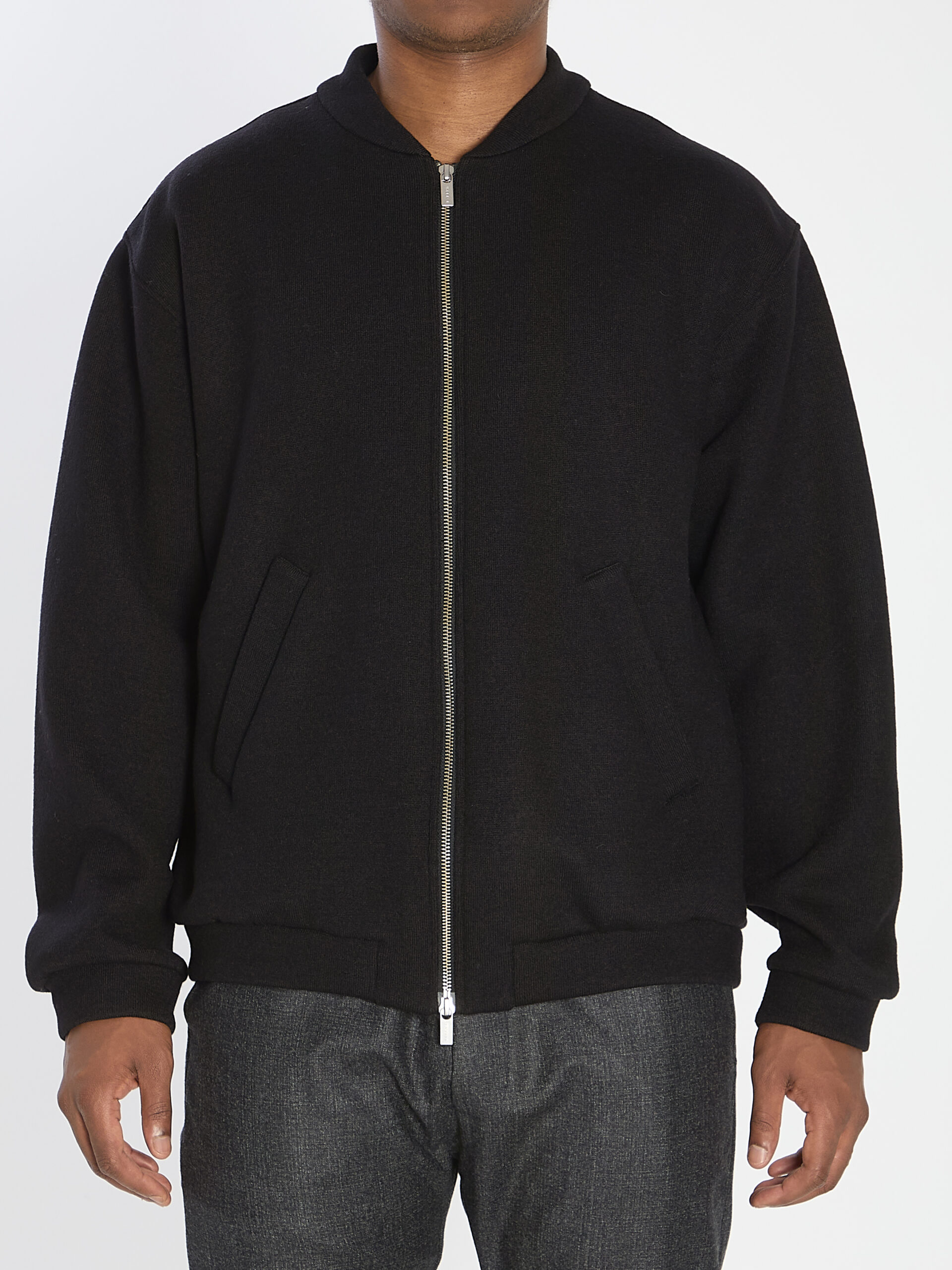 Black wool jacket. Featuring front zip closure, front welt pockets, elasticated hem and cuffs, and ribbed finishes. Regular fit.