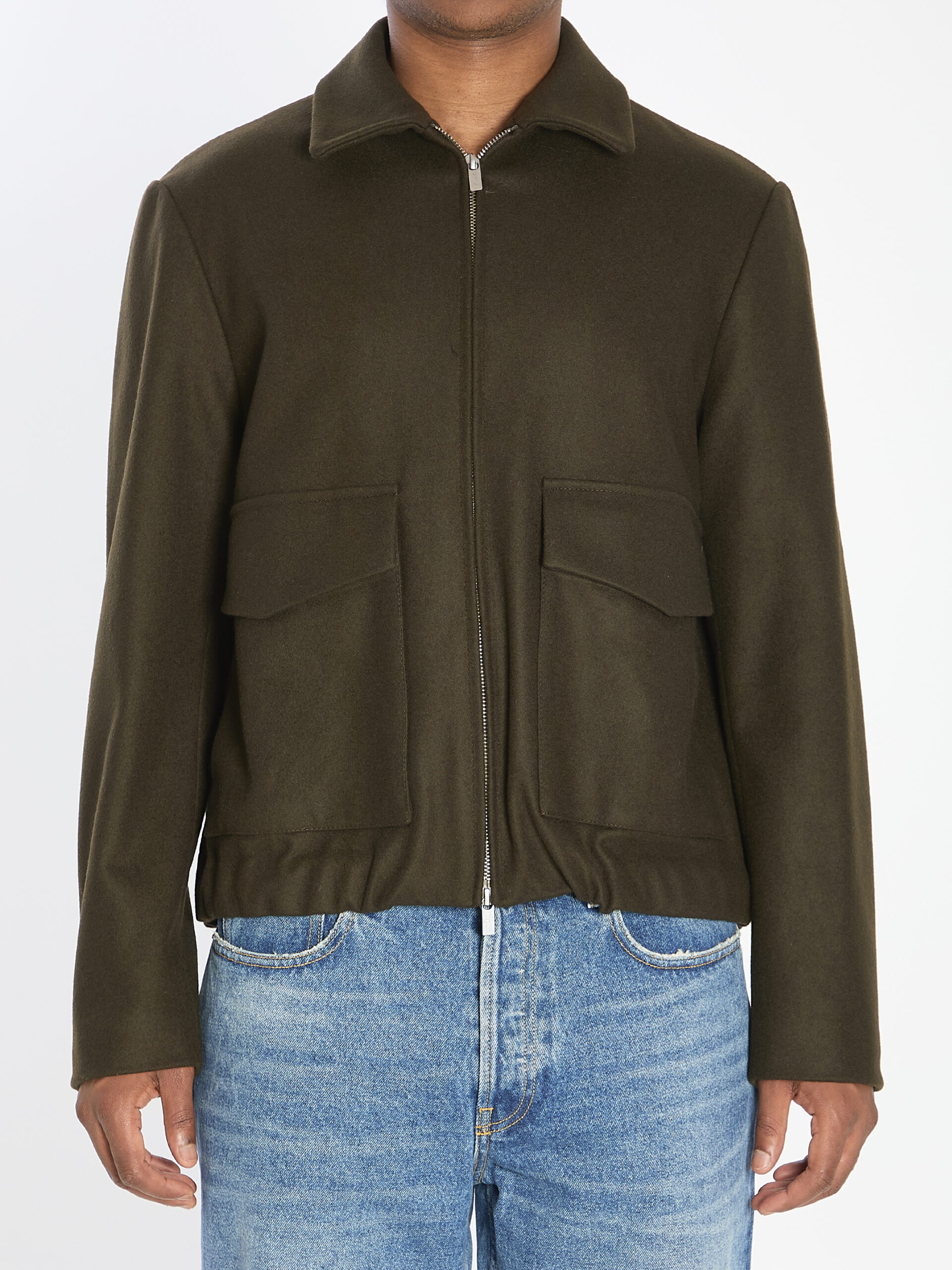 Jacket in military green wool and polyamide blend. Featuring pointed collar, double-slider zip closure, two applied vertical flap pockets and two front pockets with hidden snap buttons, gathered hem. Regular fit.