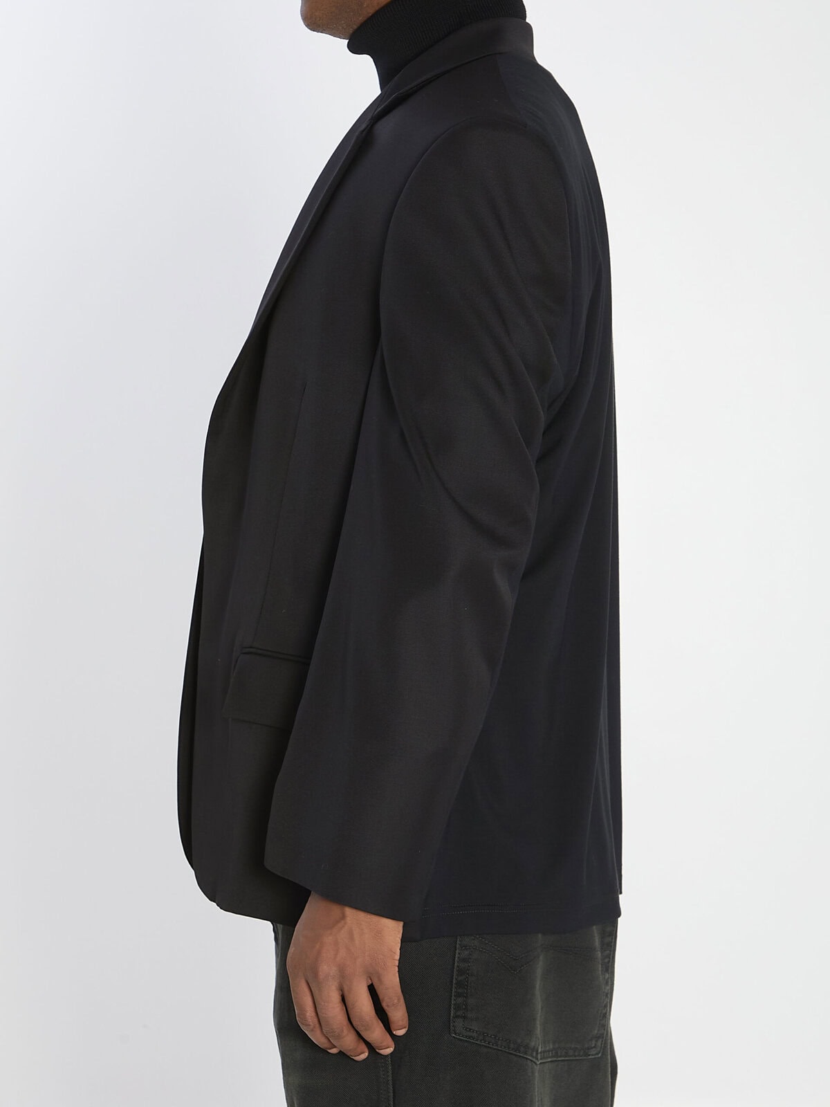 Jacket in black wool twill at the front and jersey at the back. Featuring classic lapels, long sleeves, front flap pockets, padded shoulders, and a partially lined interior. Classic fit.