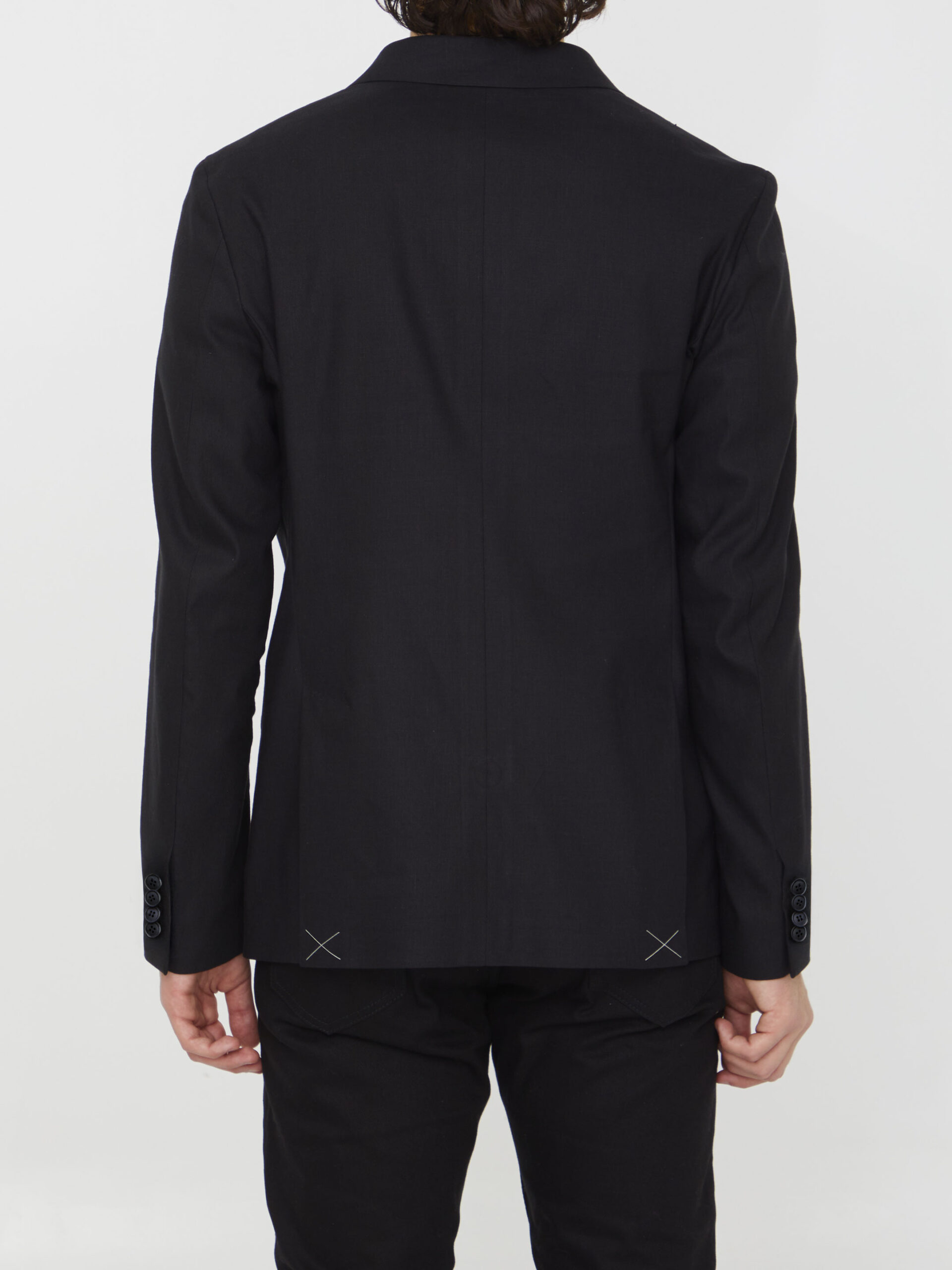 Double-breasted stretch jacket in black linen, viscose and cotton blend. It features peaked lapels, front six-button closure, two front patch pockets, a welt pocket on chest and buttoned cuffs.