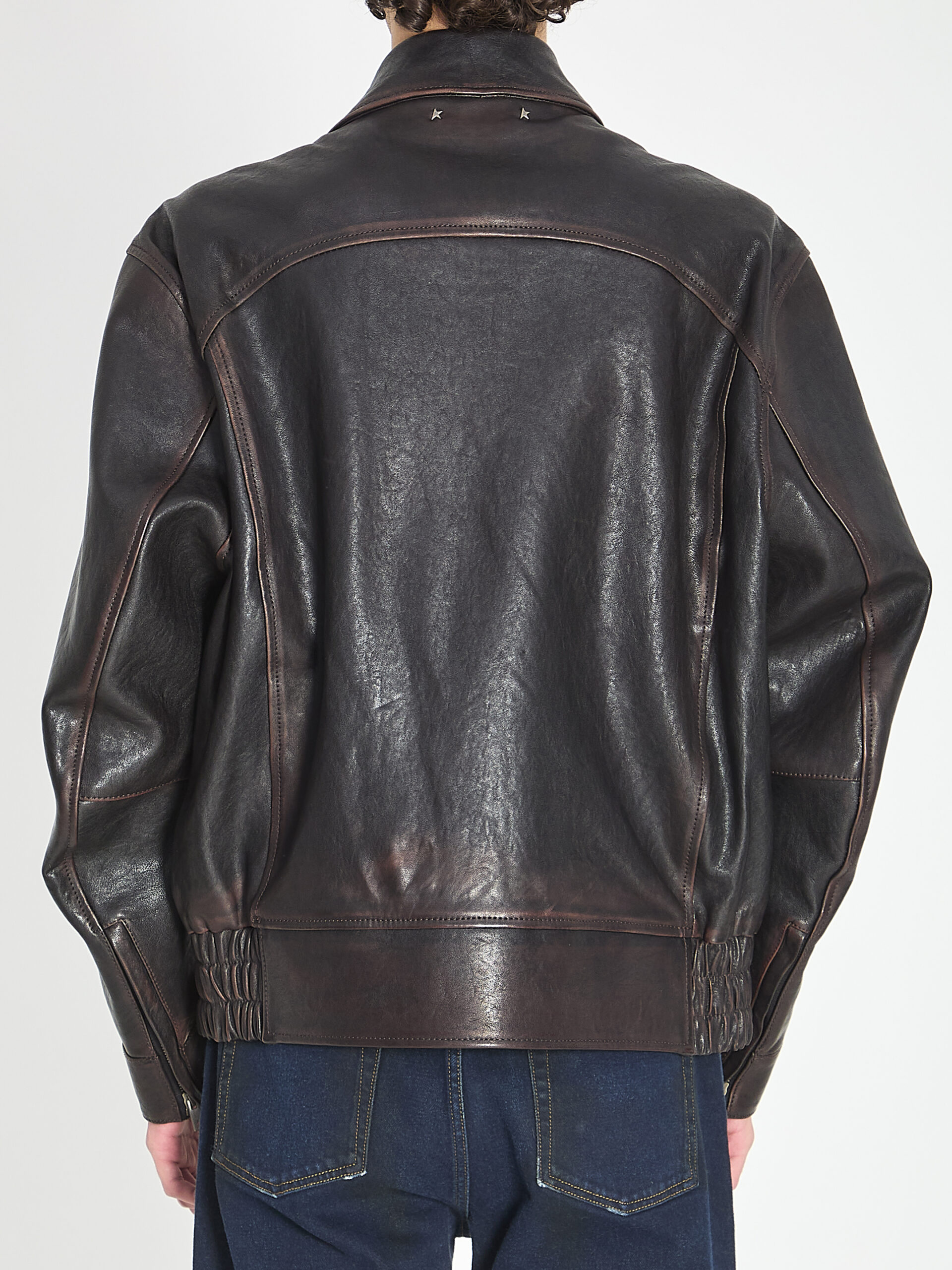 Jacket in black nappa leather with a burgundy hue effect. Features a point collar, front zip and button closure, long sleeves, zips on the sleeve cuffs, two side welt pockets, elasticized waistband, double star on the back, viscose lining. Artisanal lived-in effect treatment. Regular fit.