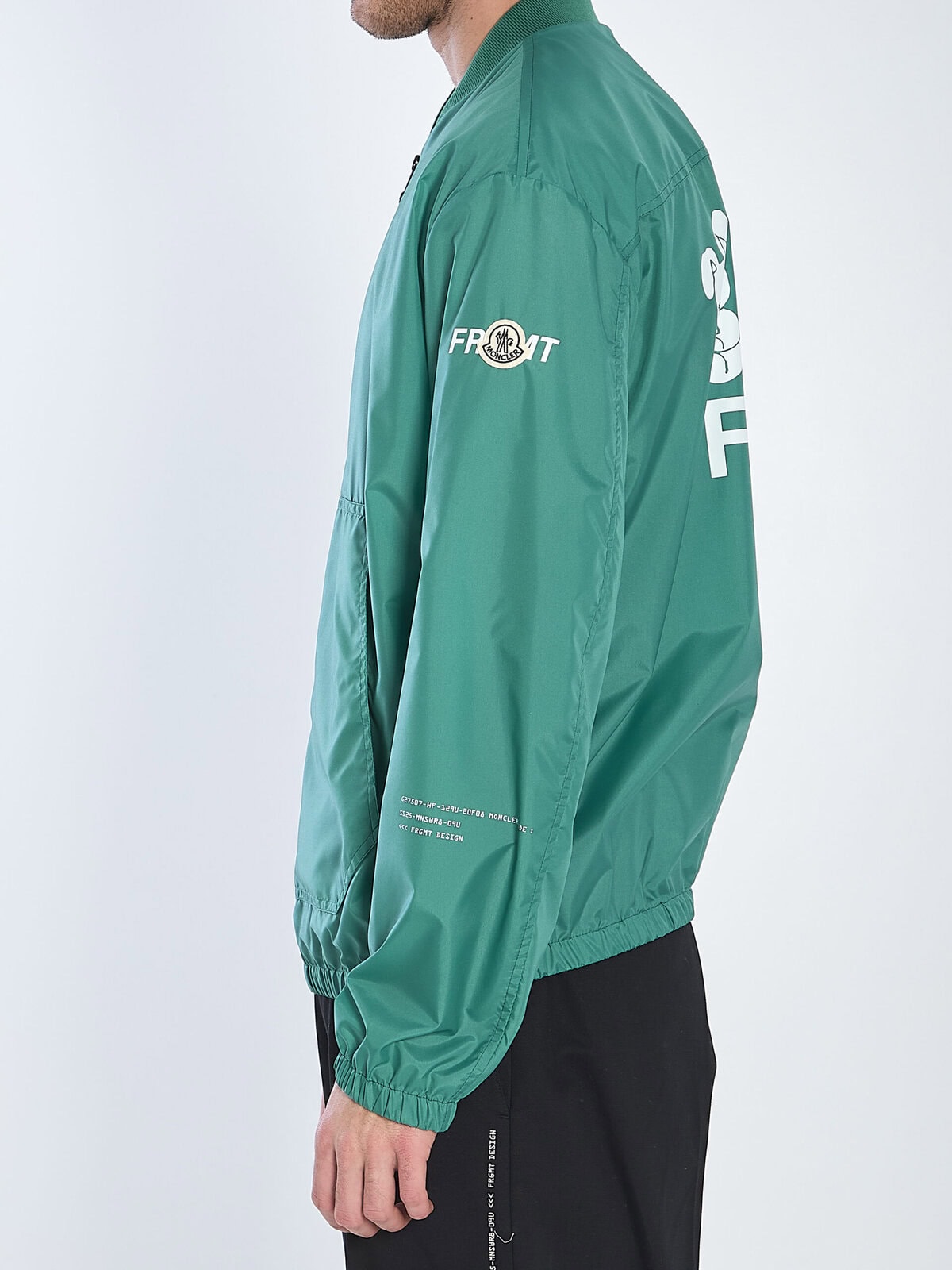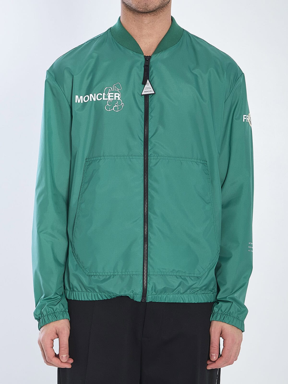 Ostria Moncler x FRGMNT bomber jacket in coated green nylon fabric. It features a ribbed cotton collar, a front zip closure, a white logo and bunny print on the chest, two large side pockets with snap buttons, large white bunnies and logo print on the back, a FRGMNT patch and logo in white on the left sleeve, and elasticated cuffs and hem.