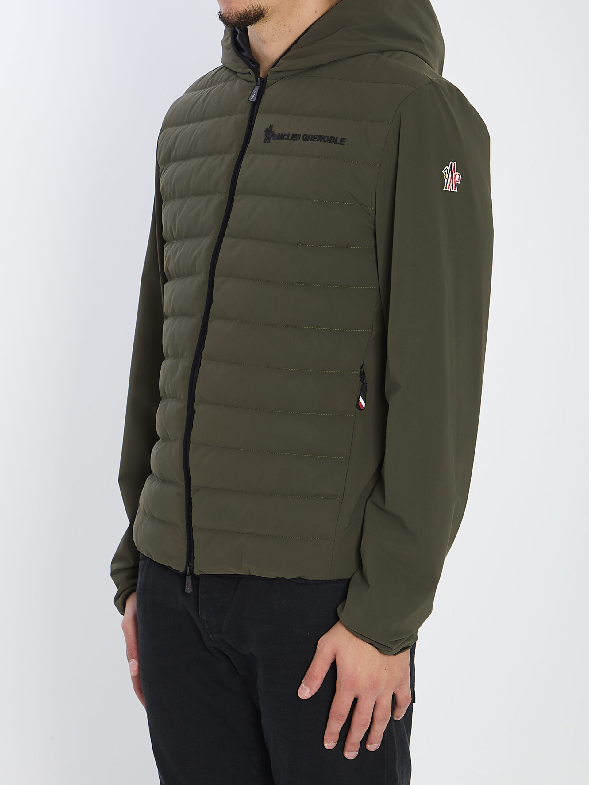 Jacket in nylon and elastane in military green. Features a hood, padded front, front zip closure, two side zip pockets, applied signature on the chest. Nylon lining. Padding: 90% goose down, 10% goose feathers. Regular fit.