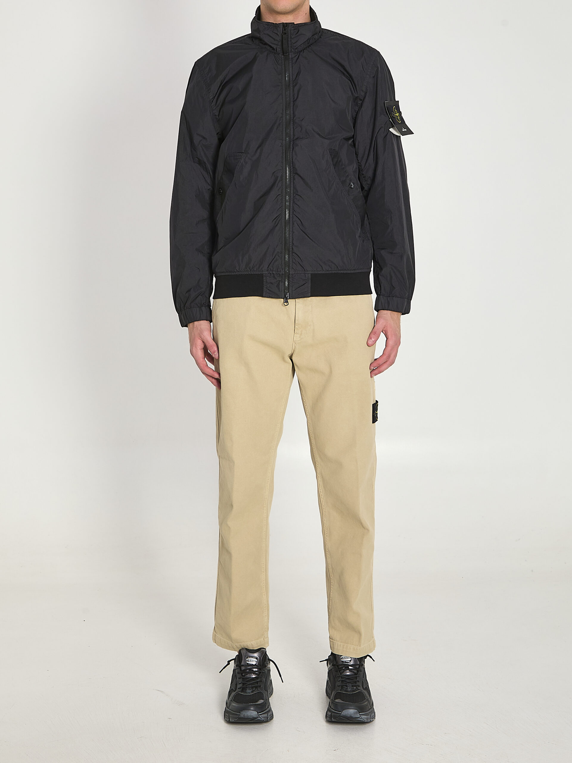 Black lightweight nylon jacket. It features an internal ribbed collar, a zip front closure, two front button pockets, long sleeves, elastic cuffs, an iconic applied badge on the sleeve, a ribbed hem, and a nylon lining. Regular fit.