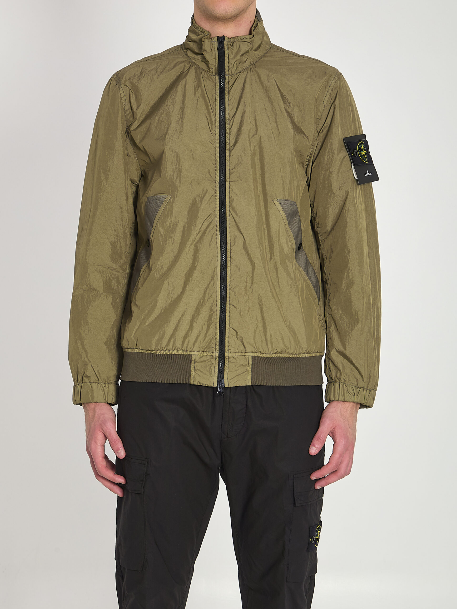 Military green lightweight nylon jacket. It features an internal ribbed collar, a zip front closure, two front button pockets, long sleeves, elastic cuffs, an iconic applied badge on the sleeve, a ribbed hem, and a nylon lining. Regular fit.