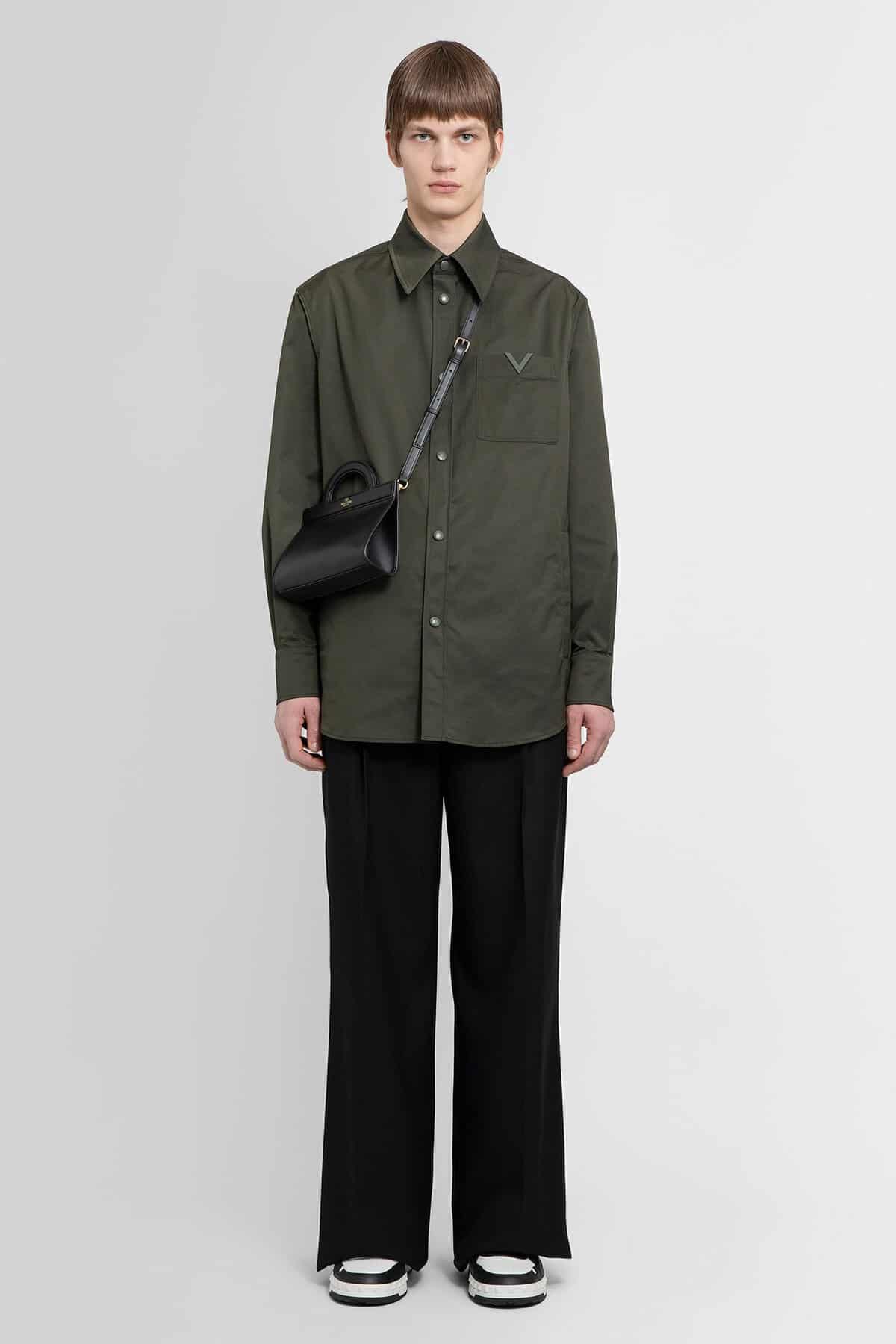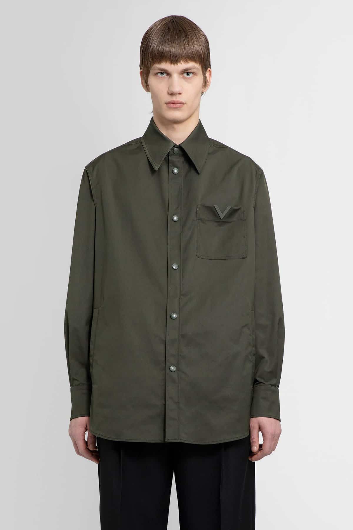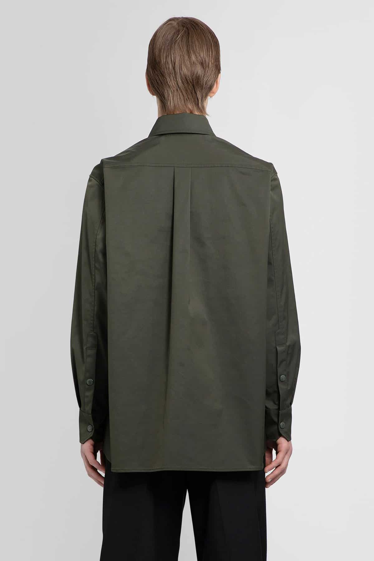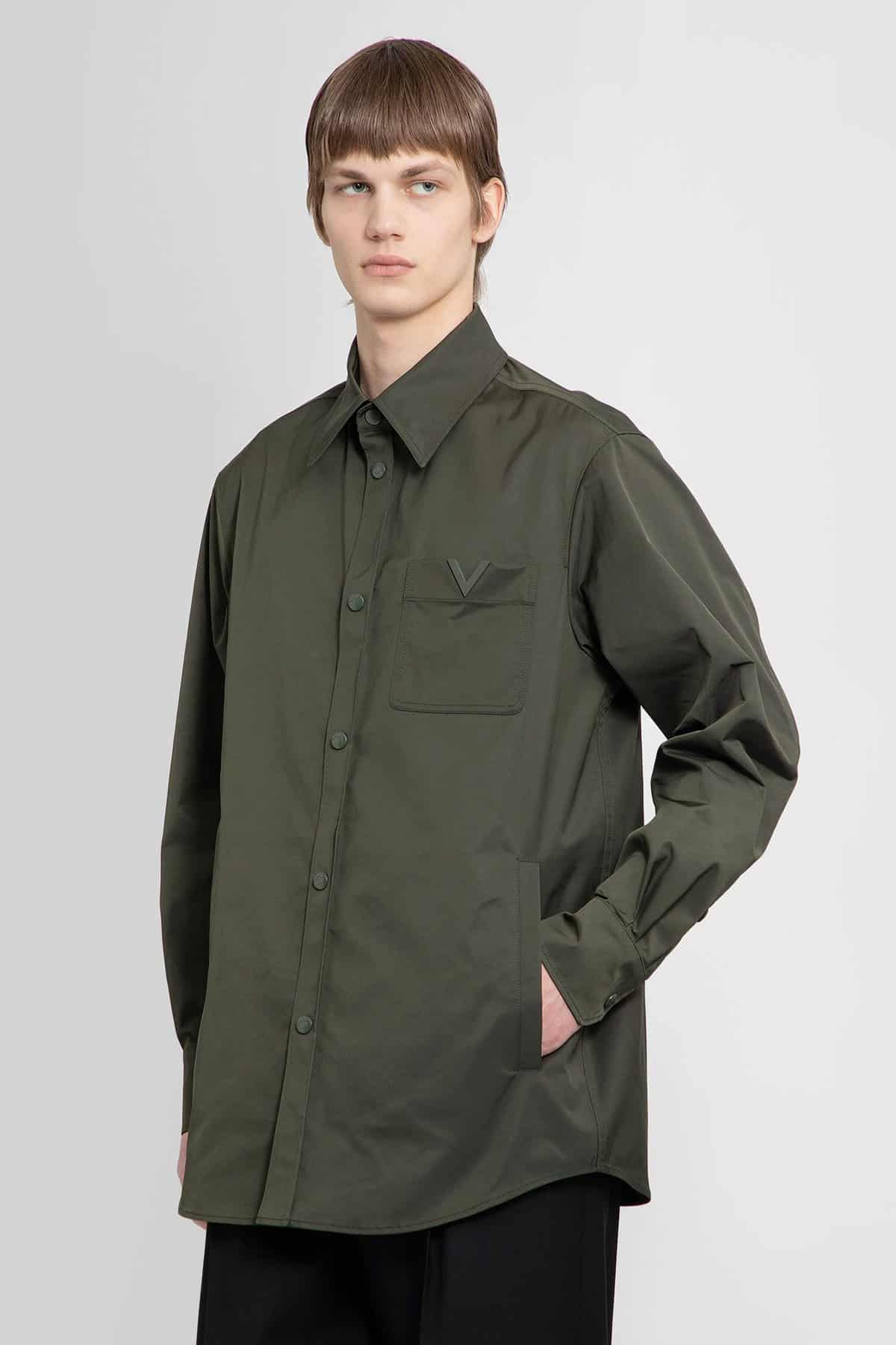 Khaki green Stretch nylon Collar Press stud closure Chest pocket with rubber v plaque Side pockets Press stud cuffs Back box pleat