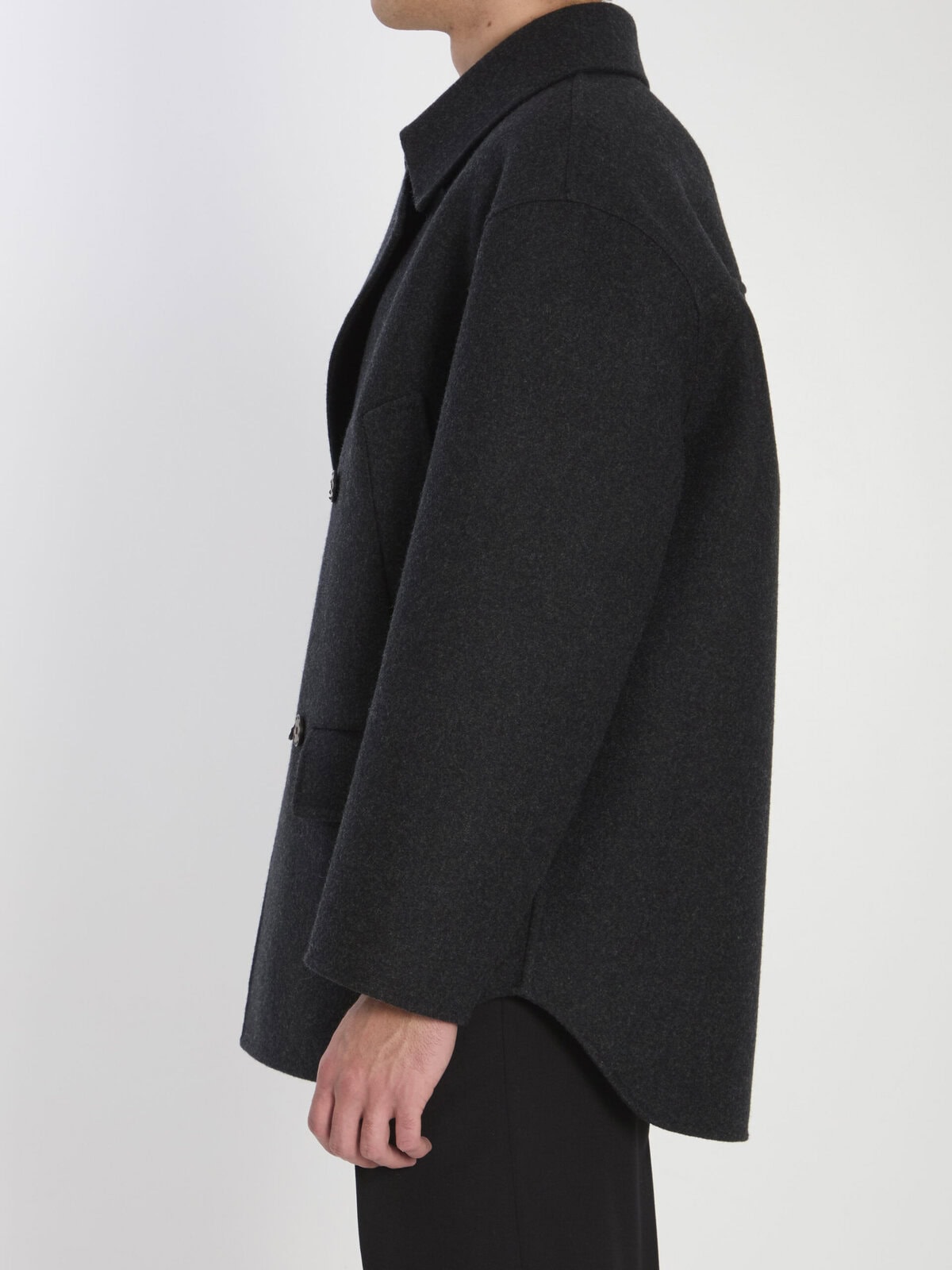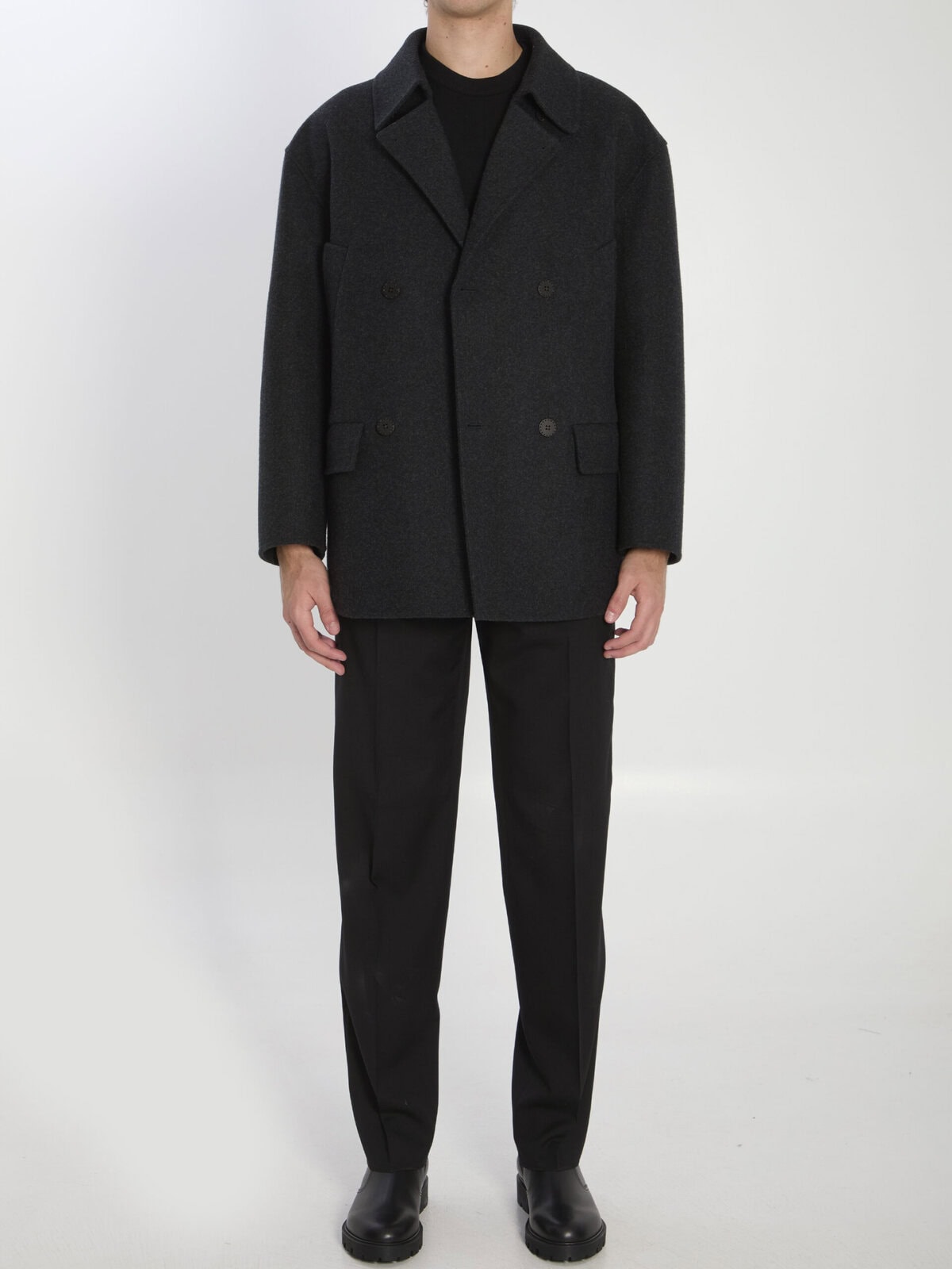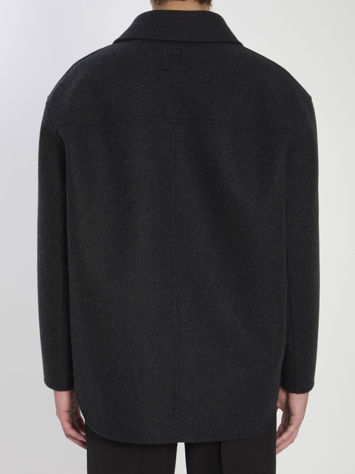 Dark grey virgin wool felt pea coat. Features a shirt collar, double-breasted four-button closure, two slanted welt pockets and two flap pockets on the front, long sleeves with dropped shoulders, and embossed FF logo on the back. Unlined design. Regular fit.