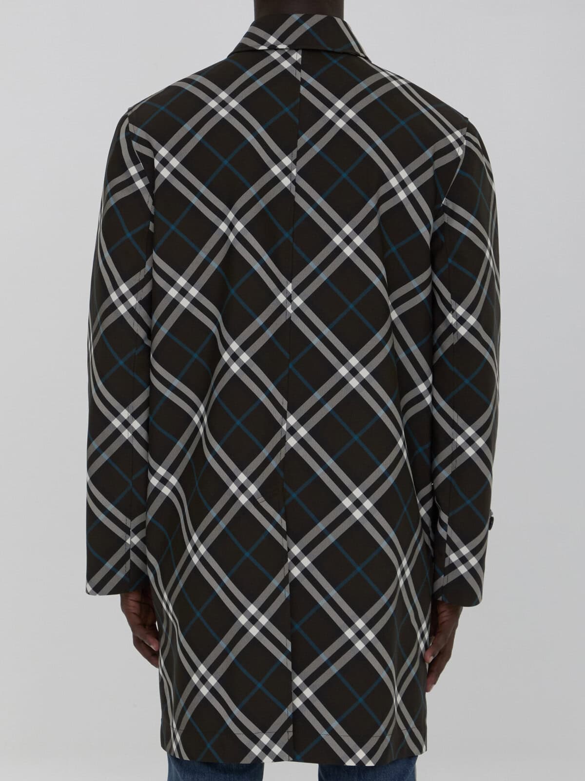 Medium trench coat in Burberry Check fabric. It features classic collar, front button closure, two side welt pockets, belted cuffs and back vent. Regular fit.