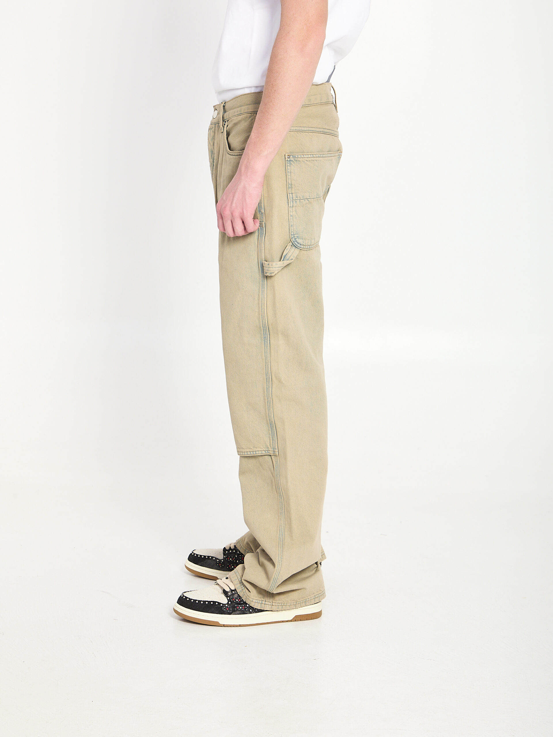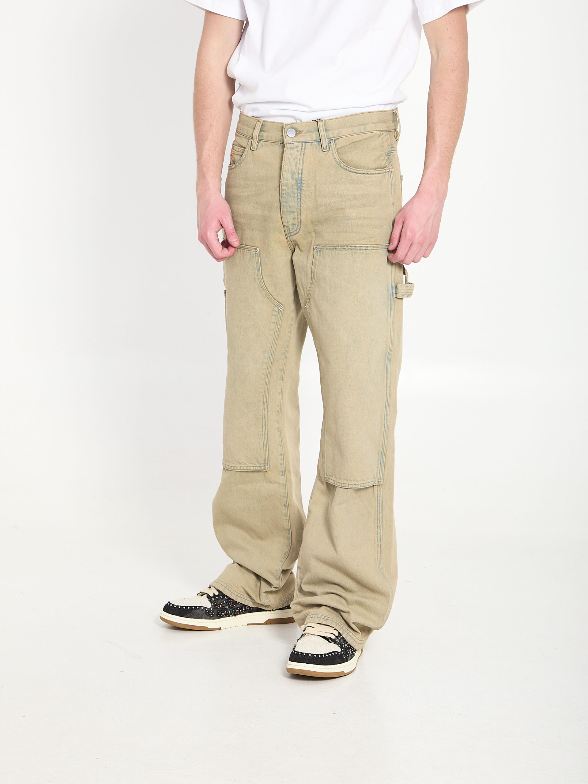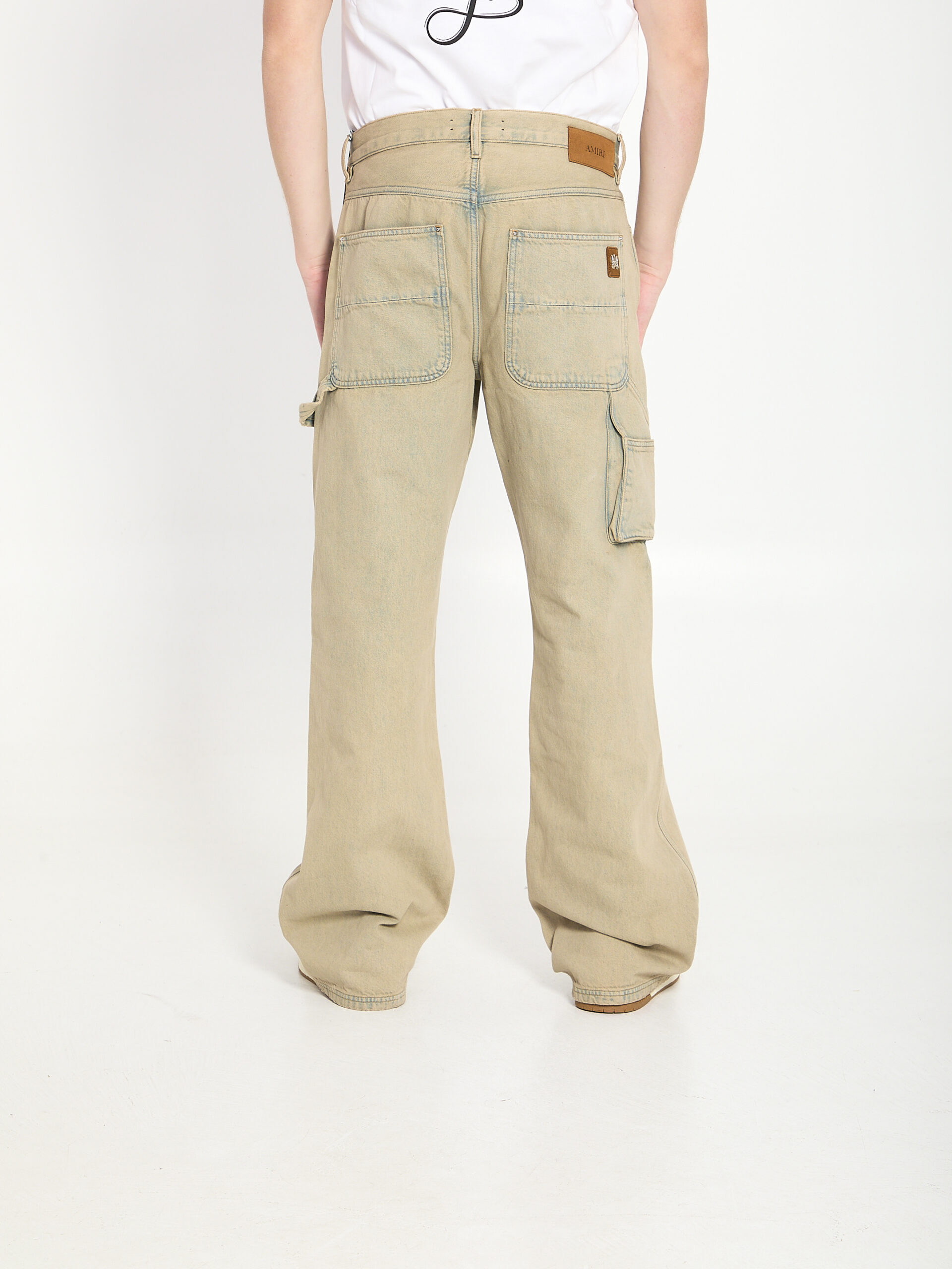 Beige cotton denim jeans with three-step anticorrosion treatment from an indigo base. Feature belt loops, button front closure, six pockets, side carpenter loop, patches on the front, suede patch with Amiri signature and metal logo on the back, mid-rise waist, wide leg. Regular fit.