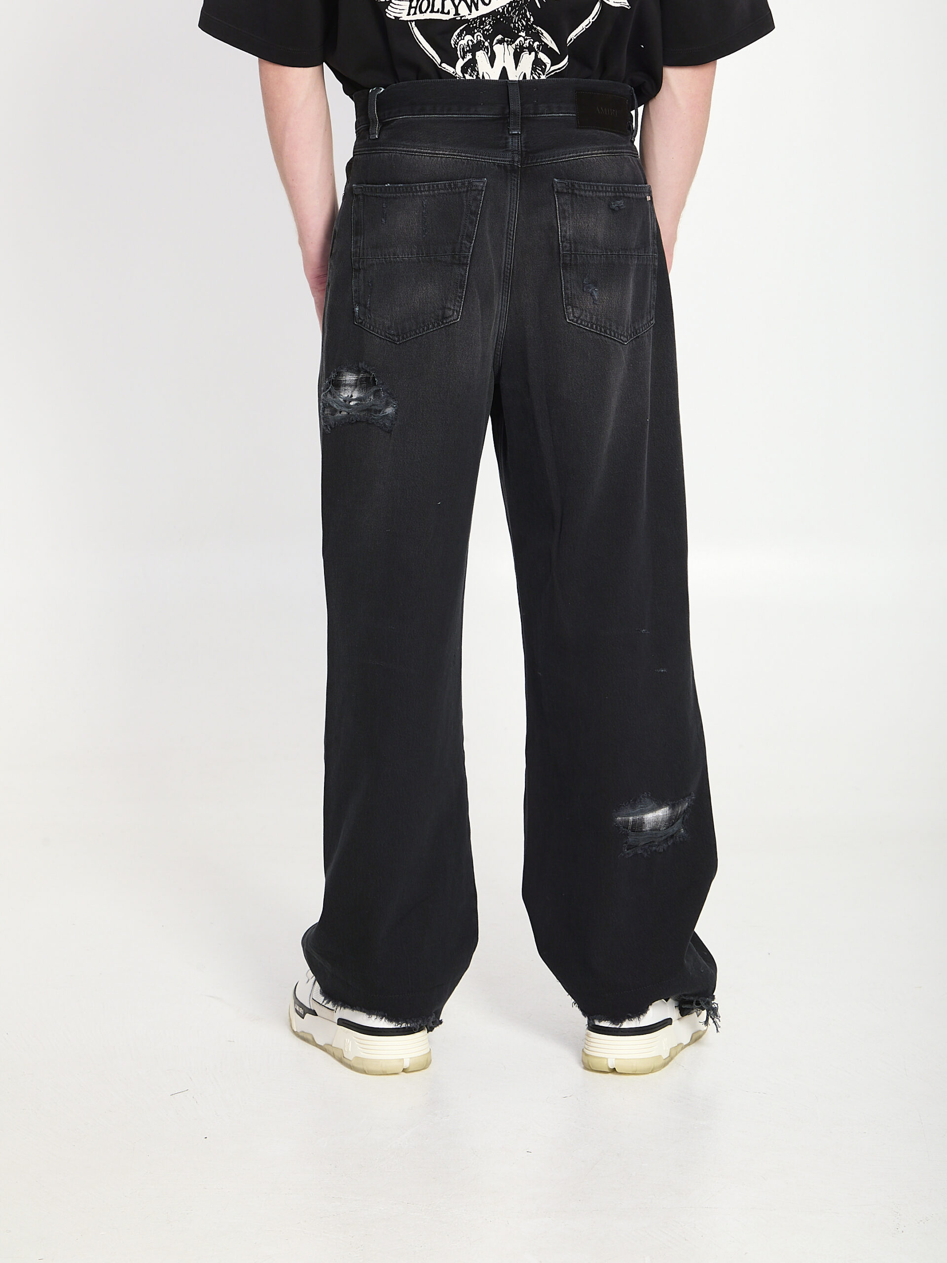 Black cotton denim jeans. Feature belt loops, button front closure, five pockets, suede patch and metal label on the back with Amiri signature, black and white flannel inserts, worn and distressed effect, mid-rise waist, wide leg. Regular fit.