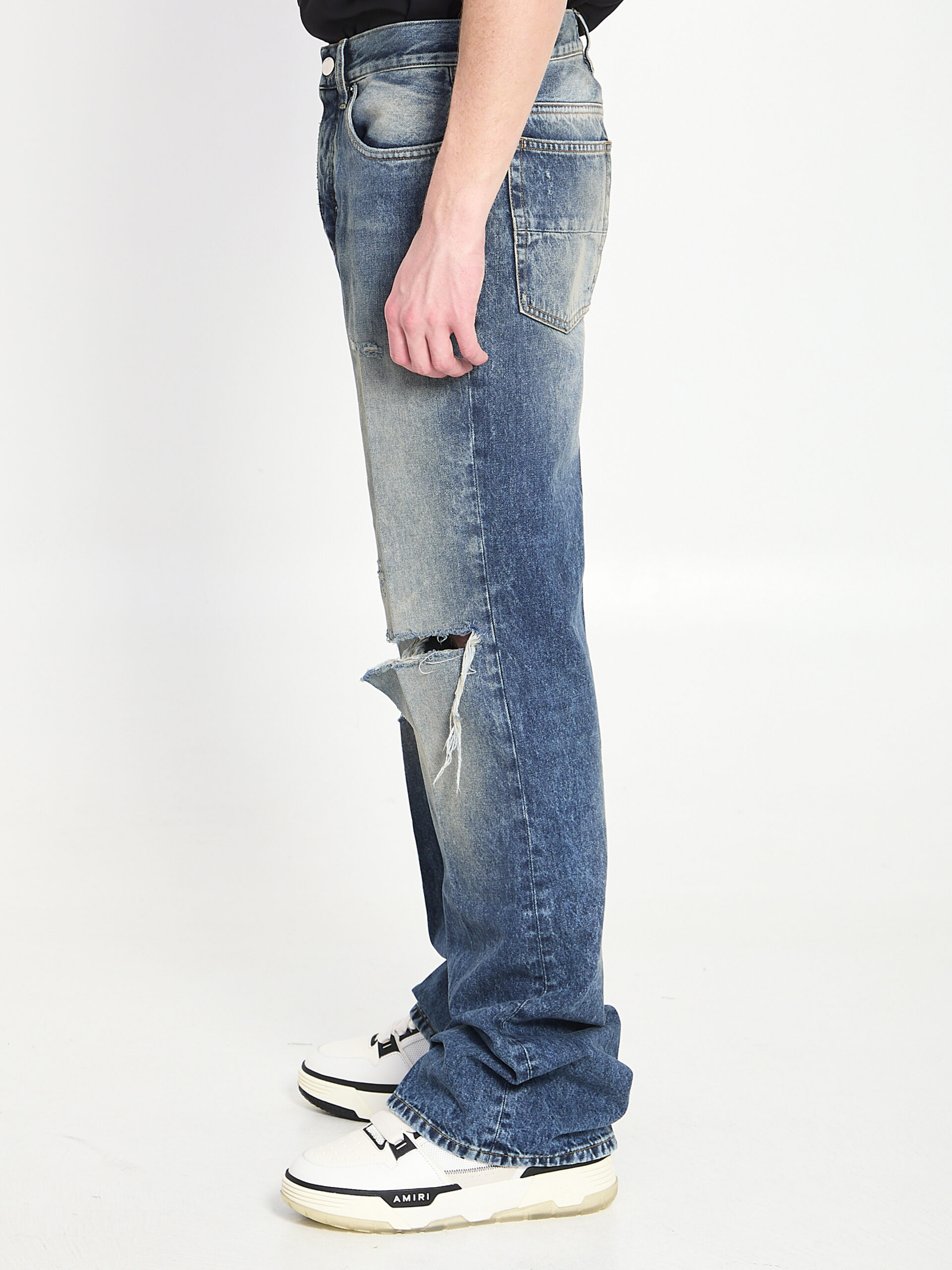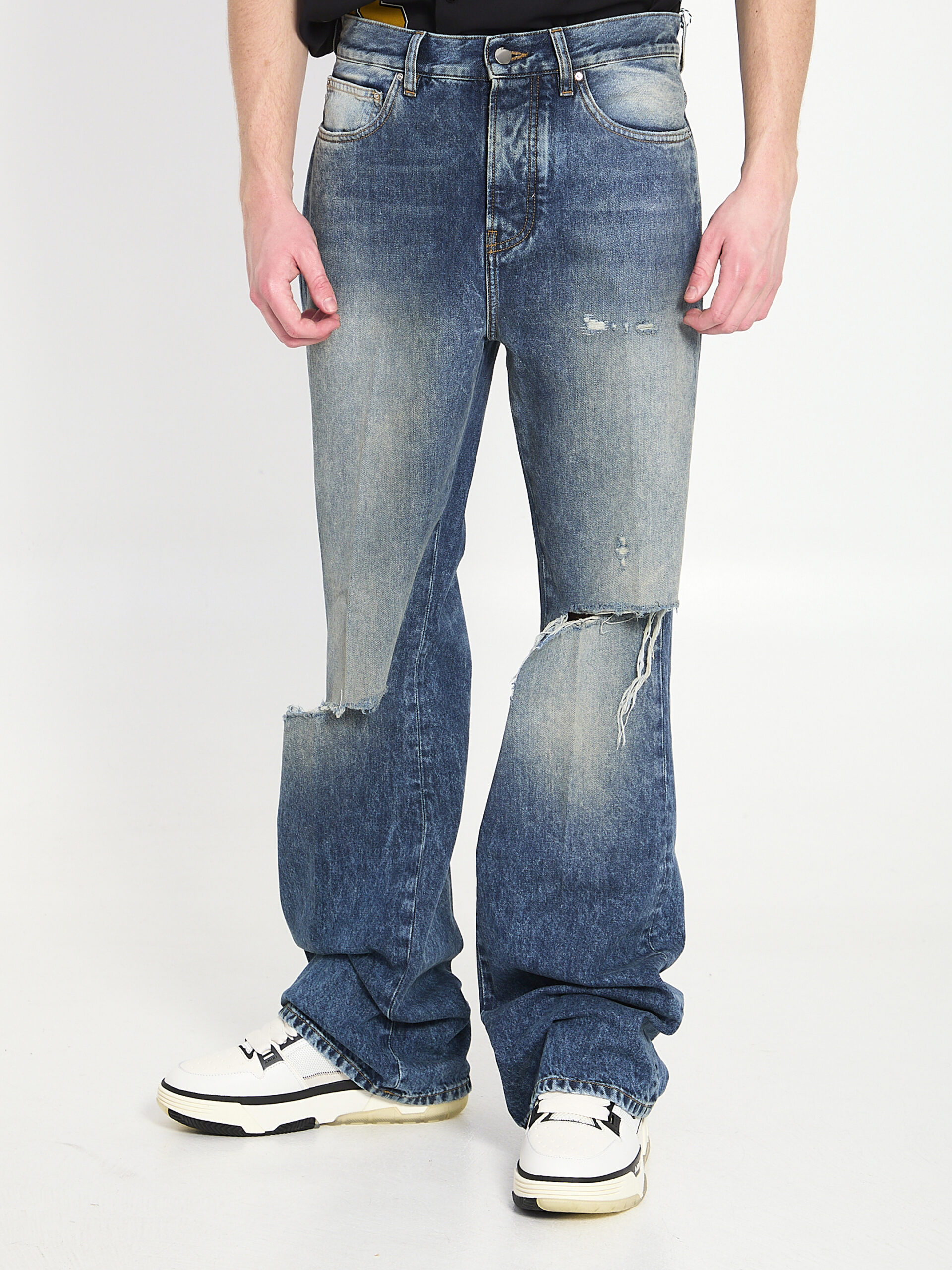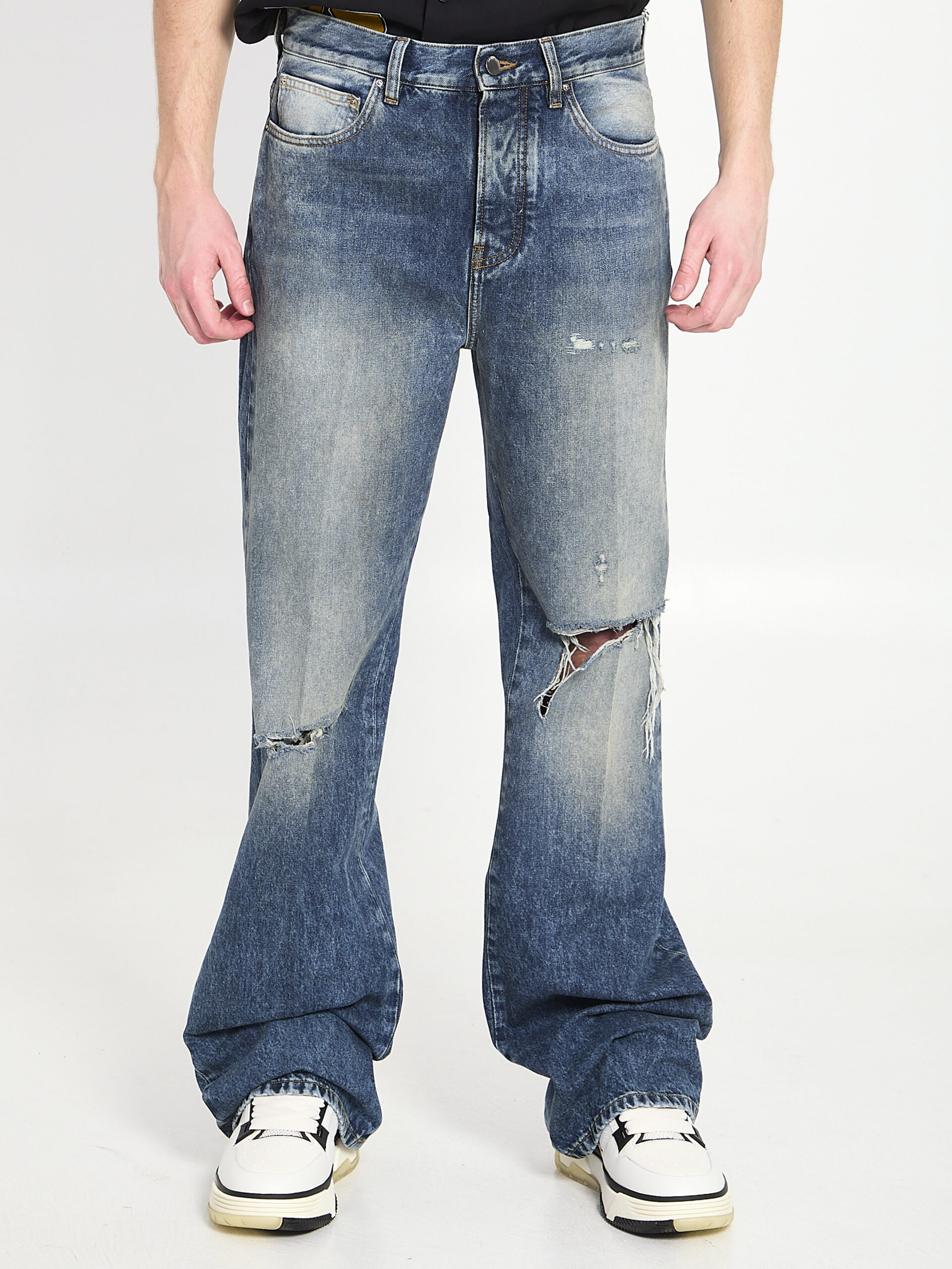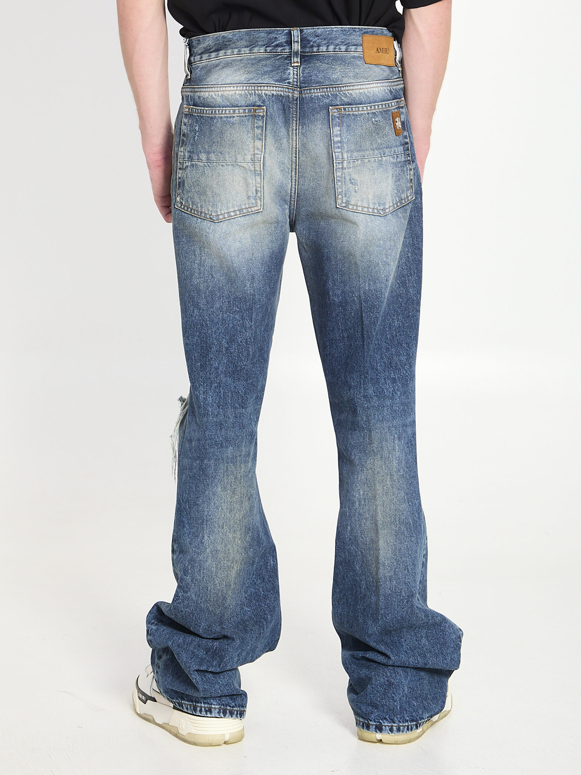 Blue cotton denim jeans with vintage treatment. Feature belt loops, button front closure, five pockets, leather patch with Amiri signature and metal logo on the back, ripped knees, mid-rise waist, bootcut leg. Regular fit.