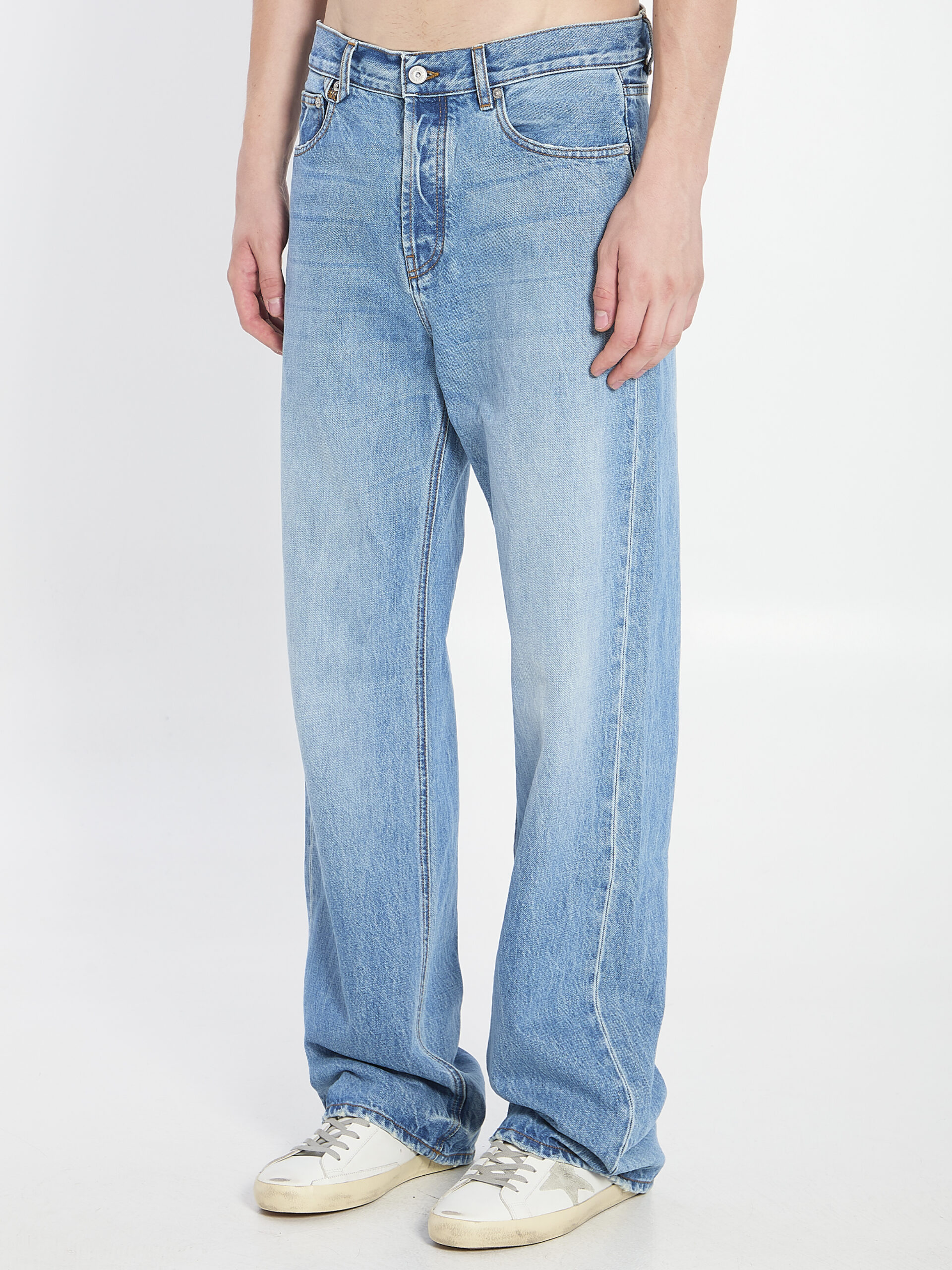 Washed indigo blue denim jeans. Features mid-high waist, J-shaped belt loop, engraved metal button closure, metal rivets, five pockets, long straight leg, laser-printed logo on the back pocket, and contrasting topstitching. Regular fit.