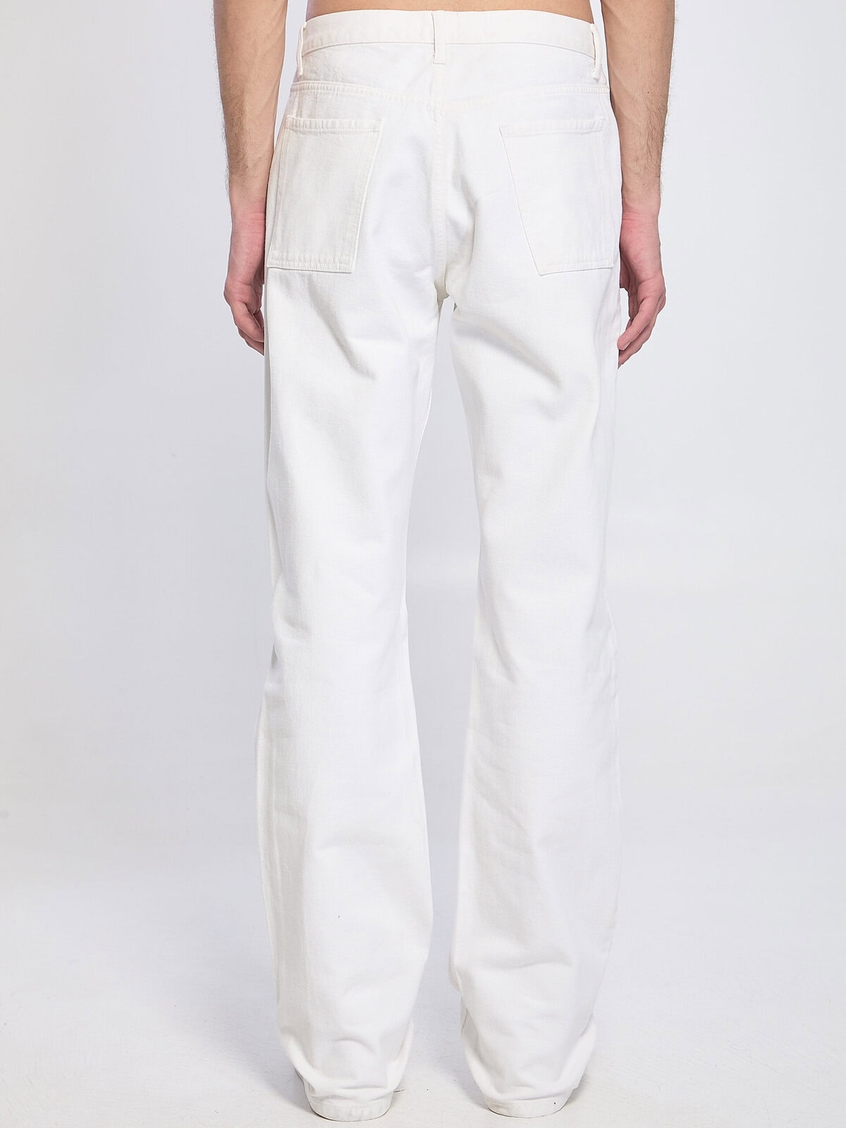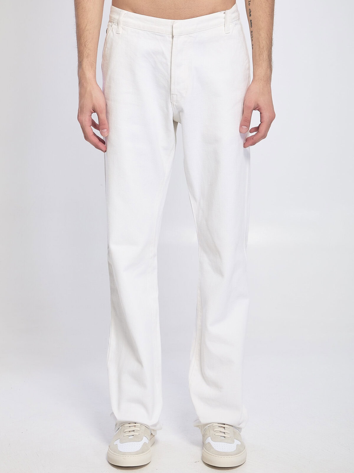 White cotton jeans. They feature a concealed fastening with snap buttons and regular buttons, two side pockets, a rubber patch with engraved logo on the right leg, belt loops, two back pockets, and straight legs. Any imperfections are considered natural signs of wear over time.