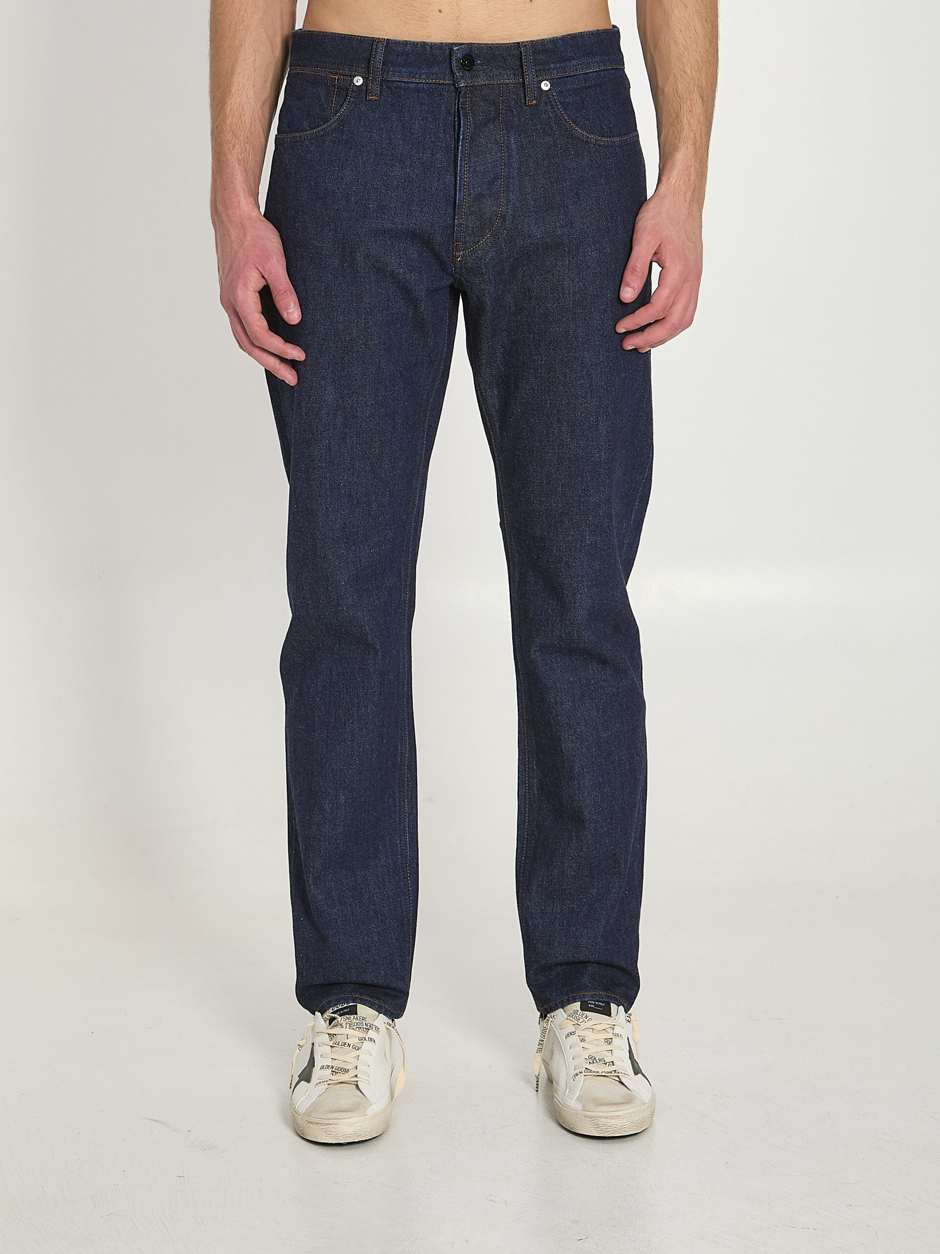 Blue cotton denim jeans. They feature belt loops, a button front closure, five pockets, an applied logo patch on the back, a mid-rise waist, and a straight leg. Regular fit.