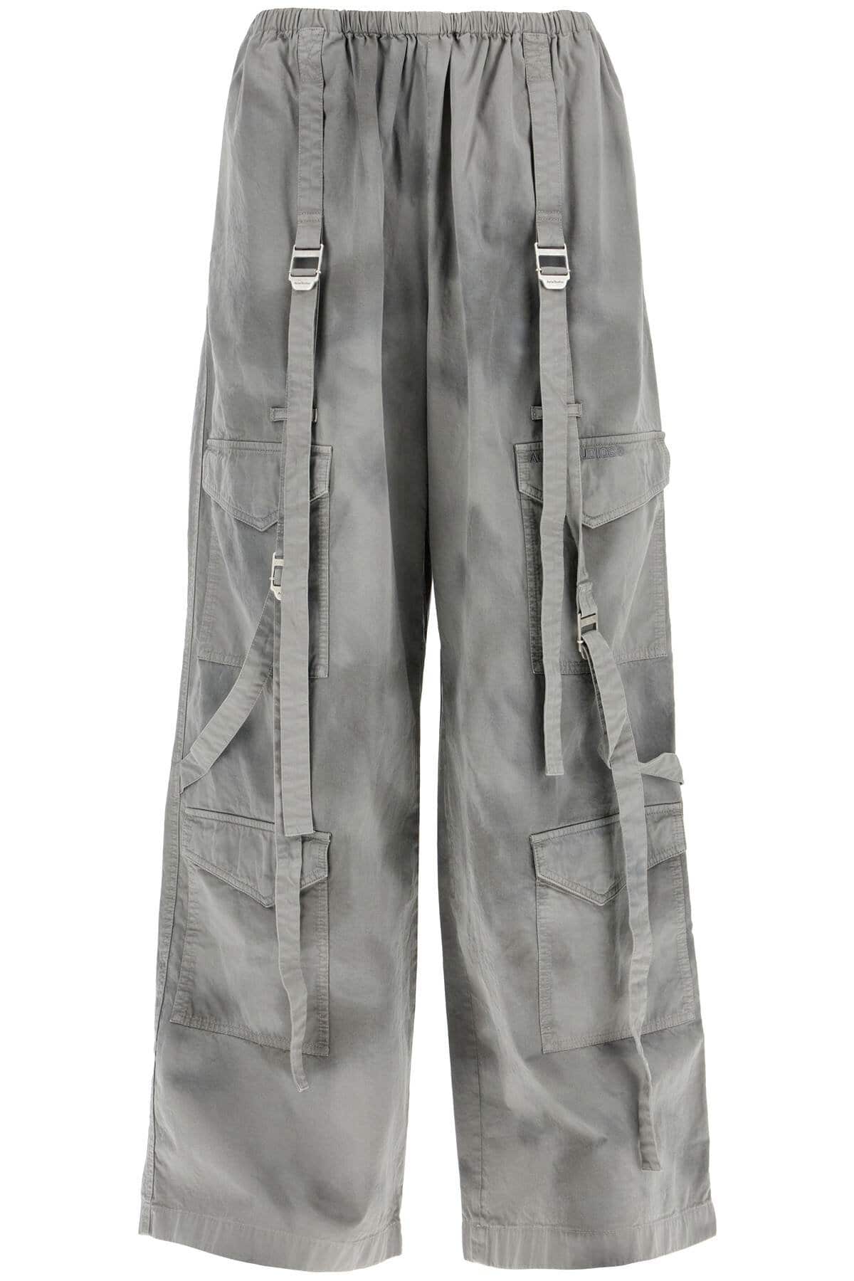 Acne Studios cargo pants made of cotton with dyed treatments, featuring classic functional pockets and adjustable straps on the front and back. Elasticated waistband with drawstring, tonal embroidered logo lettering on the left leg, and a relaxed fit with straight legs. The model is 187 cm tall and wears size IT 48.