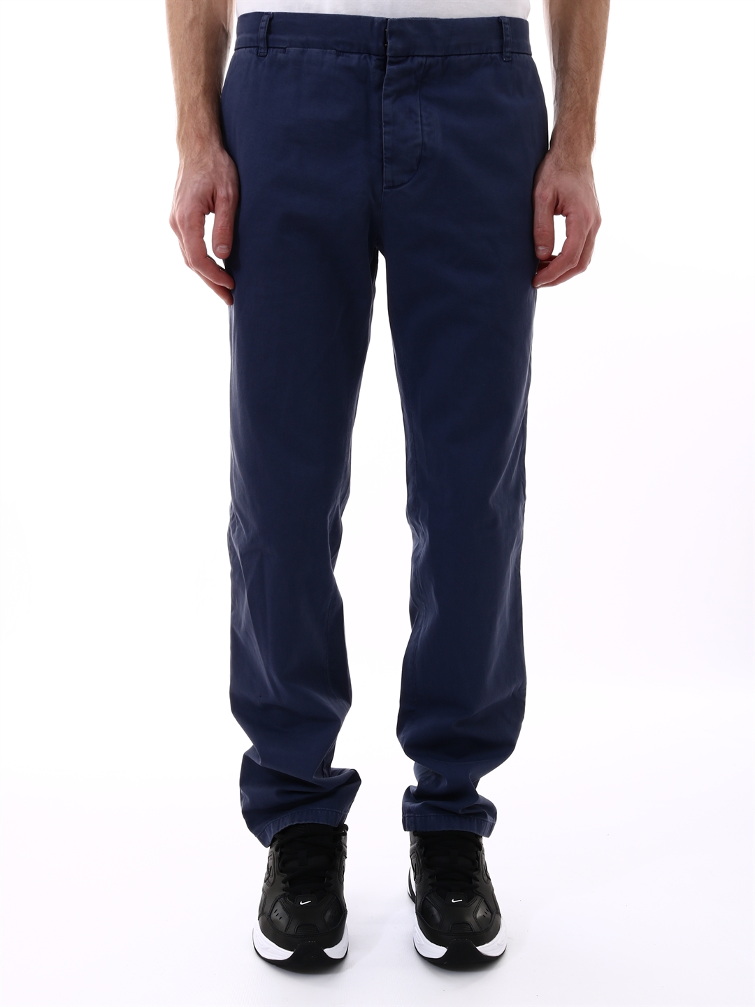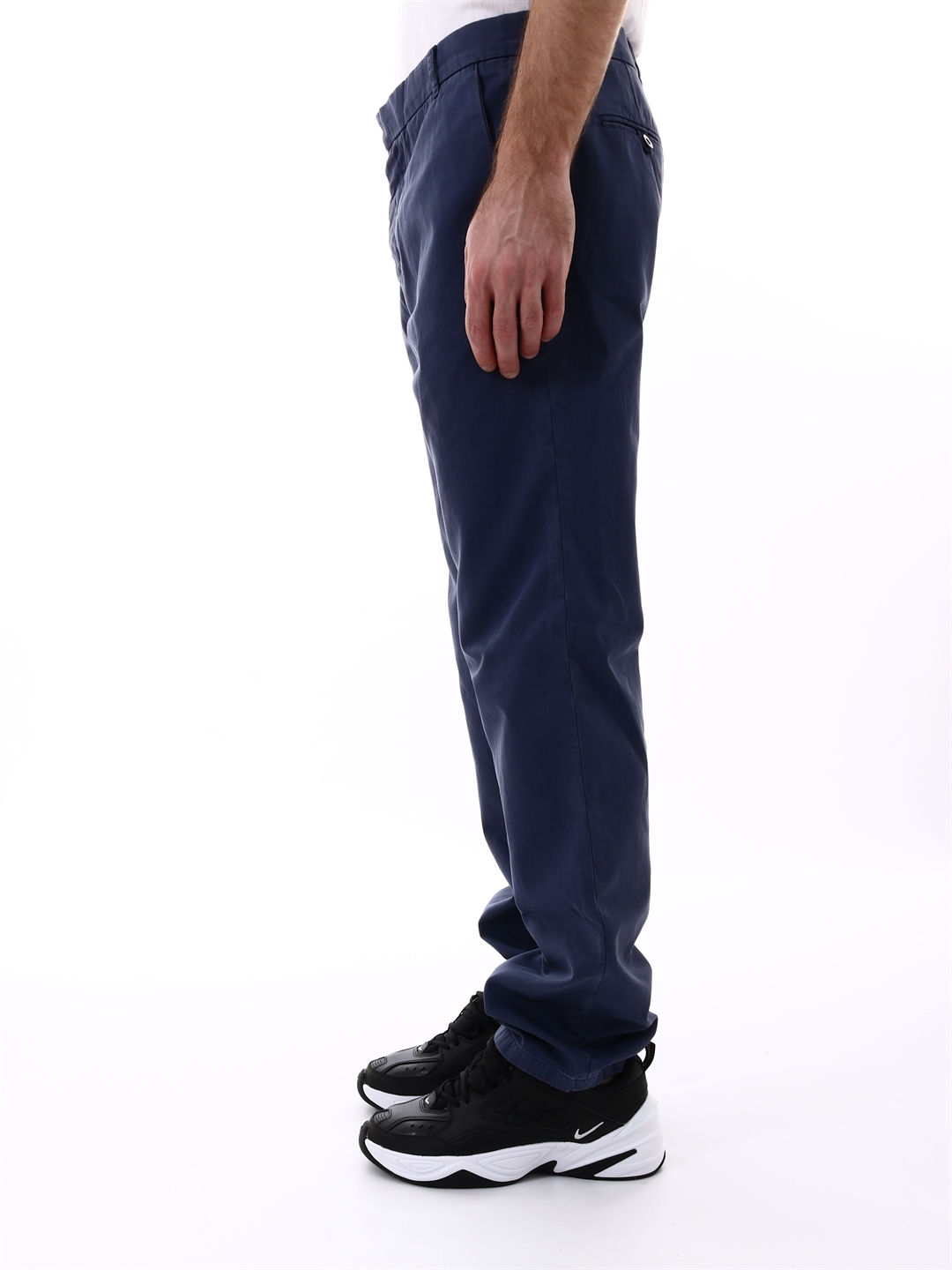Blue cotton trousers. They feature a hook-and-button closure, two side pockets, a hidden front pocket, two back buttoned pockets, and belt loops. Relaxed fit.