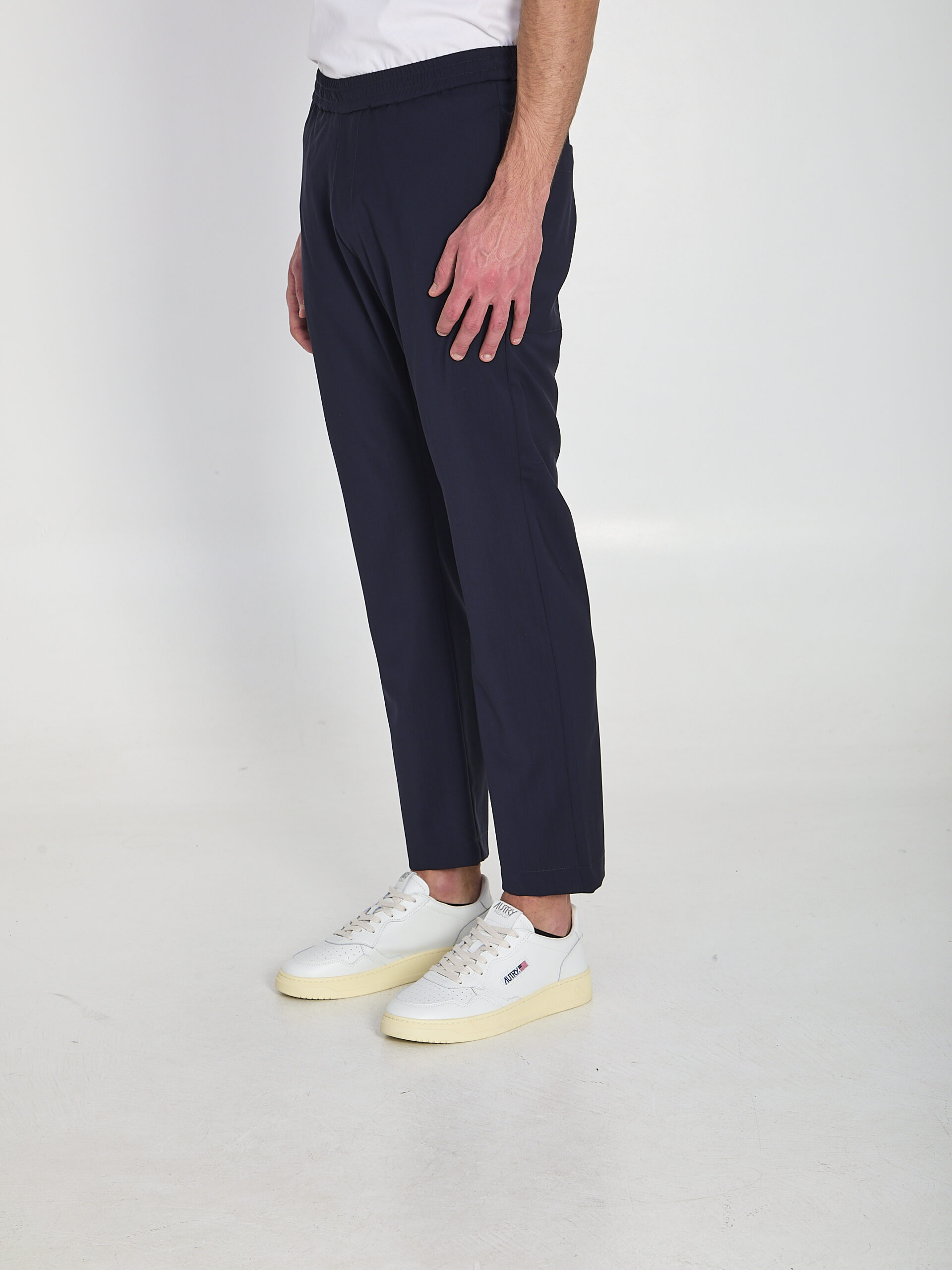 Navy blue lightweight virgin wool trousers. Feature an elasticized waist with a drawcord, two in-set side pockets, two patch back pockets, a low-rise waist, and a straight leg. Regular fit.