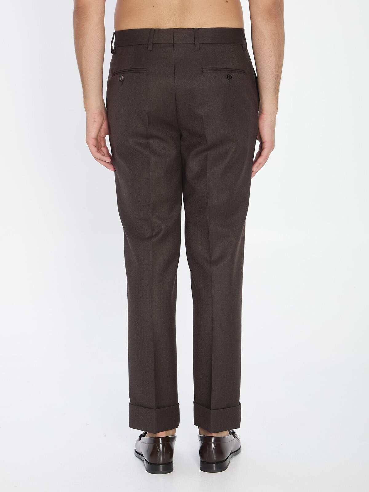 Tailored trousers in brown wool. They feature a zip, hook, and button closure, Equestrian Knight Design detail on the belt loop, two front inset pockets, two back welt pockets with button, and belt loops. Comfortable fit.