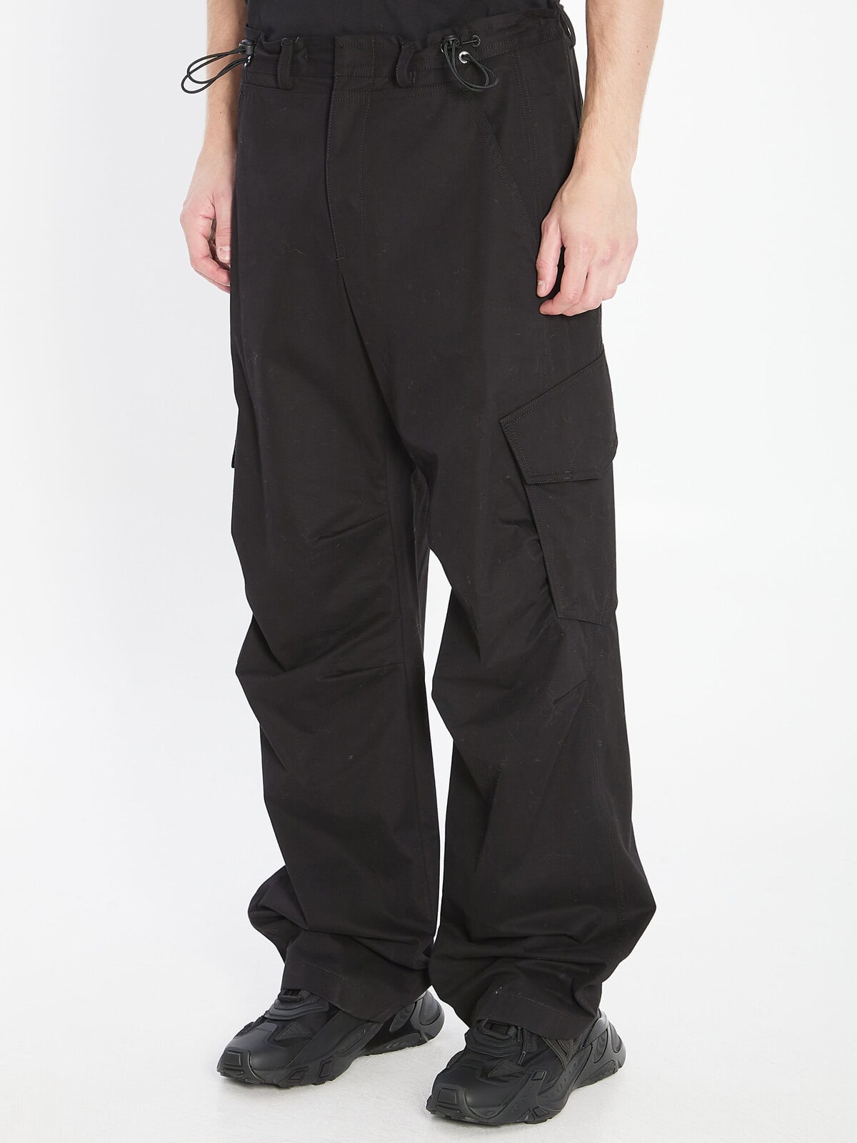 Black cotton trousers. Featuring a front zip and button closure, drawstring waist, five pockets, logo appliqué on the back, and wide-leg cut. Regular fit.