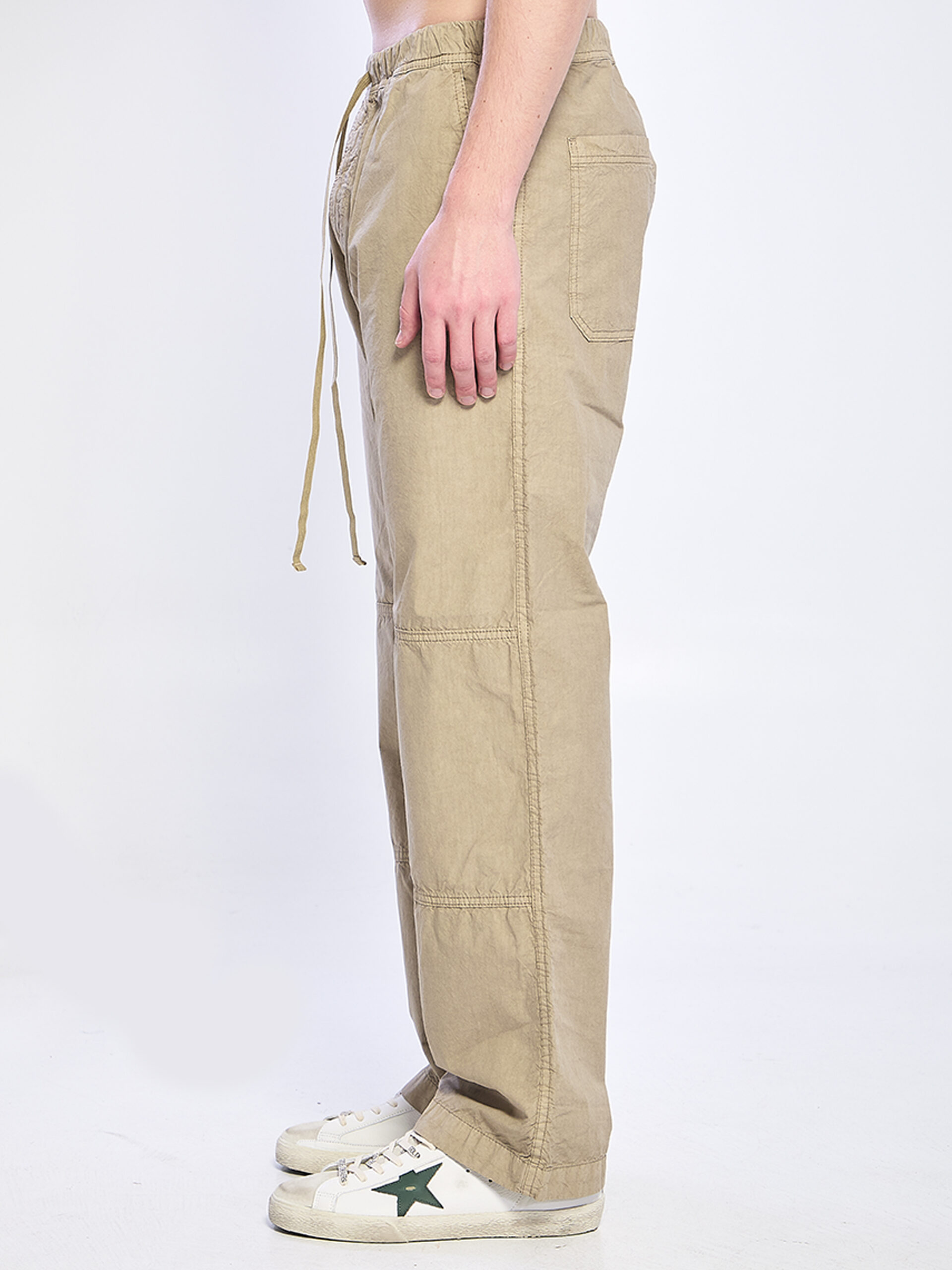 Beige cotton trousers. They feature a drawstring waist, a zip front closure, two side pockets, two patch pockets on the back, a leather logo on the back, a mid-rise waist, and a wide leg. Comfortable fit.
