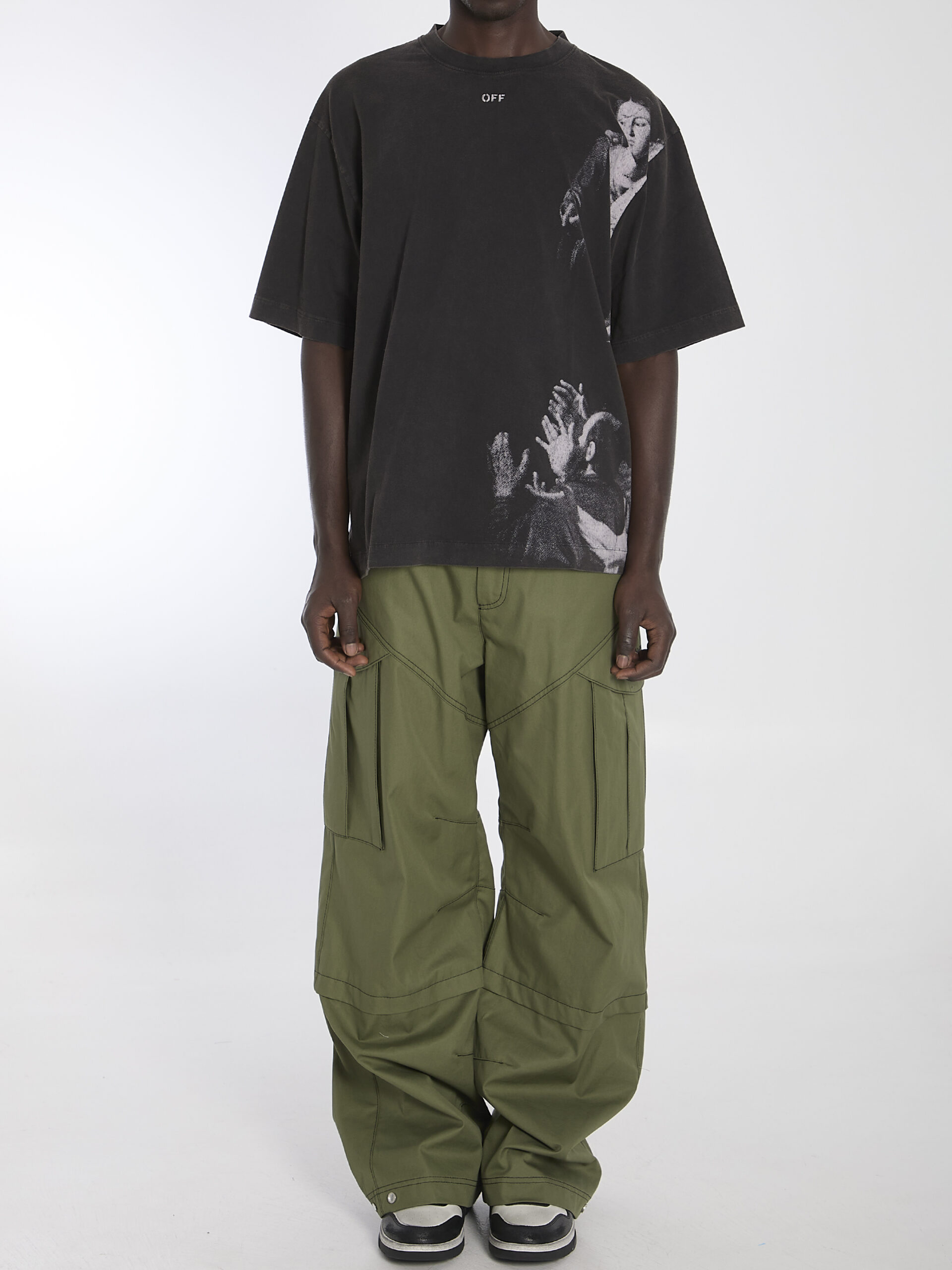 Straight-leg cargo pants in military green cotton with embroidered Off-White logo on left leg. It features zip and press-stud closure, two side pockets, two cargo pockets on legs, two rear patch pockets and belt loops. Regular fit.