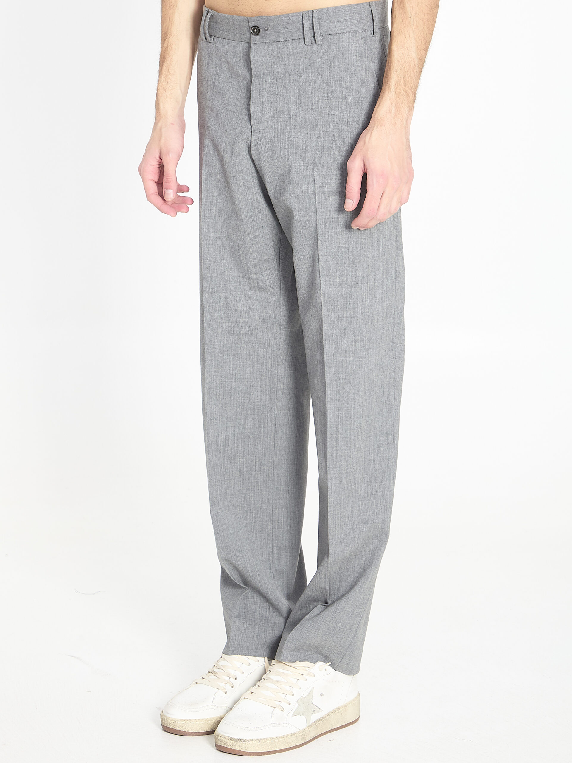 Gray stretch virgin wool trousers. They feature belt loops, button closure, two side pockets, one flap pocket with a button, and one welt pocket with a button at the back, mid-rise waist, straight leg. Slim fit.