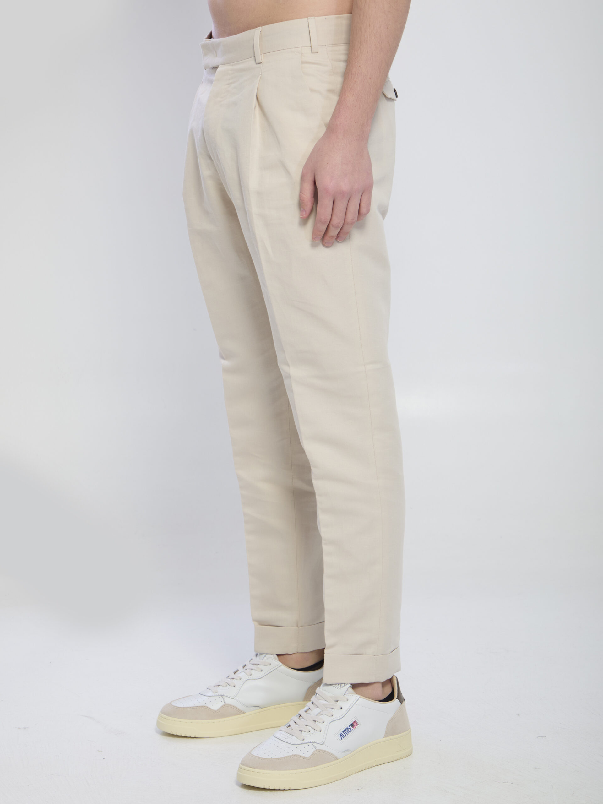 Cream-colored linen and cotton trousers. They feature belt loops, a zip closure with hook and button, pleats at the waist, two side pockets, two back pockets with flap and button, pressed creases on the front and back, cuffs at the hem, mid-rise waist, and straight-leg fit. Regular fit.