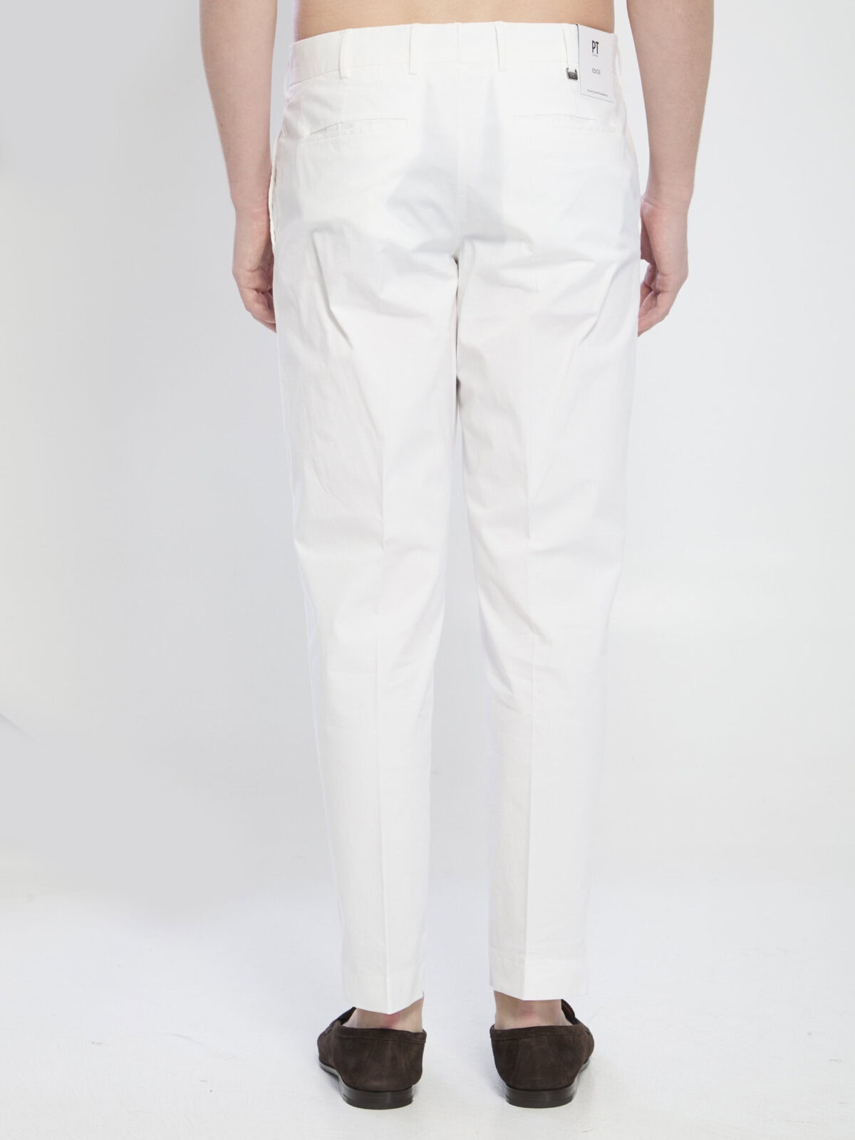 White stretch cotton trousers. They feature belt loops, a zip, hook and button closure, two side pockets, two rear welt pockets, pressed front and back creases, a mid-rise waist, and a straight leg. Regular fit.