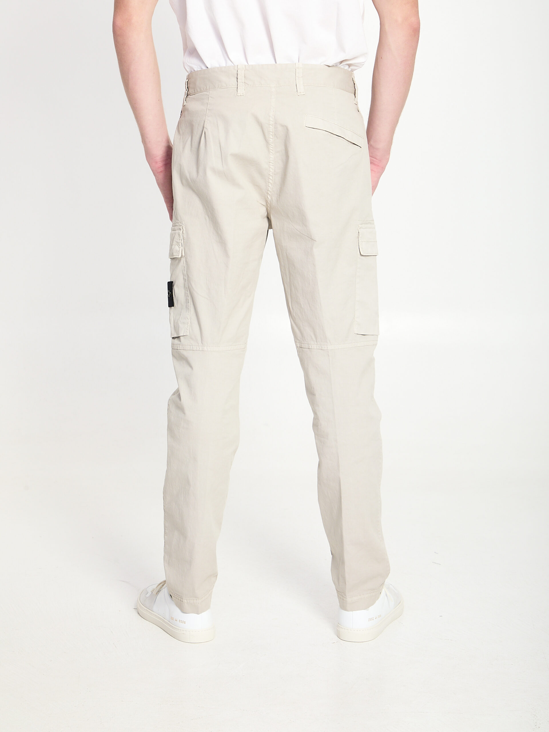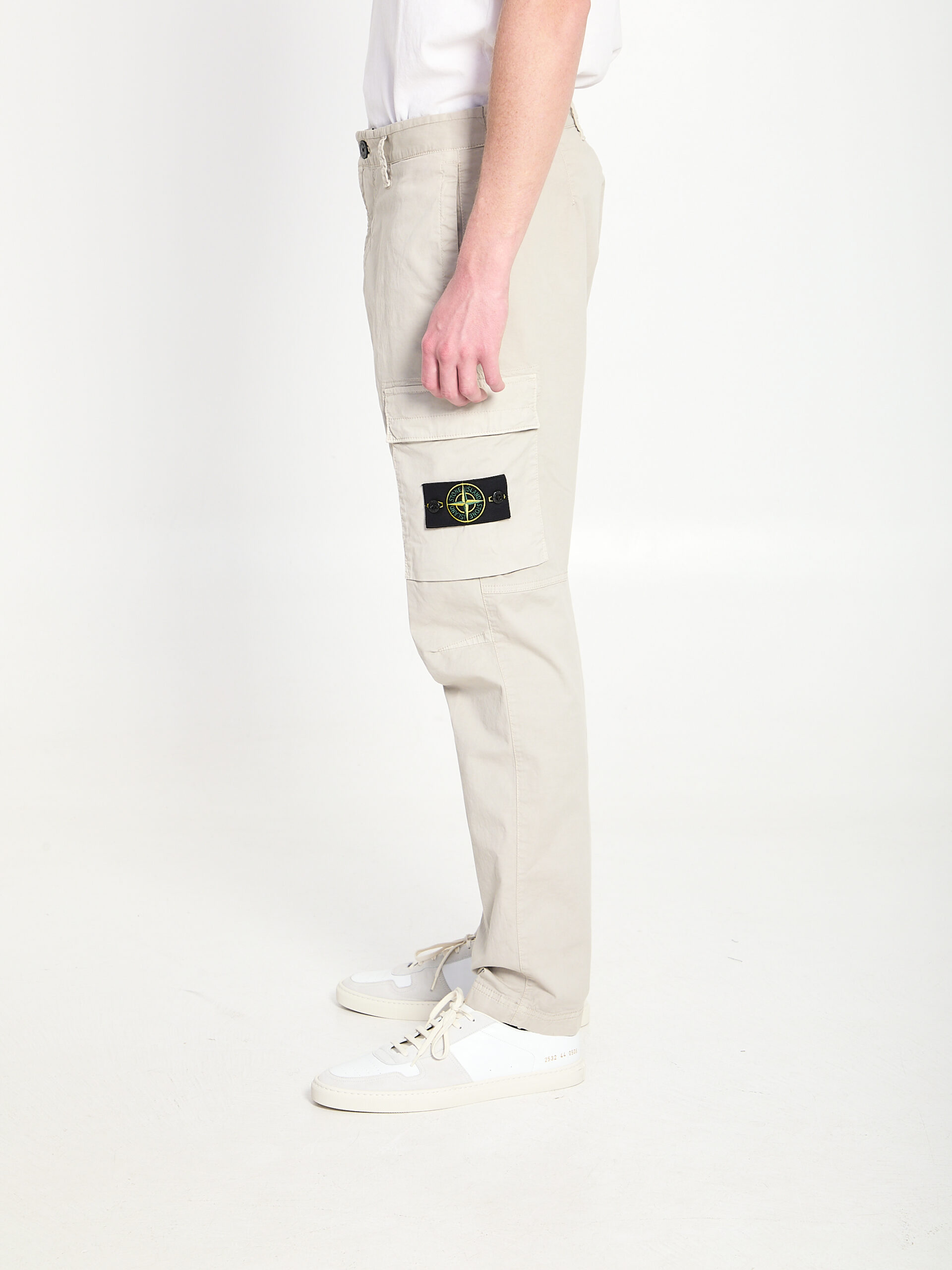 Light grey stretch cotton twill cargo pants. They feature belt loops, a zip and button fly, two front pockets, two button-flap cargo pockets, a buttoned back pocket, shaped knees, a mid-rise waist, and a straight leg. Regular fit.